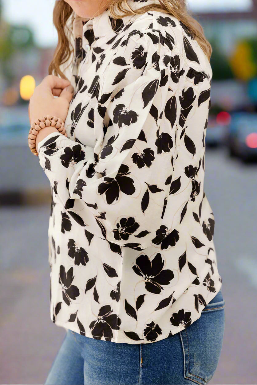 A classic button up blouse with a fun print and balloon sleeves! We suggest pairing with a bold-colored pair of our Betsey’s Jeggings or Betsey’s Exclusive Shorts or tucked into a patterned high-waisted skirt or shorts and don’t forget that statement necklace for a complete Betsey’s look! The lightweight material allows you to wear this all year round and this can easily be layered with a cardigan, blazer, or jacket!