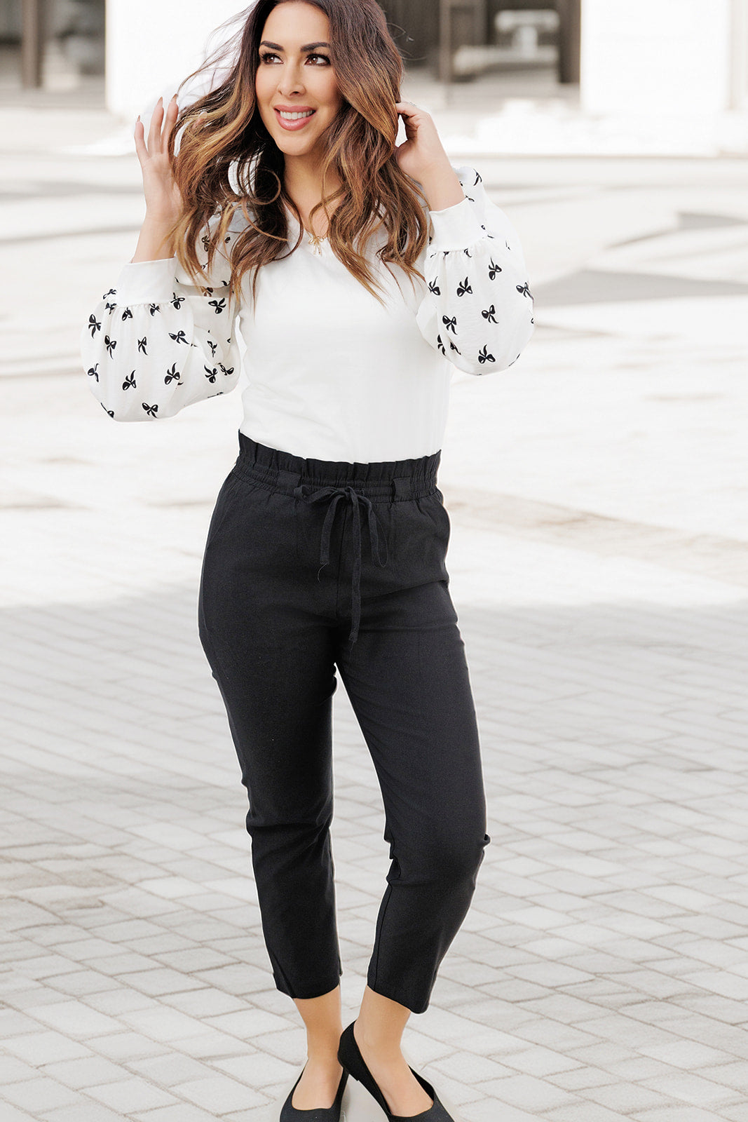 How cute is this blouse? With bow printed relaxed sleeves and a solid body, this is a piece that you can dress up or down, depending on what you want! Pair with a skirt, your favorite denim, joggers, or a bold-colored pair of our Betsey's Jeggings! Don't forget your favorite accessories to make the look truly yours!