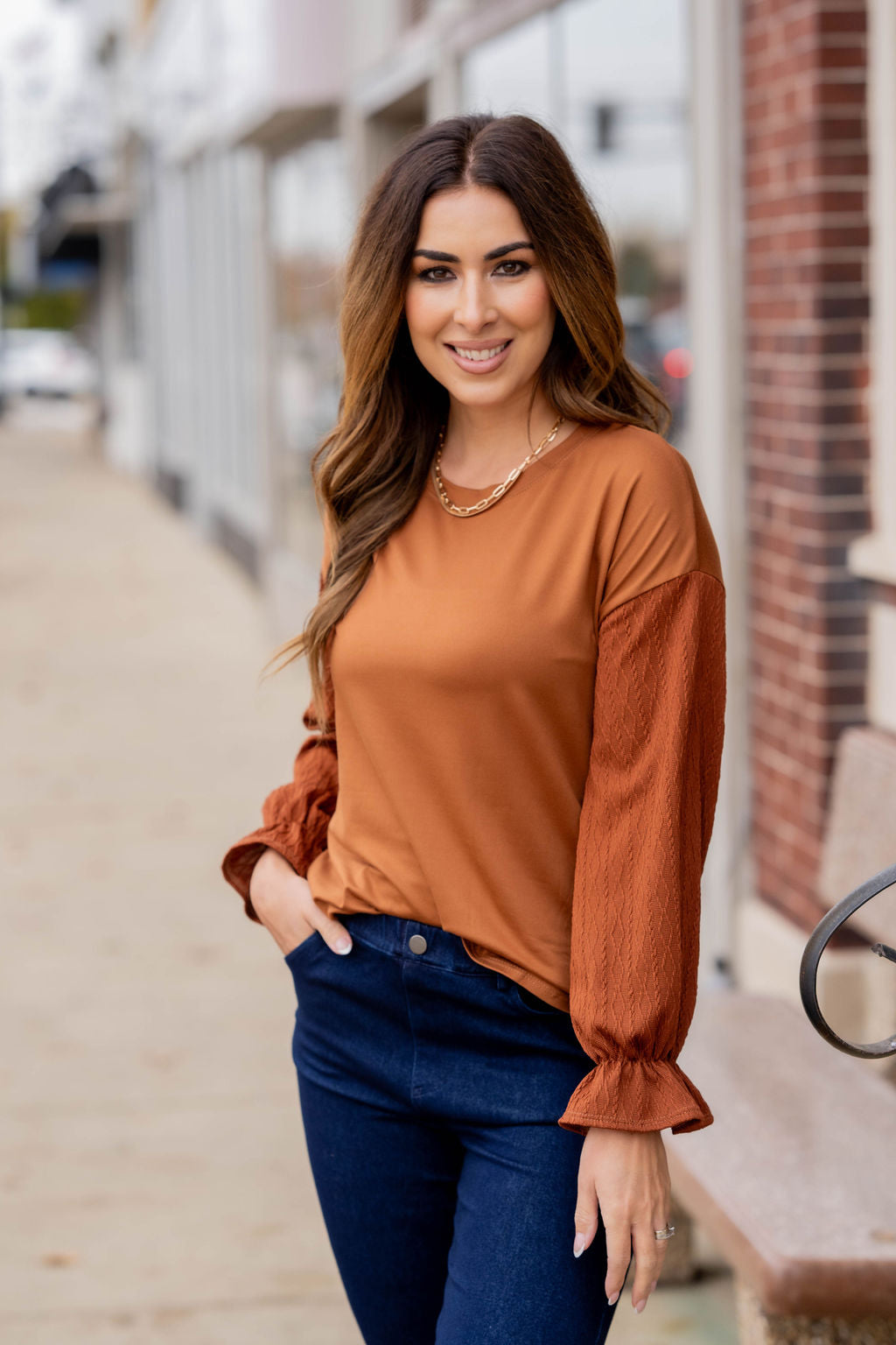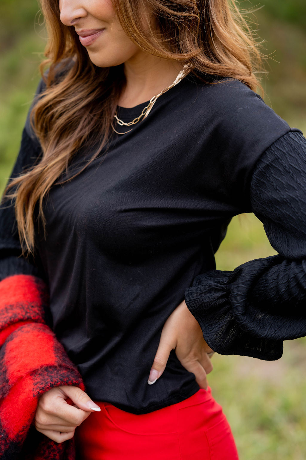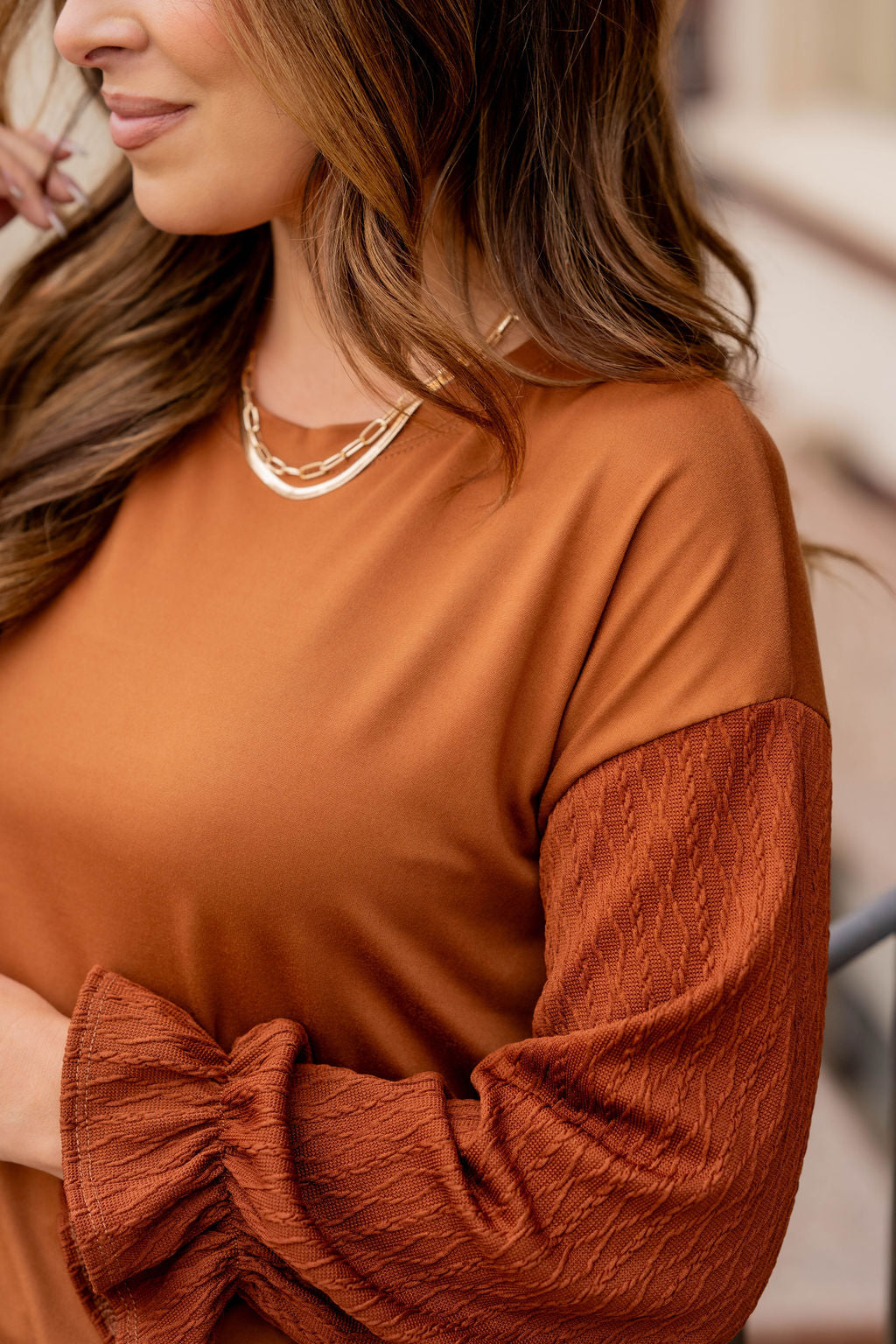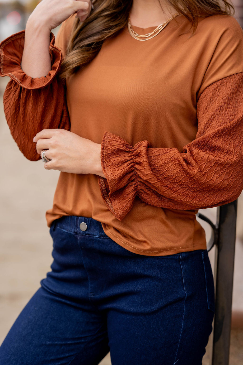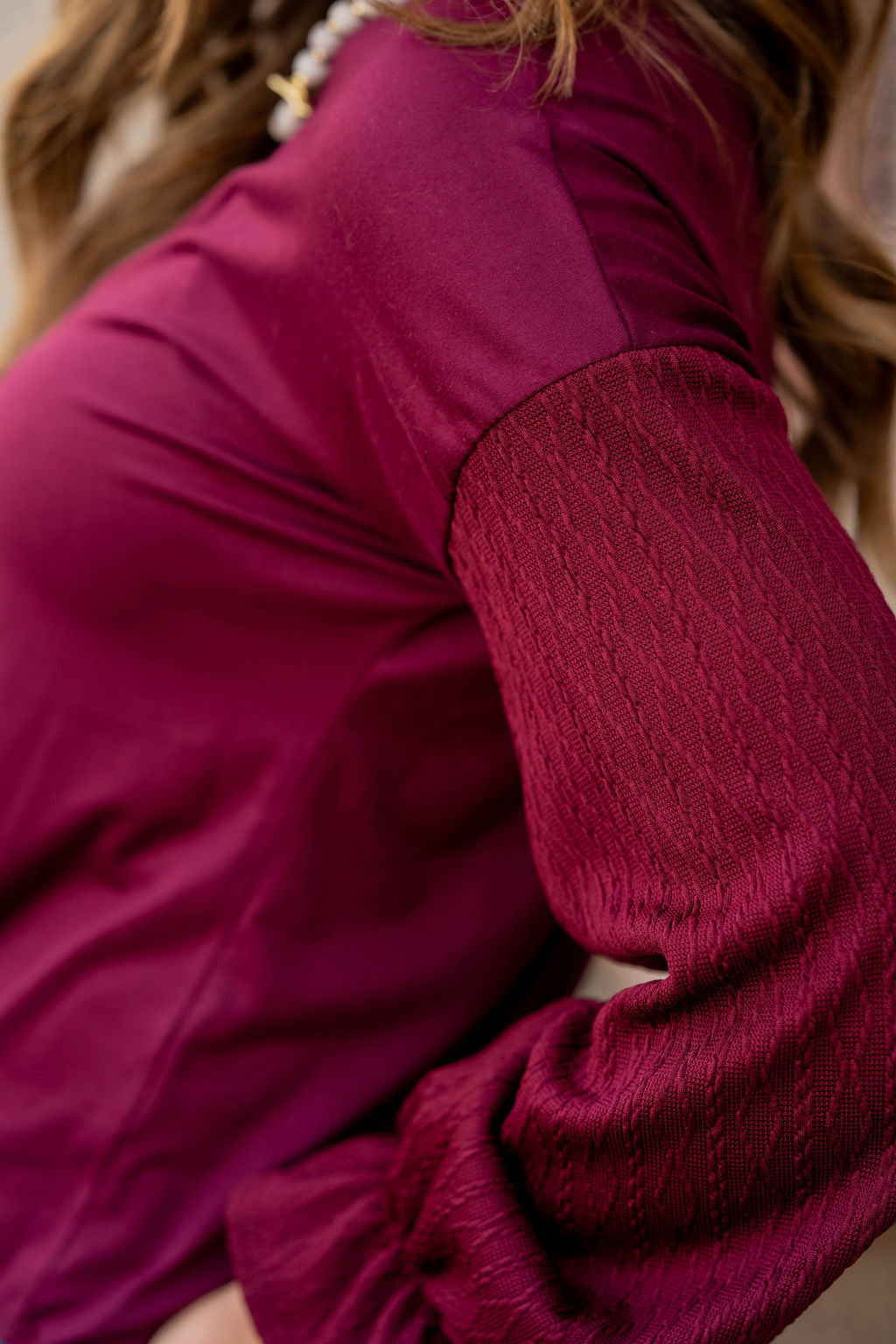 How cute is this blouse? With the braided texture statement sleeves and the solid body, this is a piece that you can dress up or down, depending on what you want! The cinched detailing on the sleeves elevates this top. It also looks great with a cardigan, vest, blazer, or jacket over it!