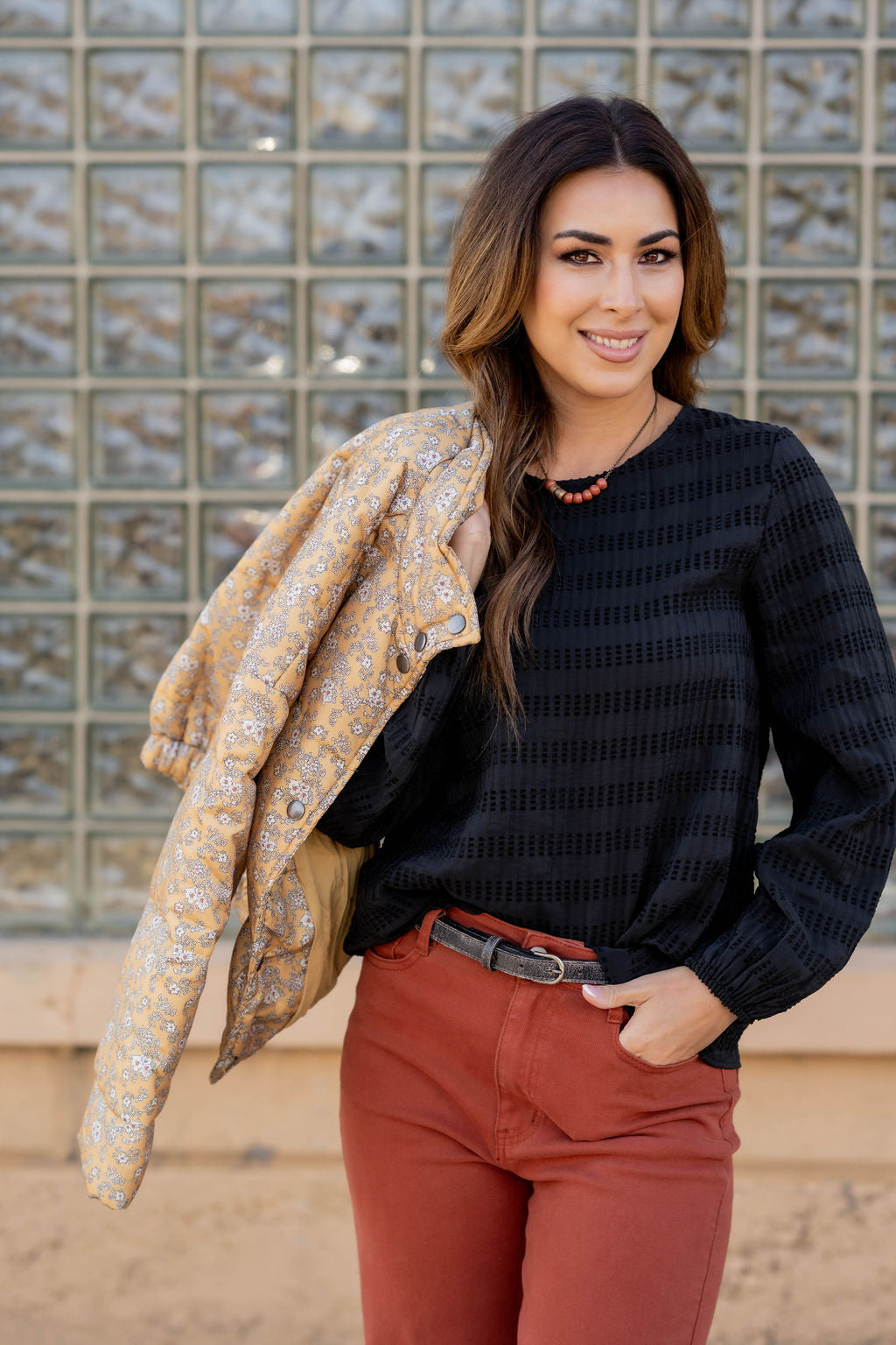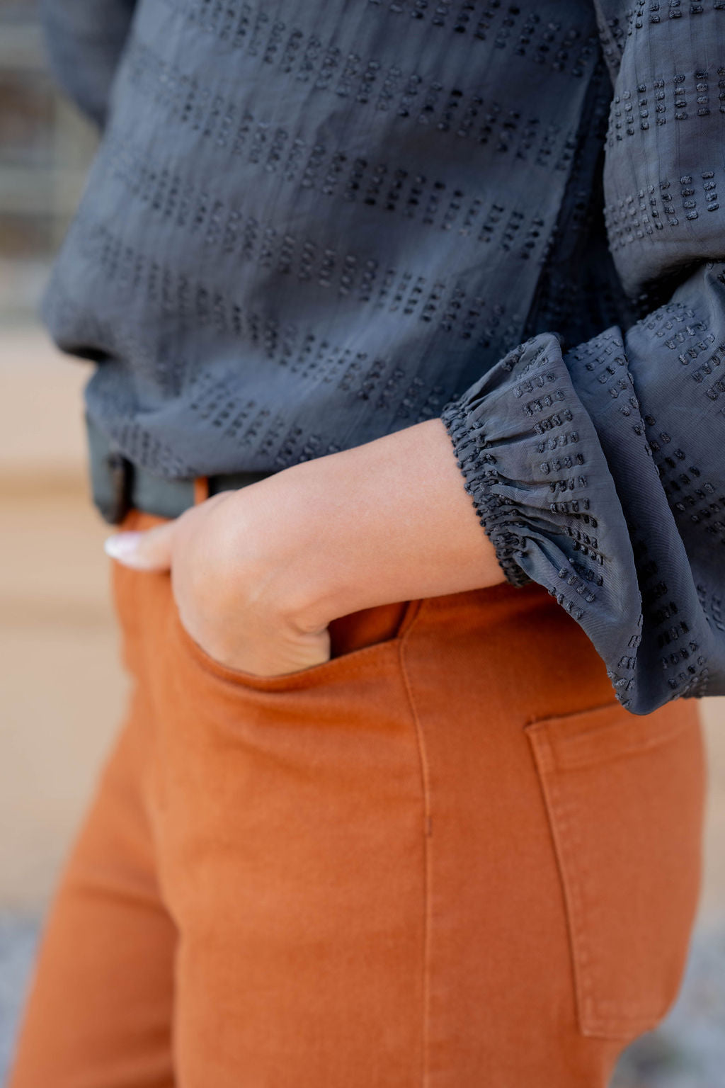How cute is this blouse? With sewn dashed pattern and the cinched sleeves, this is a piece that you can dress up or down, depending on what you want! It also looks great with a cardigan, shacket, or vest over it!