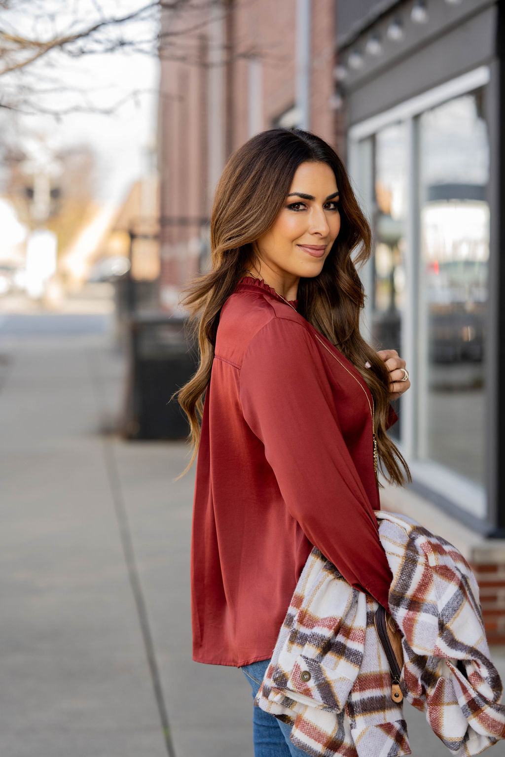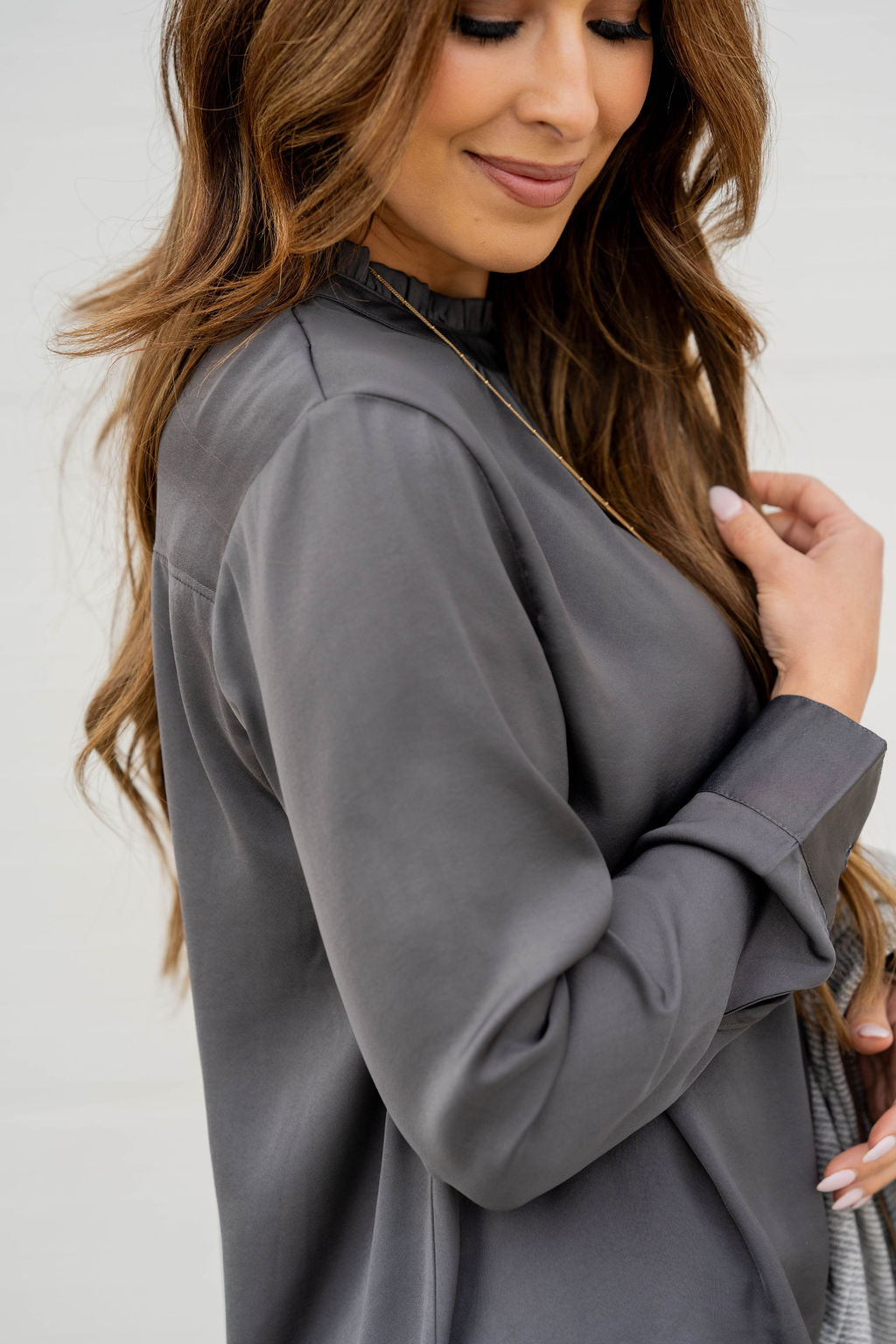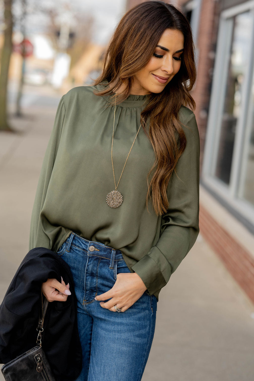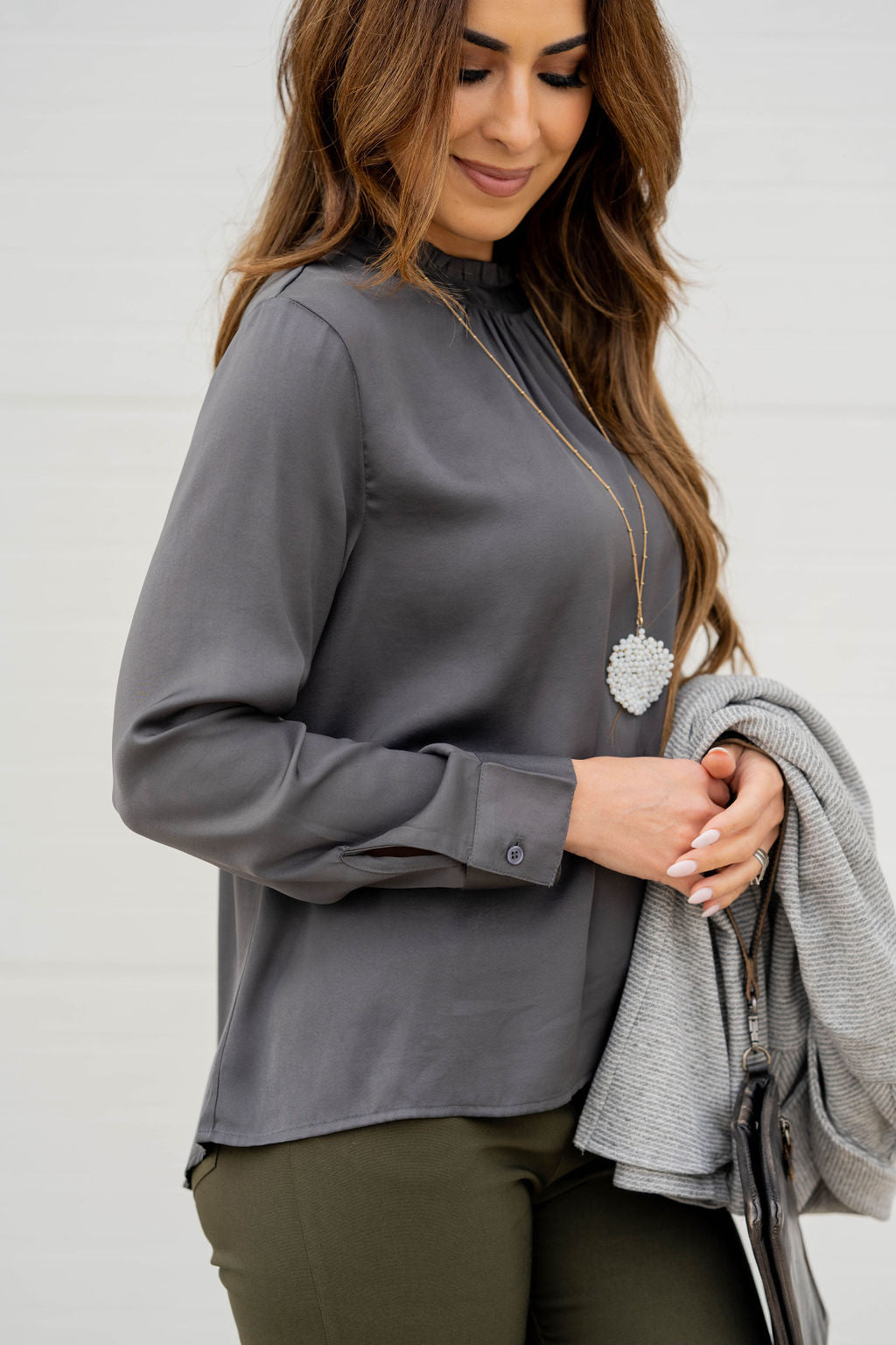 This blouse is perfect for date night, work or any social event! The cinched neckline and the button accented wrists make for such a sophisticated look! Pair with jeans, a skirt, joggers, or our Betsey's Jeggings for a casual, styled look.