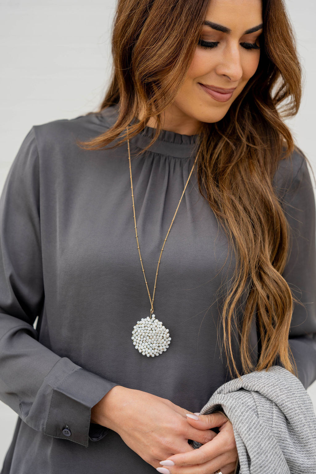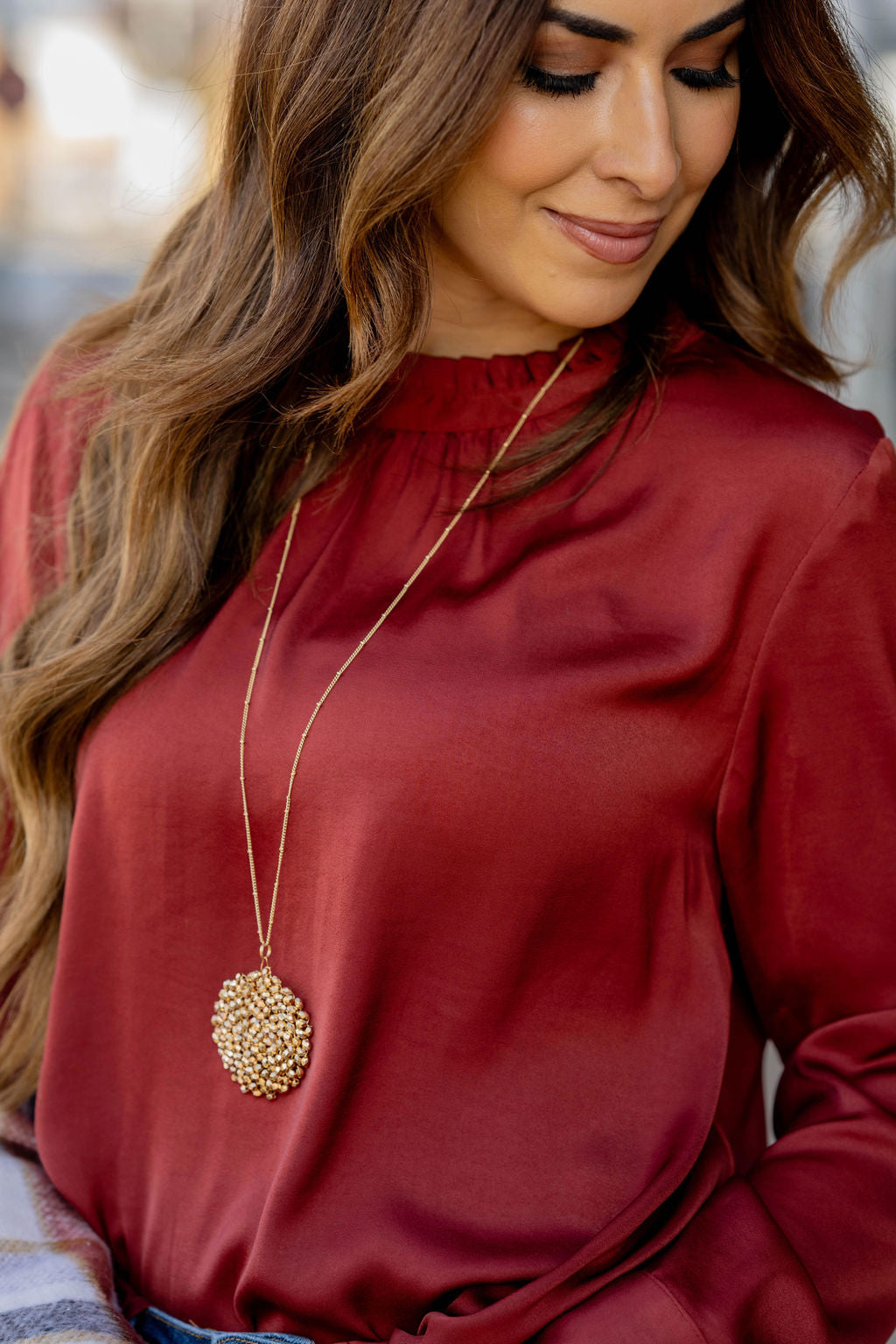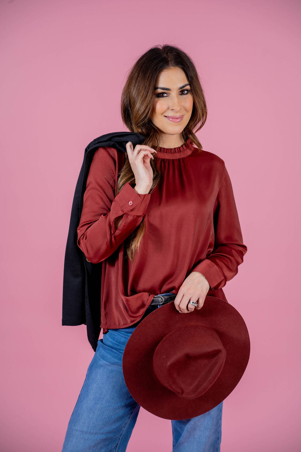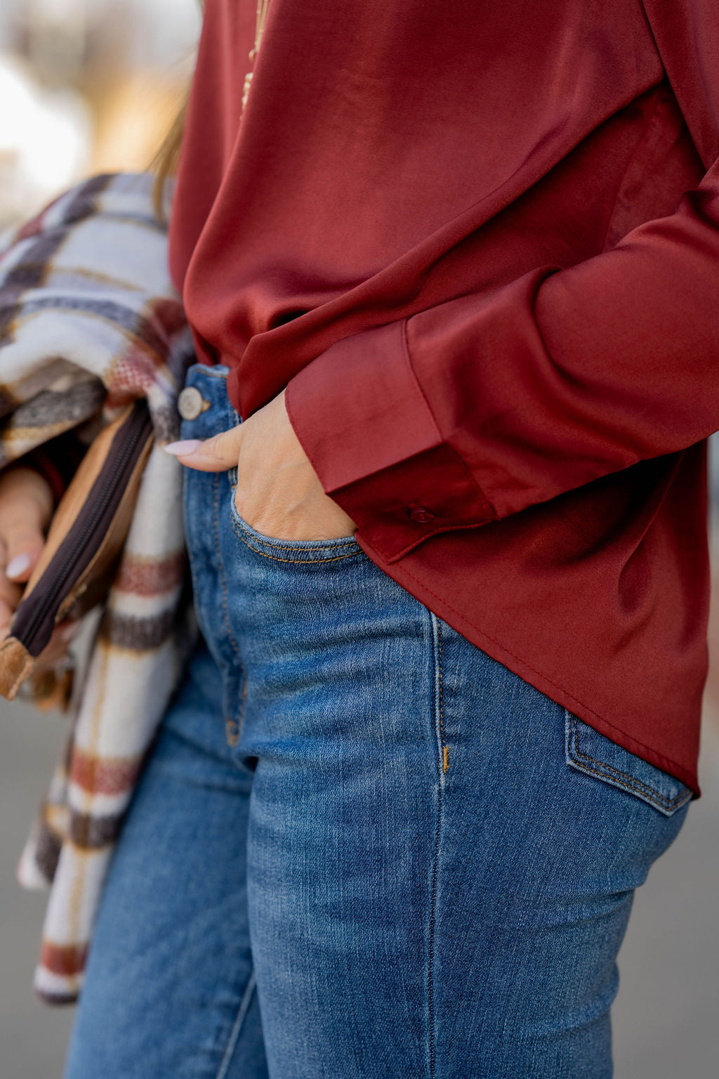 This blouse is perfect for date night, work or any social event! The cinched neckline and the button accented wrists make for such a sophisticated look! Pair with jeans, a skirt, joggers, or our Betsey's Jeggings for a casual, styled look.