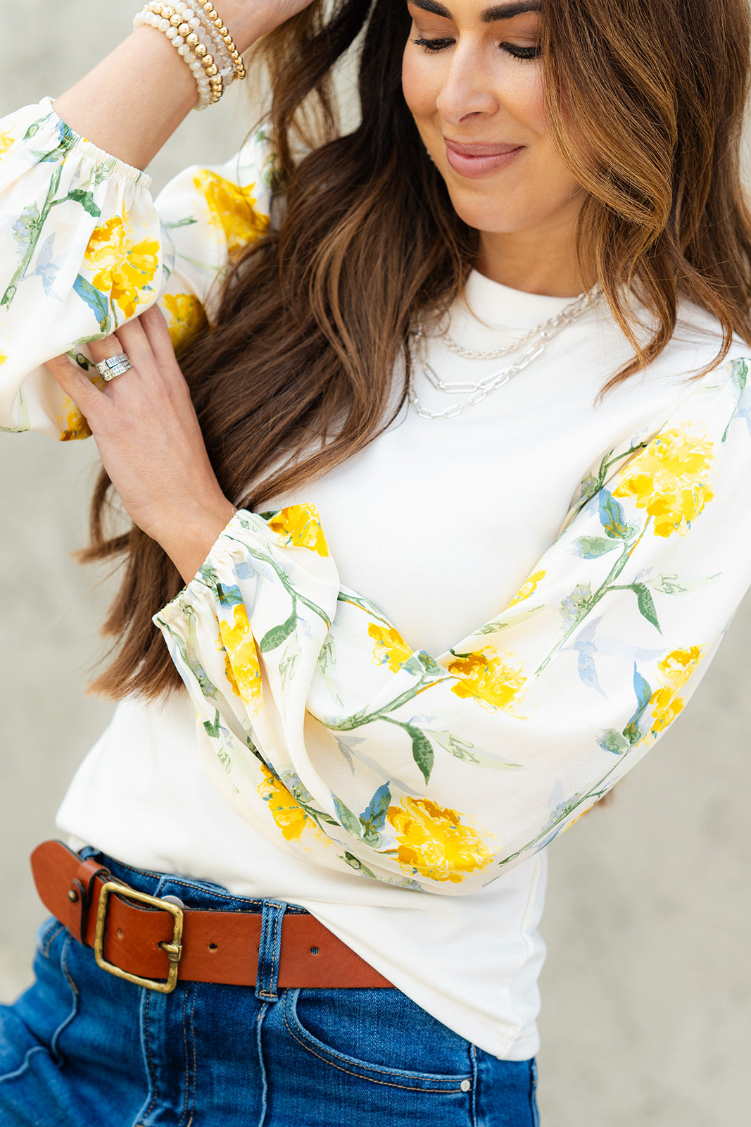 How cute is this blouse? With the stunning floral print sleeves and the solid body, this is a piece that you can dress up or down, depending on what you want! The cinched detailing on the sleeves and bold colors elevate this top. It also looks great with a cardigan, vest, blazer, or jacket over it!
