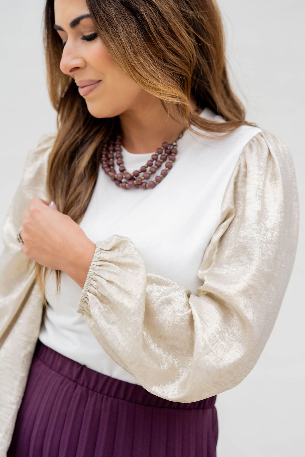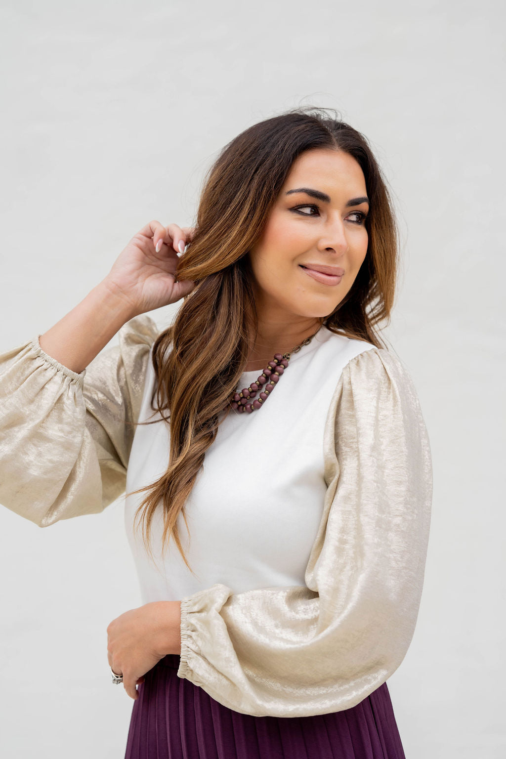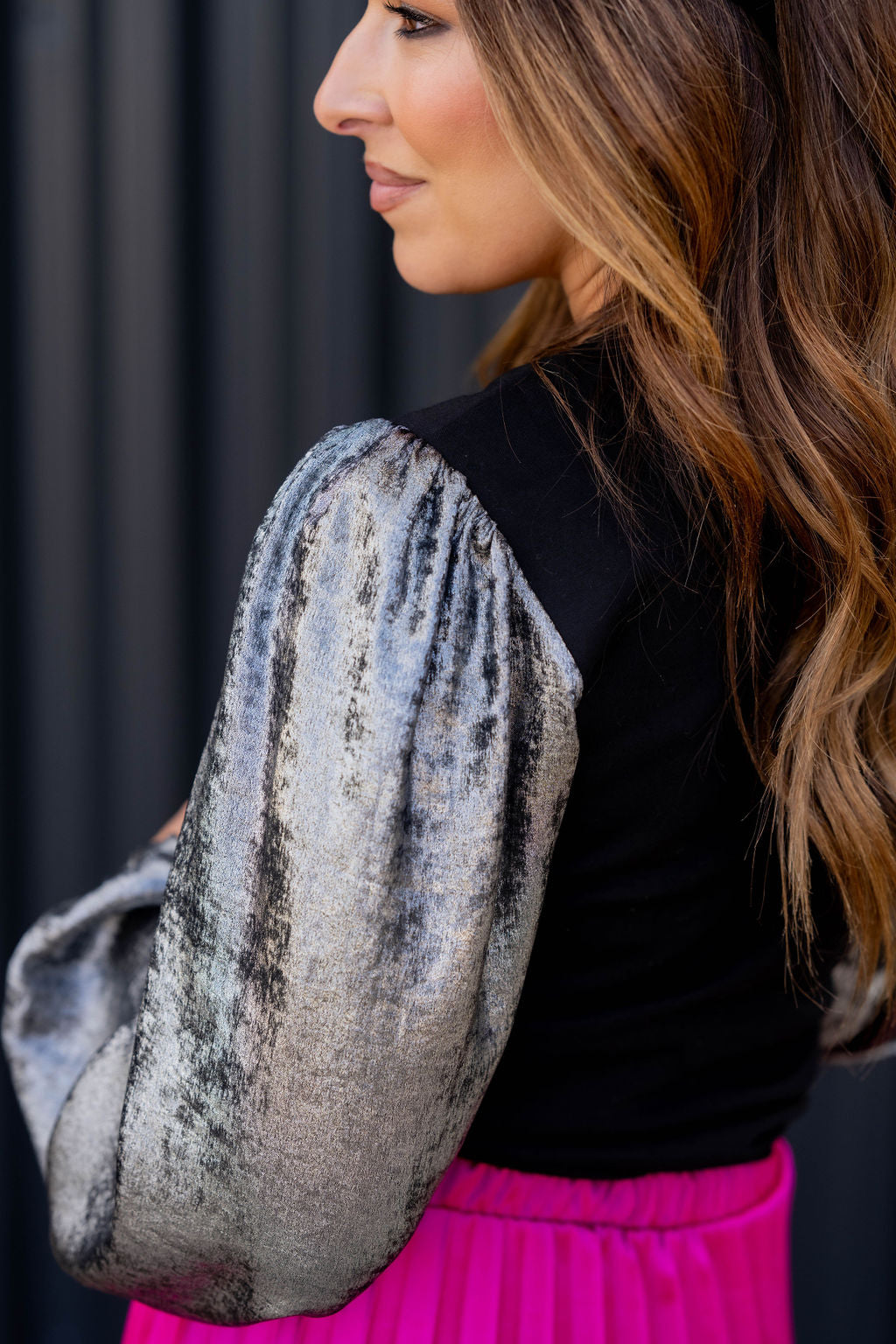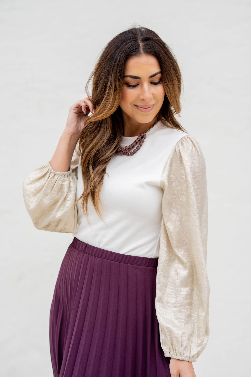 How cute is this blouse? With metallic sleeves and a solid body, this is a piece that you can dress up or down, depending on what you want! We love the comfort of a tee and the look of a blouse within this piece. The cinched detailing on the sleeves elevates this top. It also looks great with a cardigan, vest, blazer, or jacket over it!