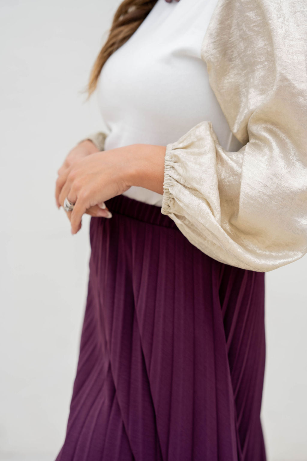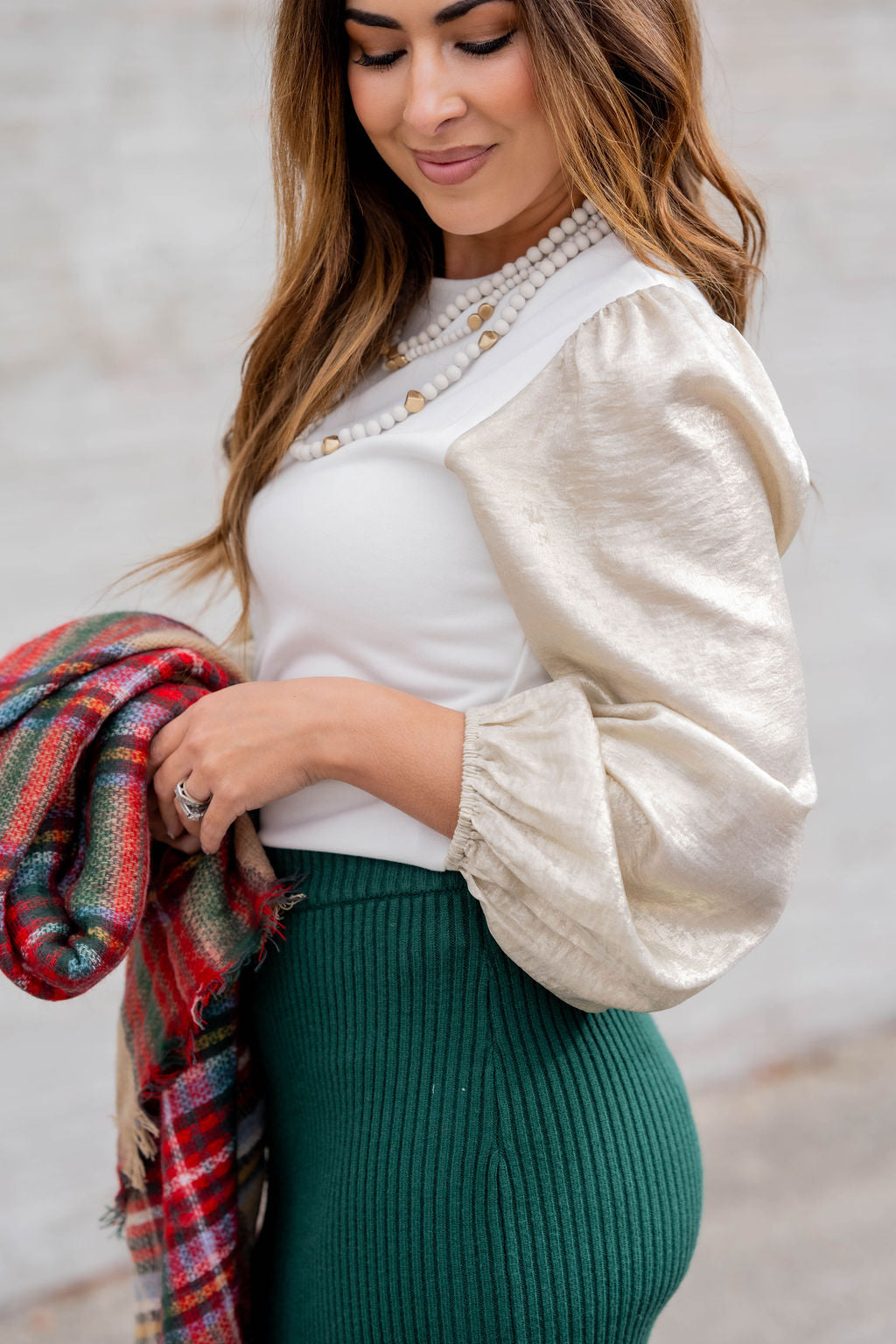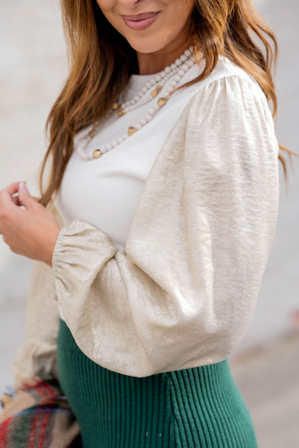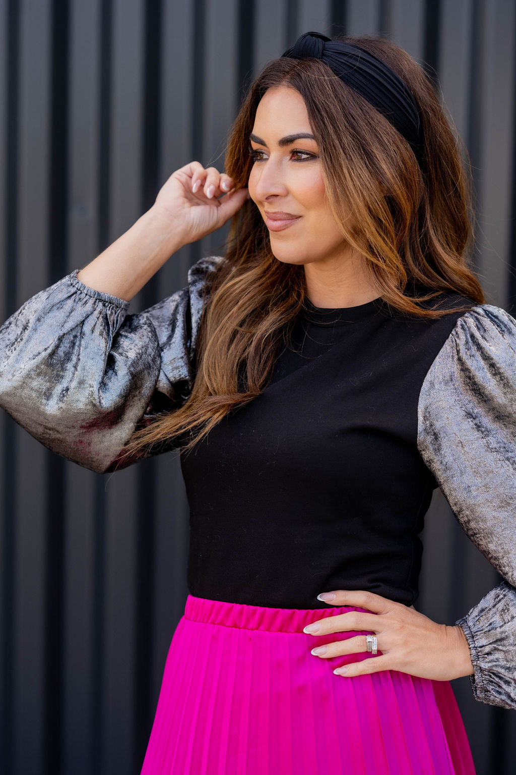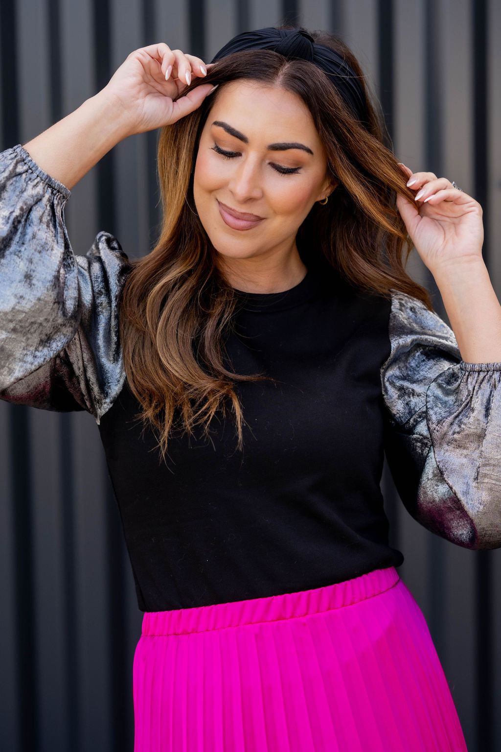 How cute is this blouse? With metallic sleeves and a solid body, this is a piece that you can dress up or down, depending on what you want! We love the comfort of a tee and the look of a blouse within this piece. The cinched detailing on the sleeves elevates this top. It also looks great with a cardigan, vest, blazer, or jacket over it!