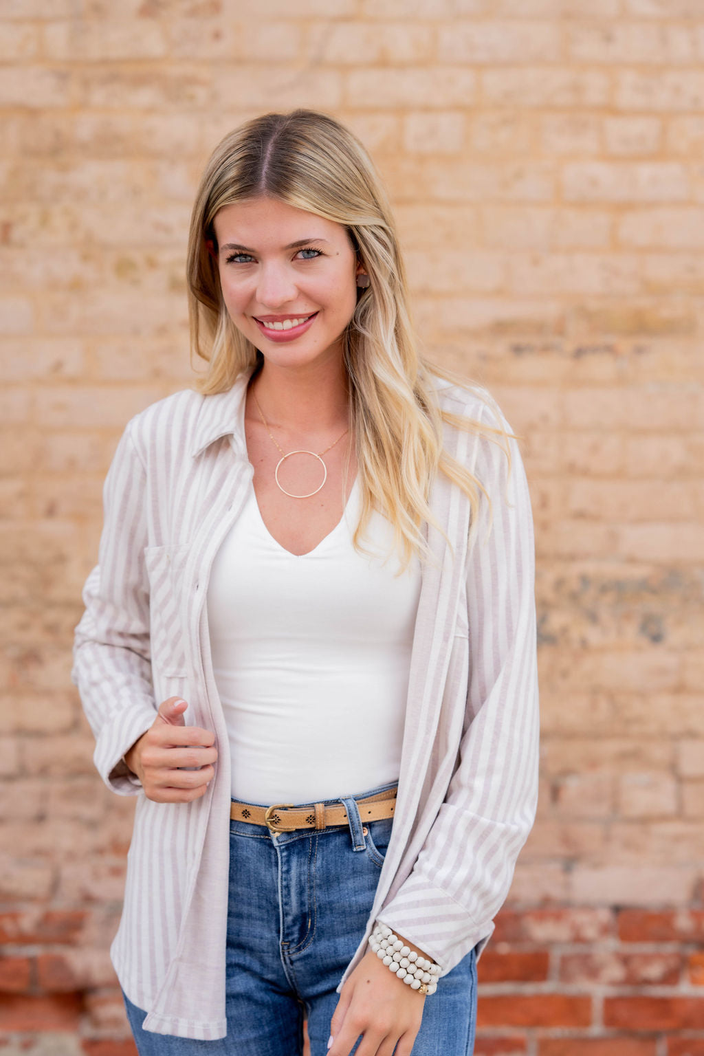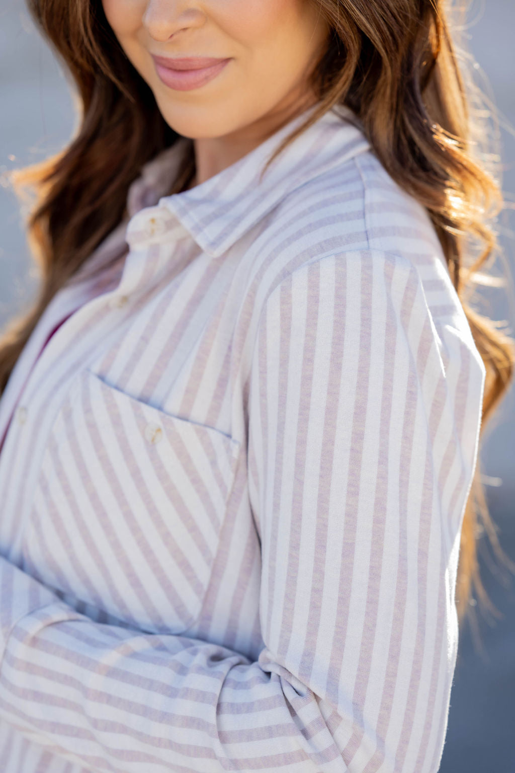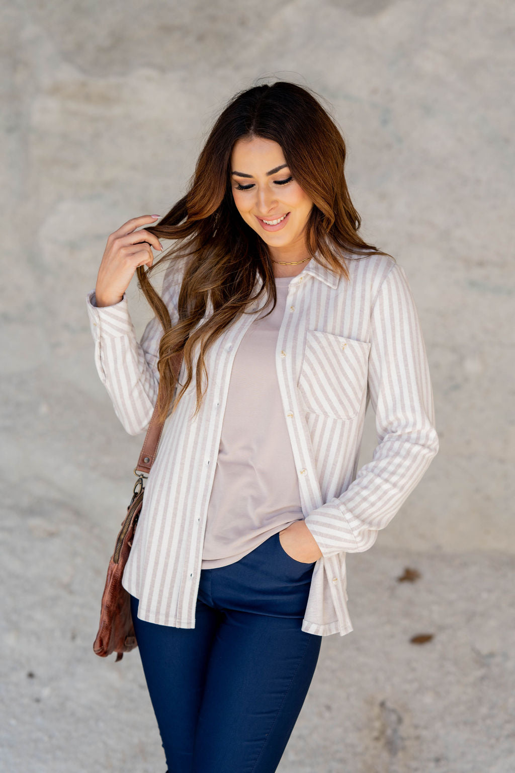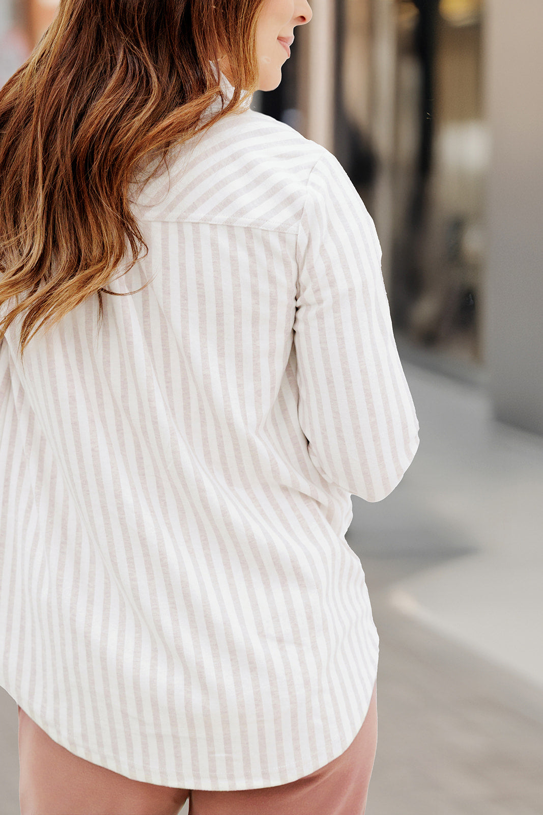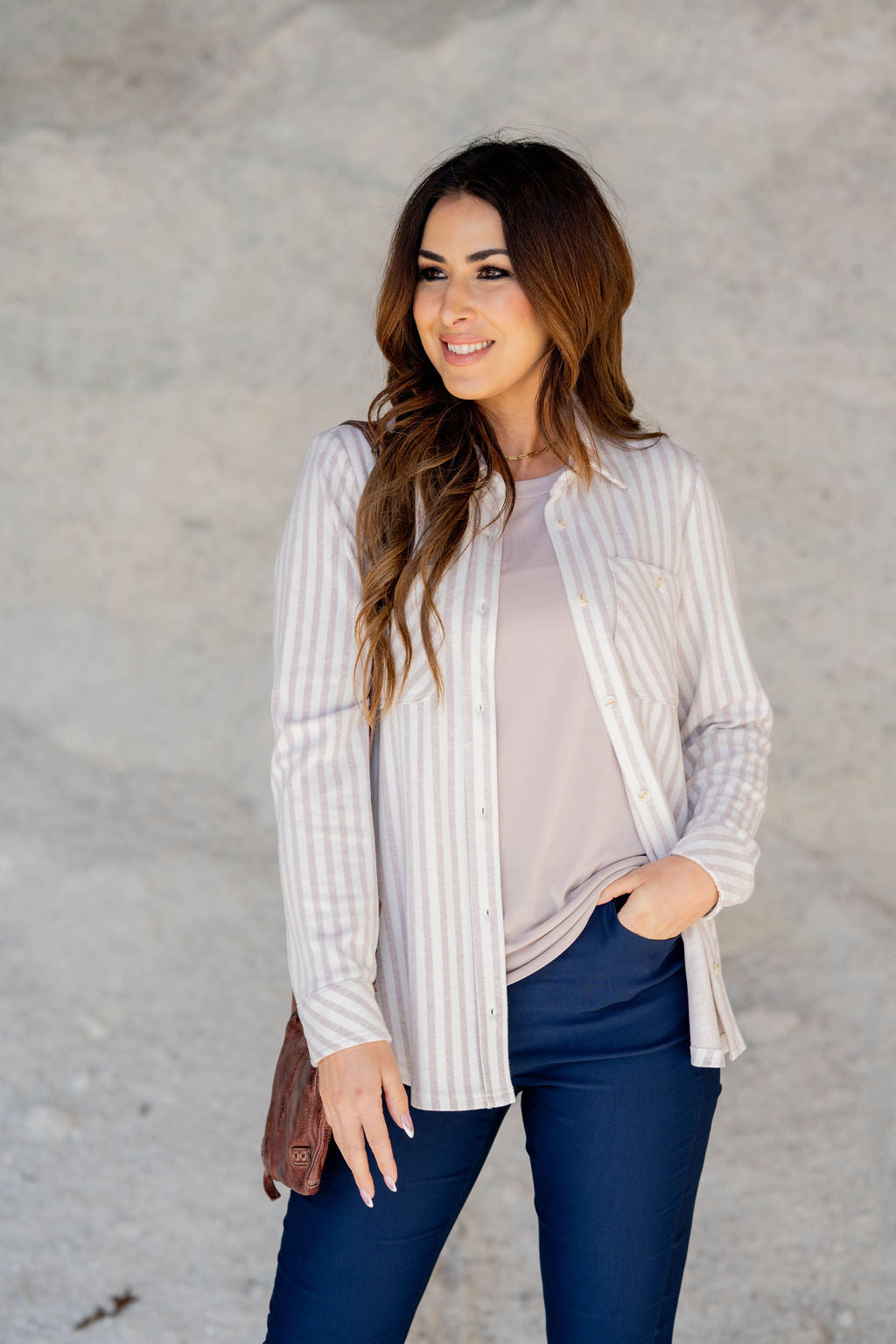 Simple and elegant describes this blouse perfectly. Button-up blouses are a classic, timeless piece. We love the mix of stripes and the lightweight material making this ideal for every season. Wear button up or leave this open over a basic or graphic tee!