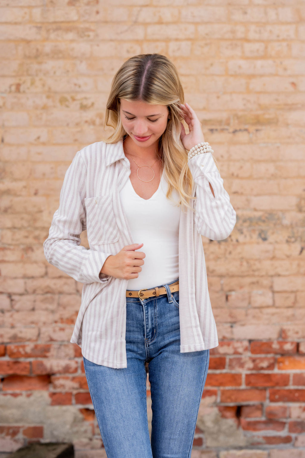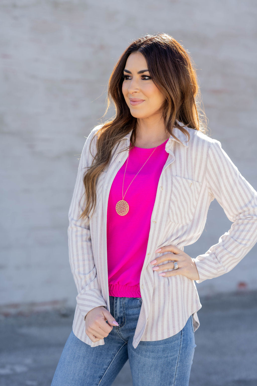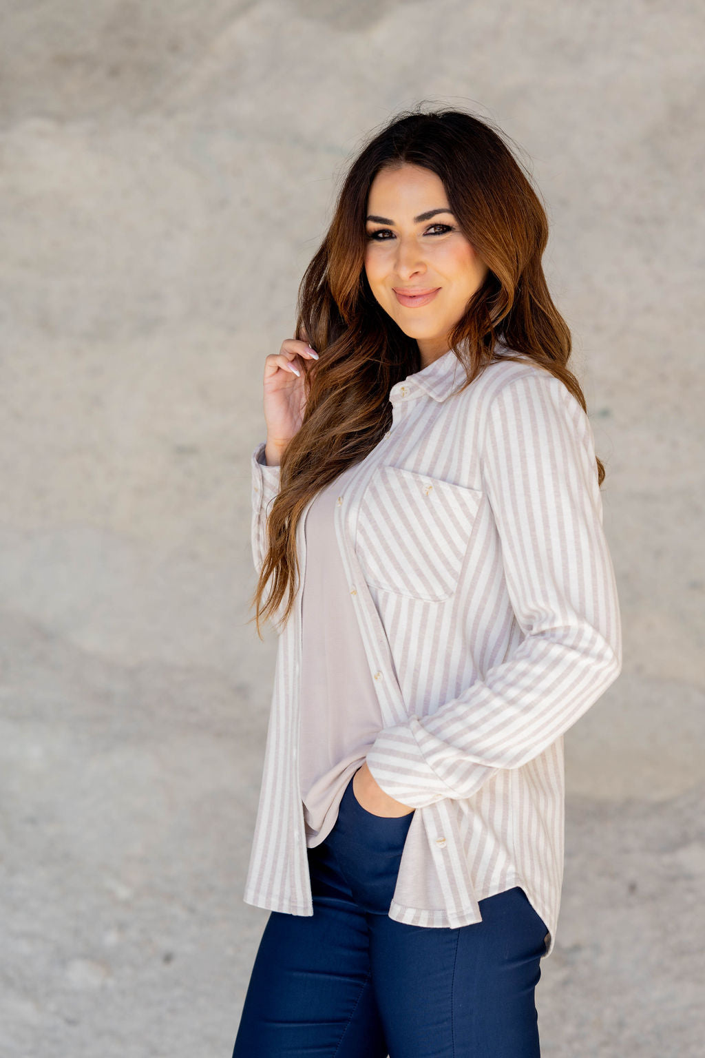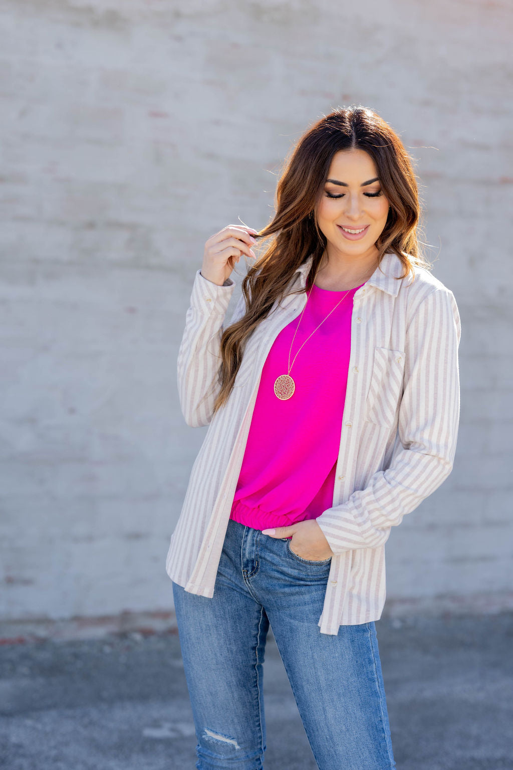 Simple and elegant describes this blouse perfectly. Button-up blouses are a classic, timeless piece. We love the mix of stripes and the lightweight material making this ideal for every season. Wear button up or leave this open over a basic or graphic tee!