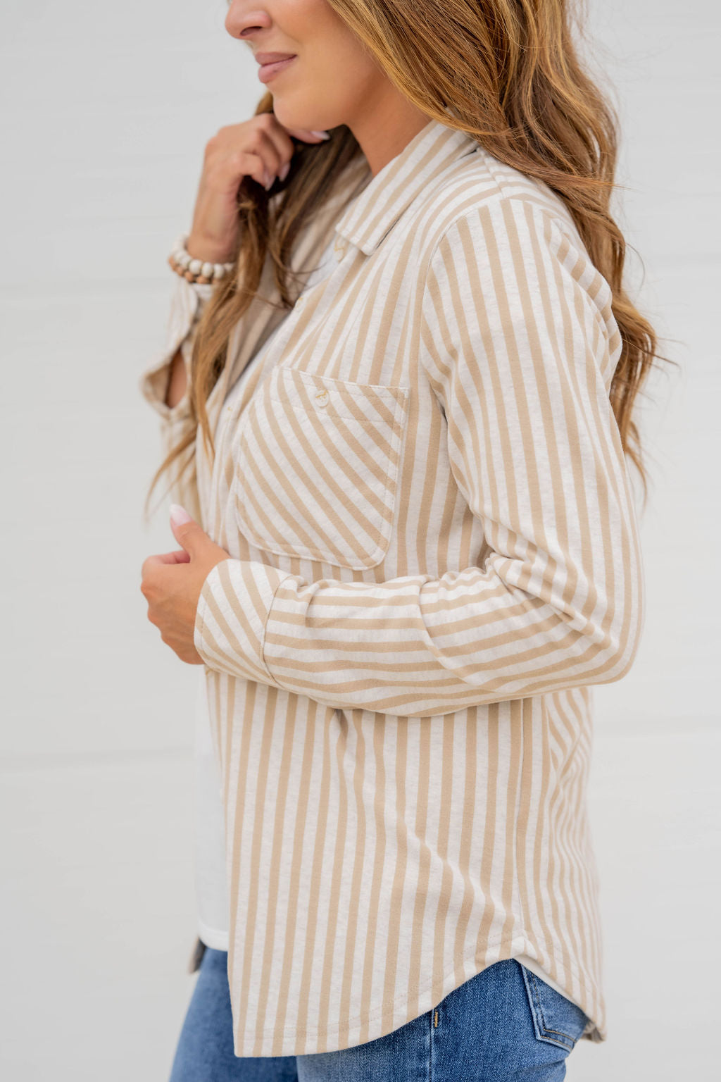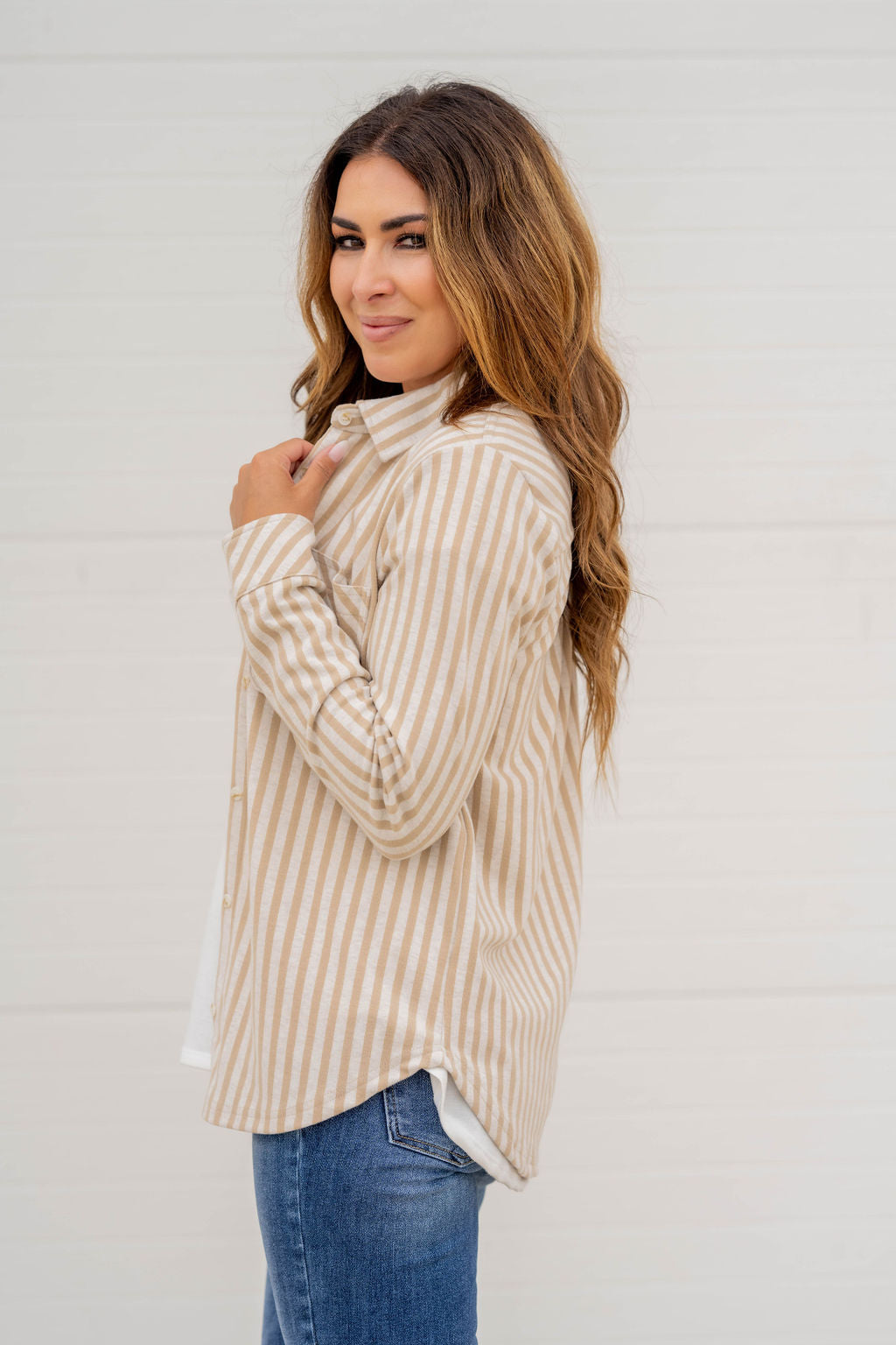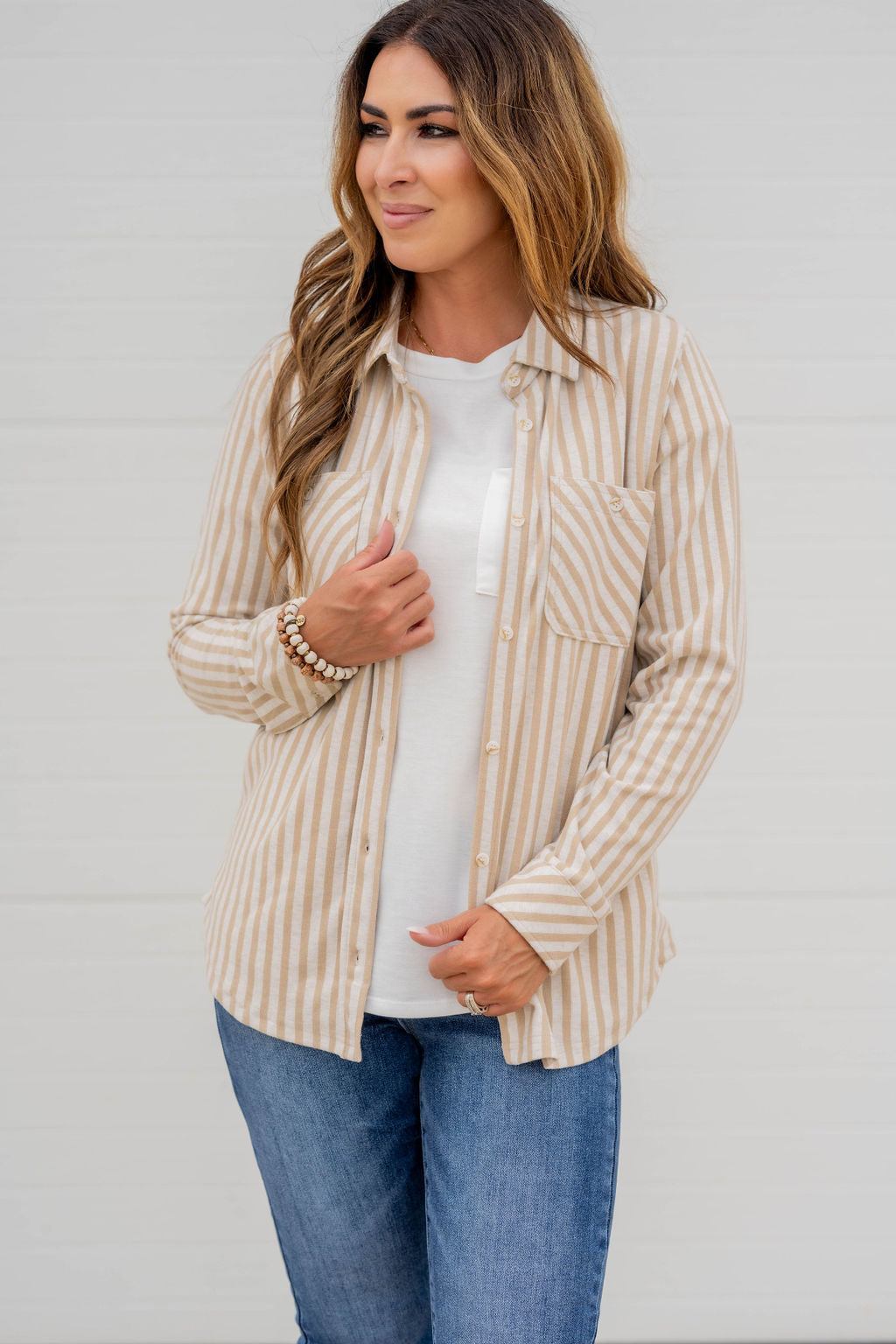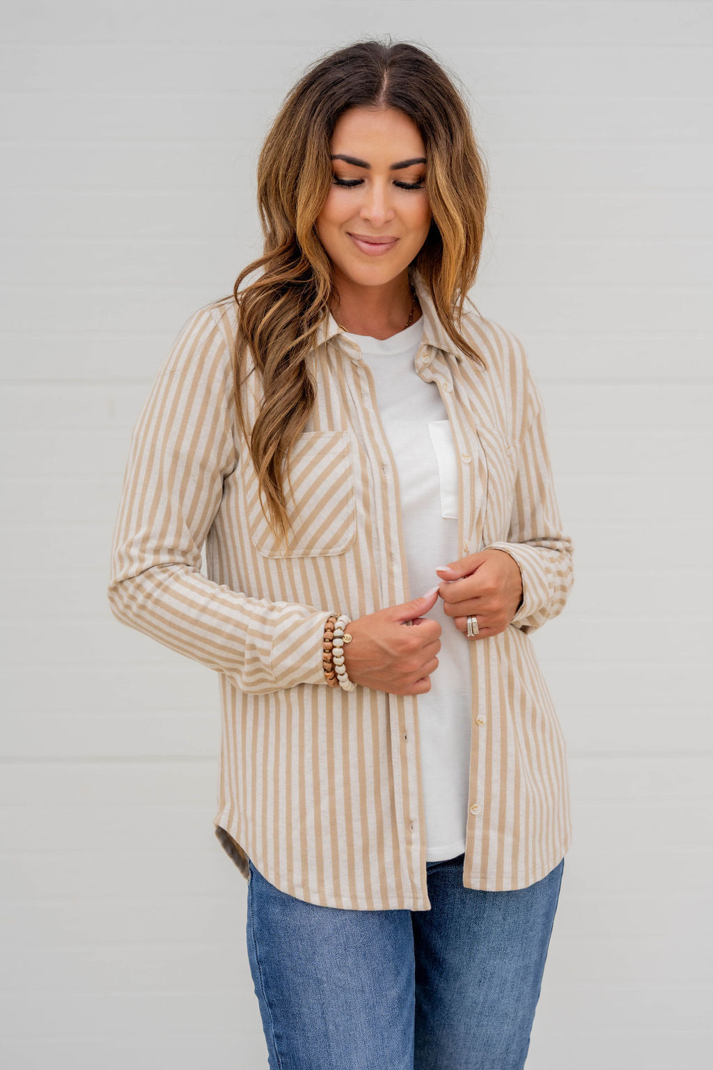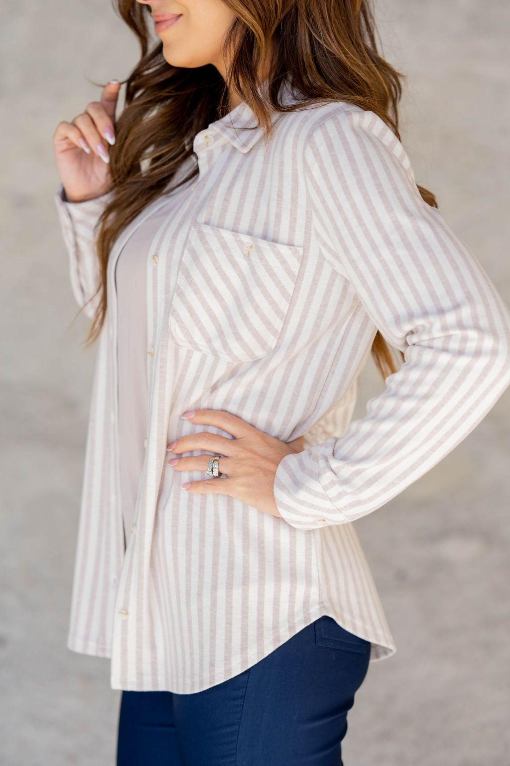 Simple and elegant describes this blouse perfectly. Button-up blouses are a classic, timeless piece. We love the mix of stripes and the lightweight material making this ideal for every season. Wear button up or leave this open over a basic or graphic tee!