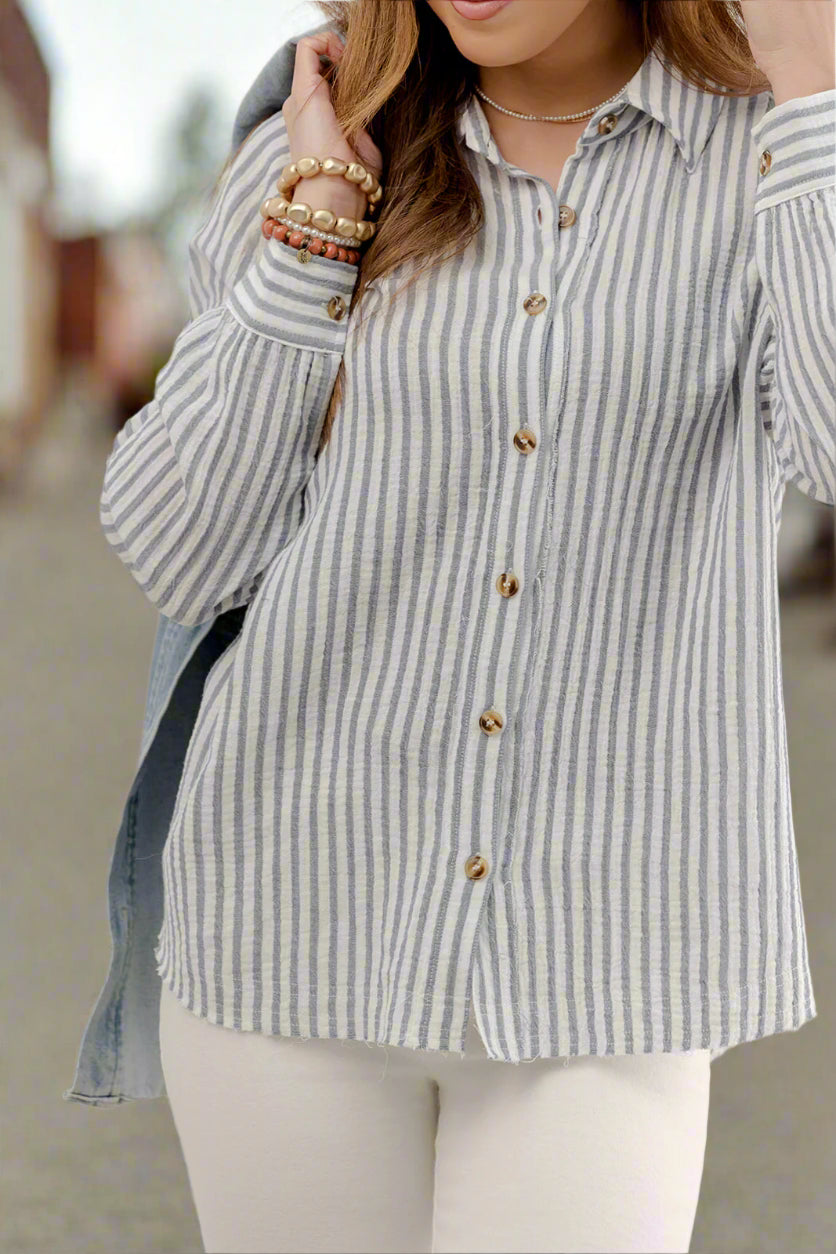Simple and elegant describes this blouse perfectly. Button-up blouses are a classic, timeless piece. We love the seersucker looks with the raw edge detailing and the lightweight material, making this ideal for every season. Wear buttoned up or leave this open over a basic or graphic tee! Chilly? Add a vest, cardigan, or jacket with ease!