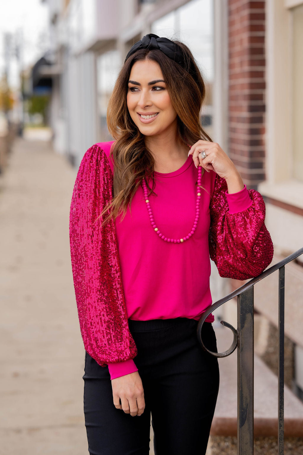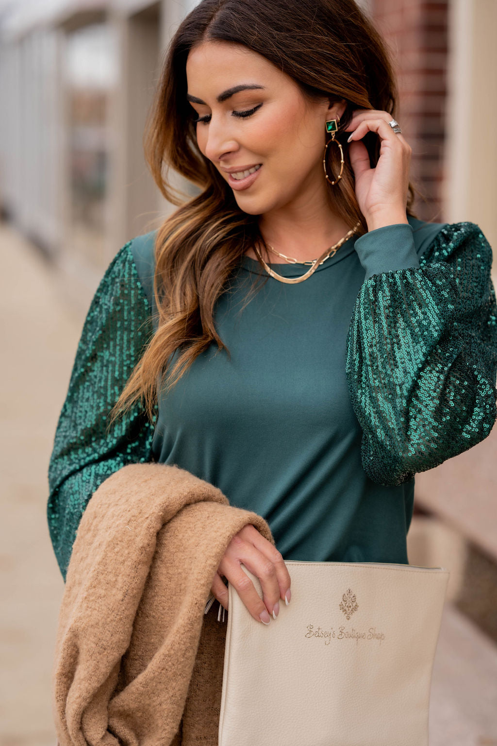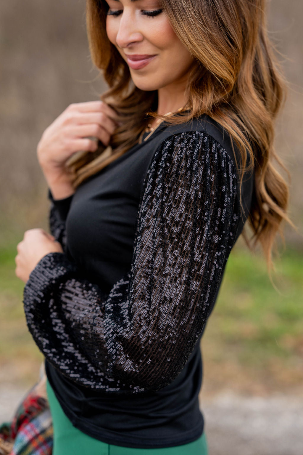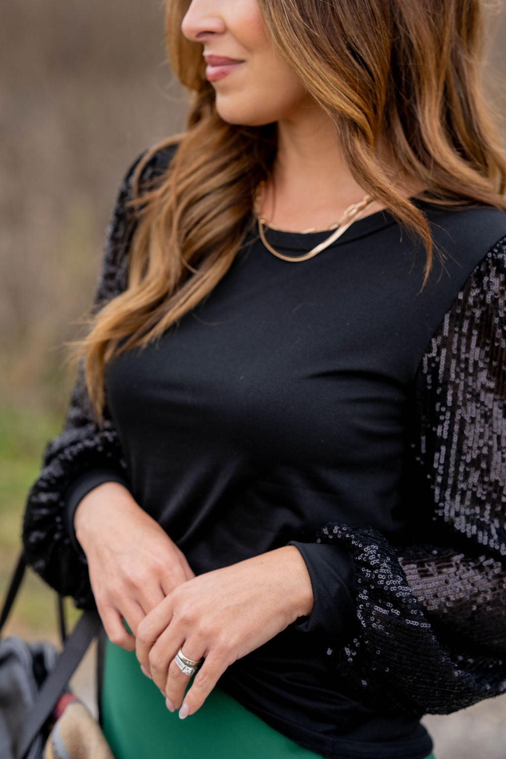 How fun and festive is this blouse? With sequin sleeves and a solid body, this is a piece that you can dress up or down, depending on what you want! Tuck this into a fun skirt, pair with your favorite denim, some fun joggers, or a bold-colored pair of our Betsey's Jeggings! It also looks great with a vest over the top.