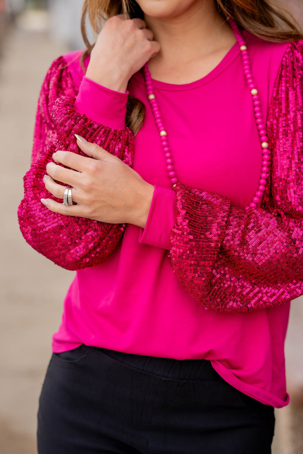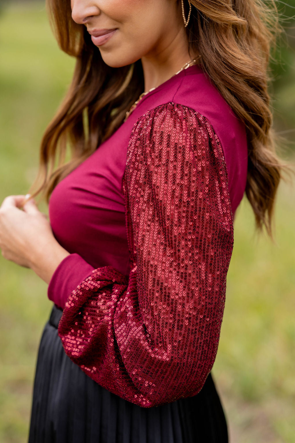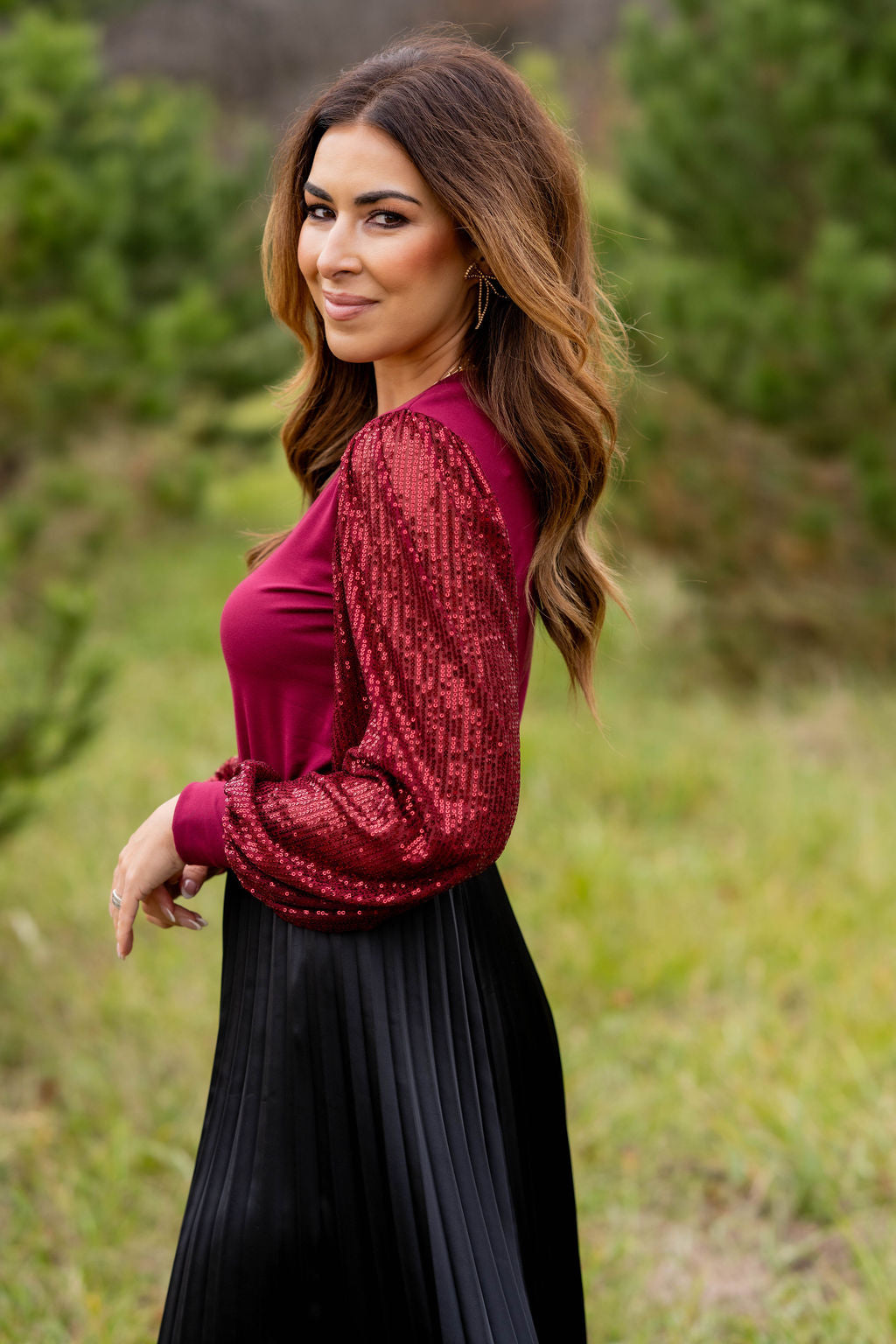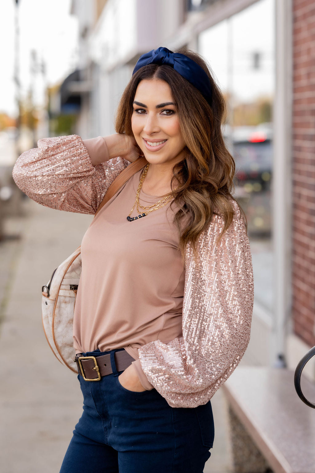 How fun and festive is this blouse? With sequin sleeves and a solid body, this is a piece that you can dress up or down, depending on what you want! Tuck this into a fun skirt, pair with your favorite denim, some fun joggers, or a bold-colored pair of our Betsey's Jeggings! It also looks great with a vest over the top.