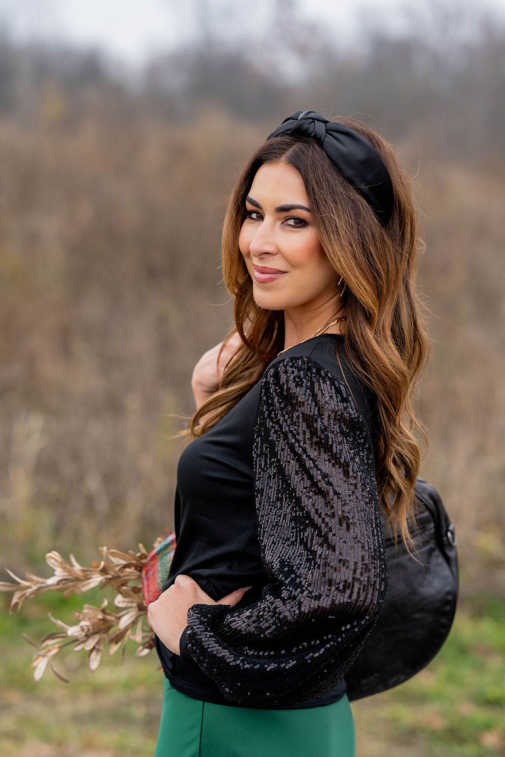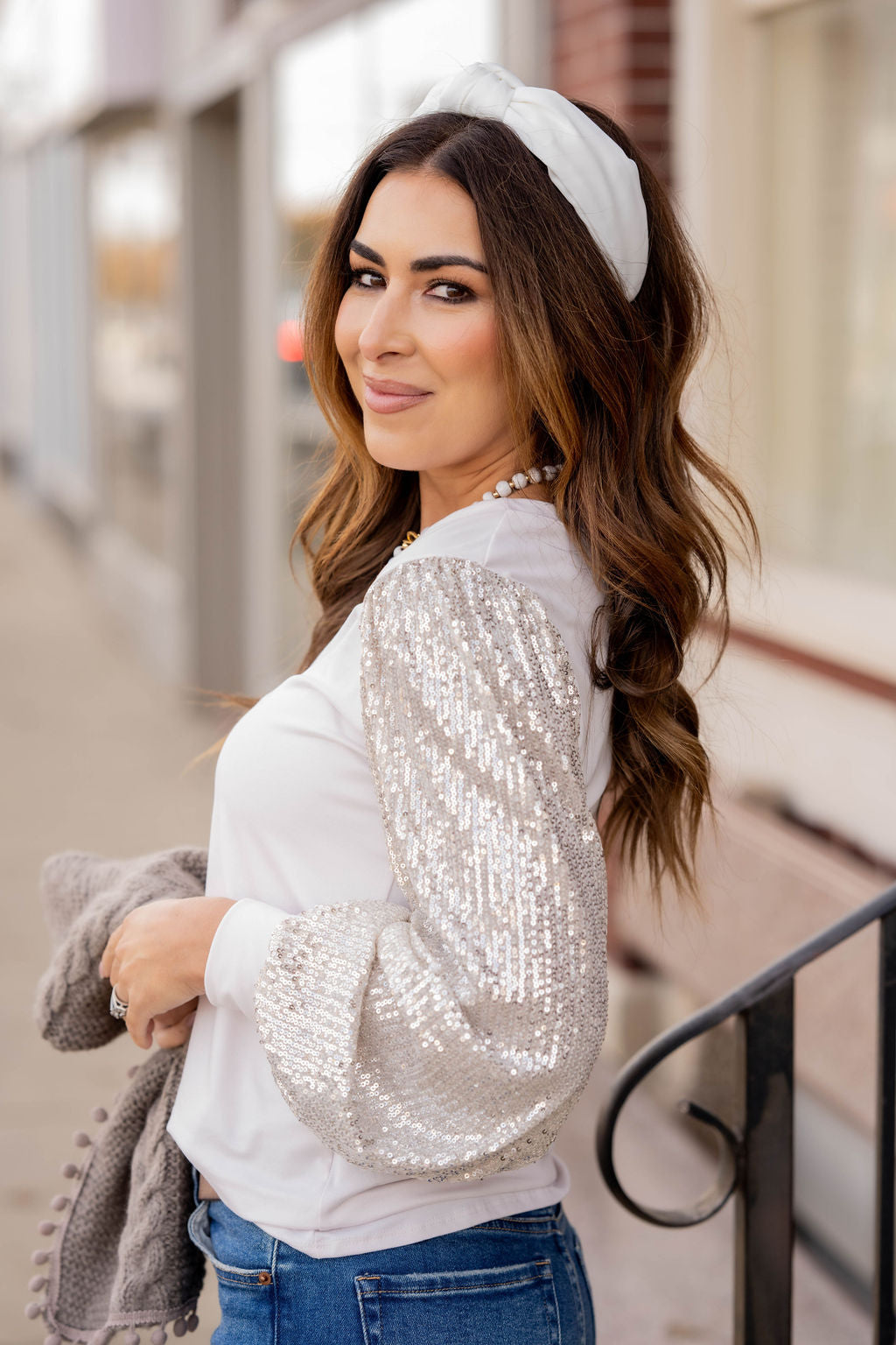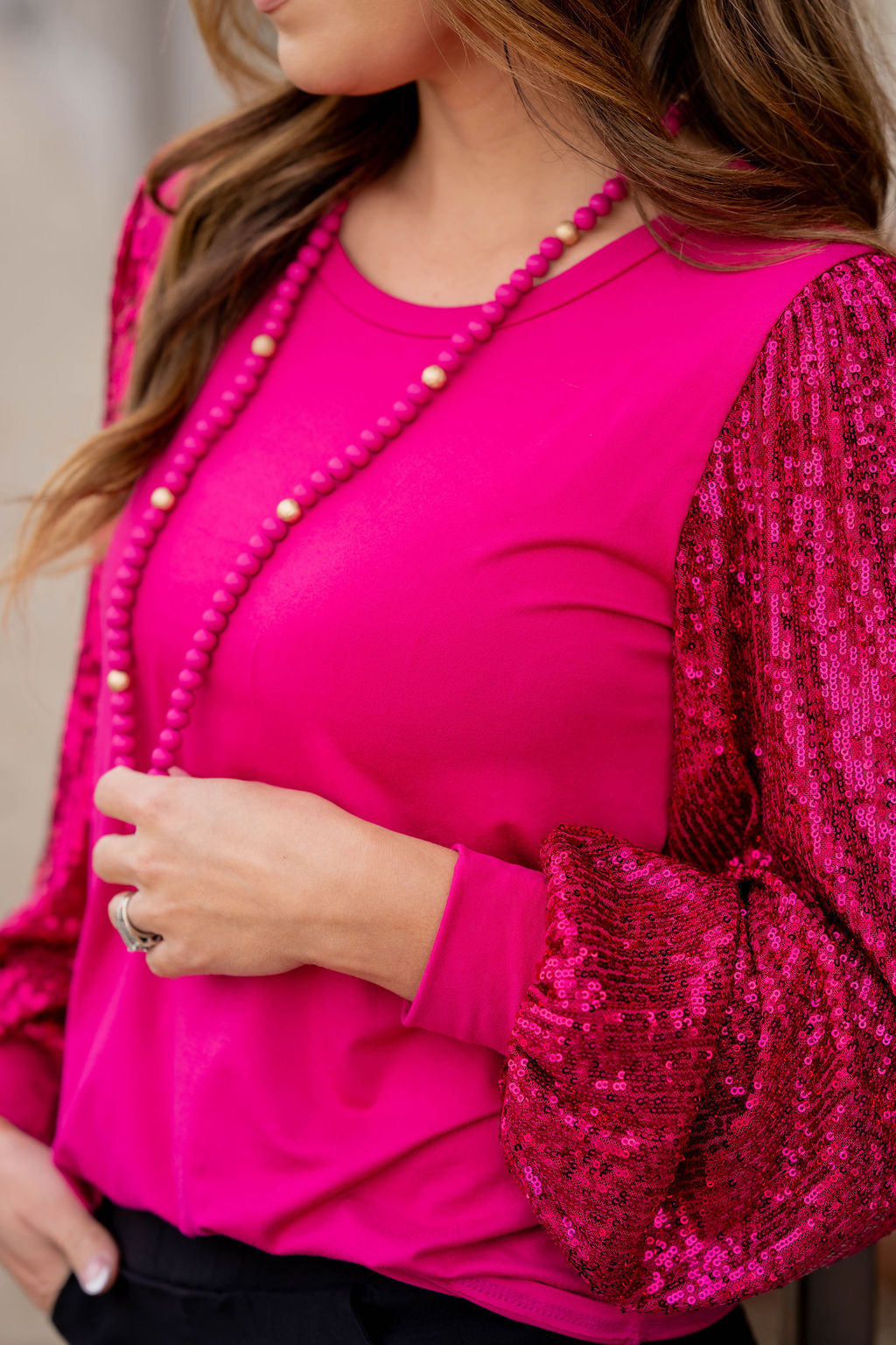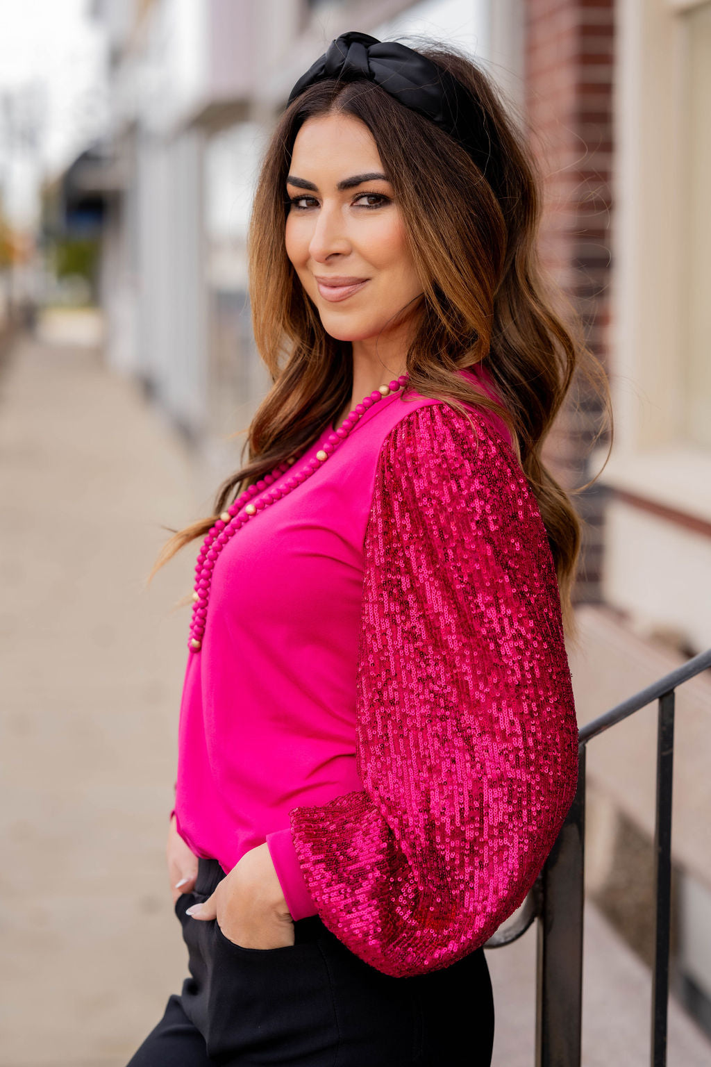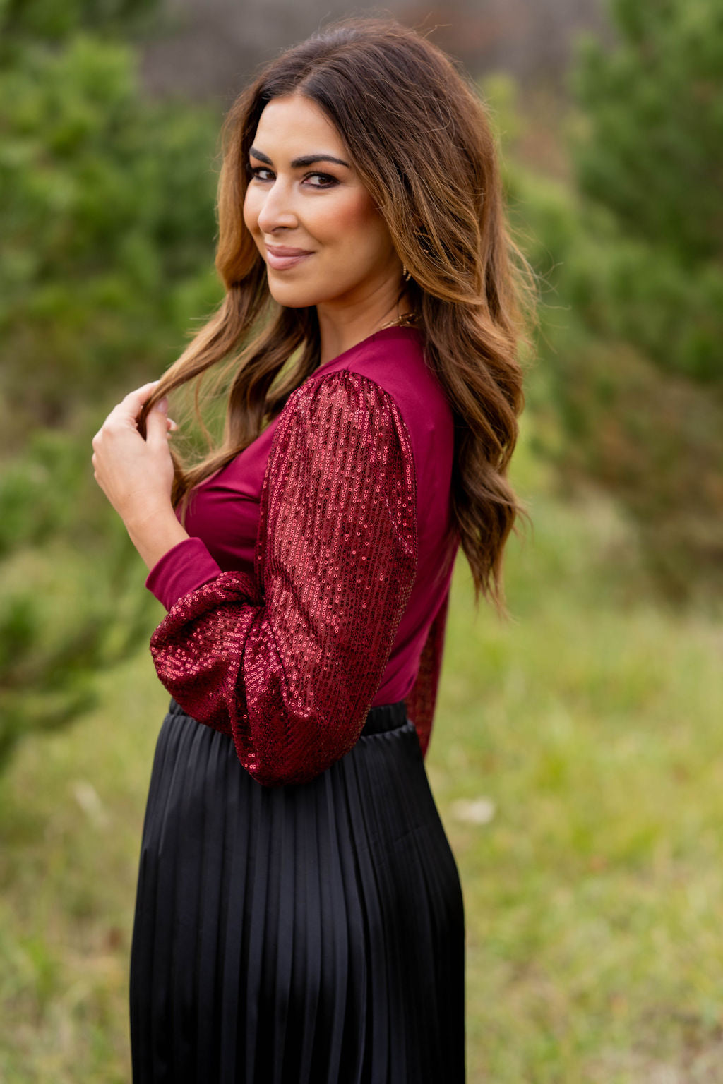How fun and festive is this blouse? With sequin sleeves and a solid body, this is a piece that you can dress up or down, depending on what you want! Tuck this into a fun skirt, pair with your favorite denim, some fun joggers, or a bold-colored pair of our Betsey's Jeggings! It also looks great with a vest over the top.