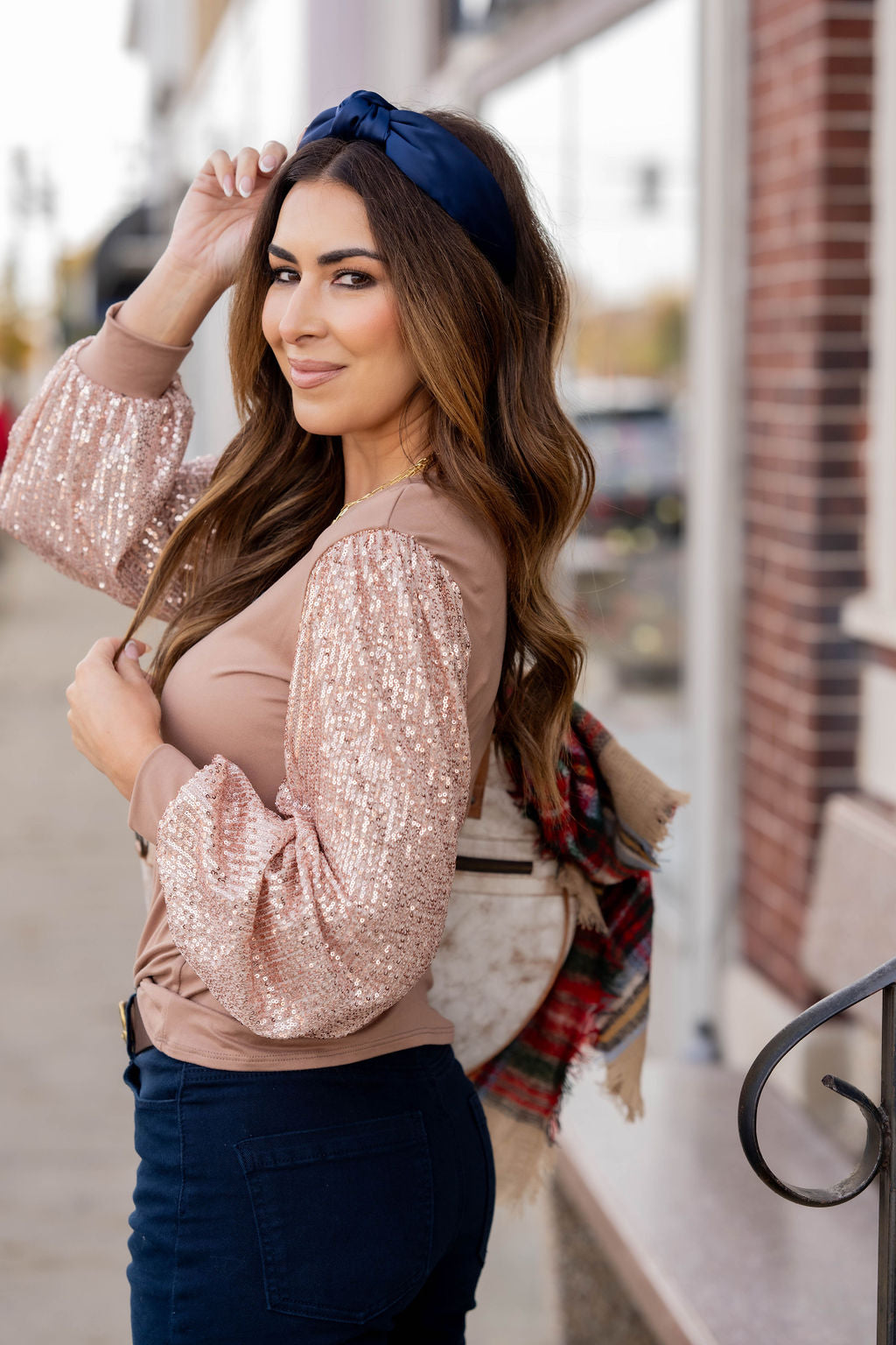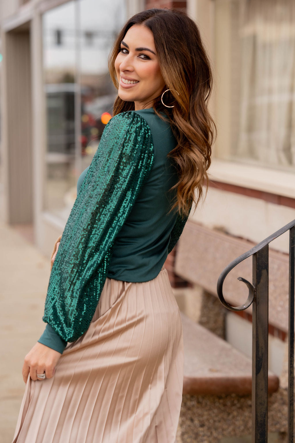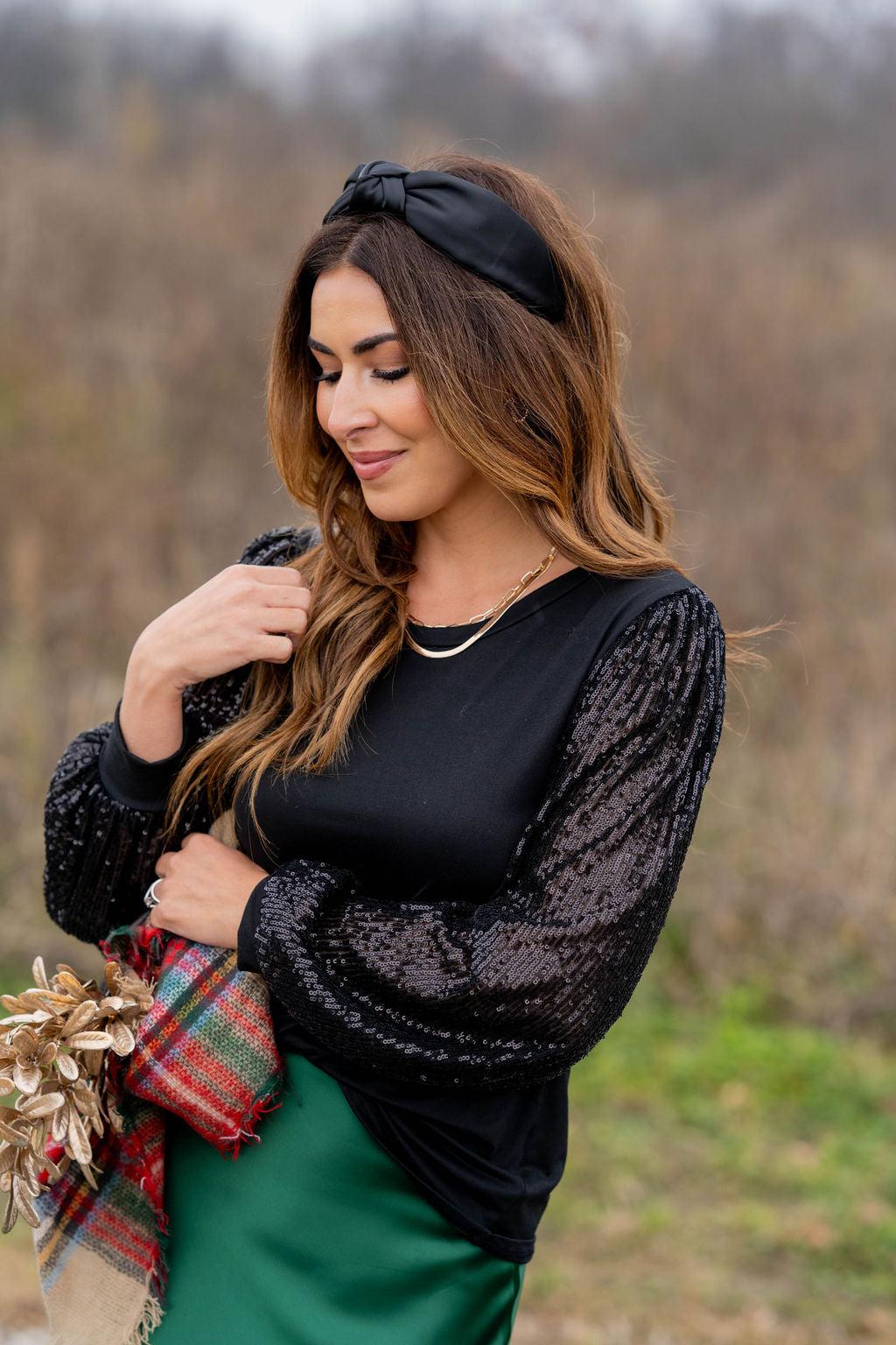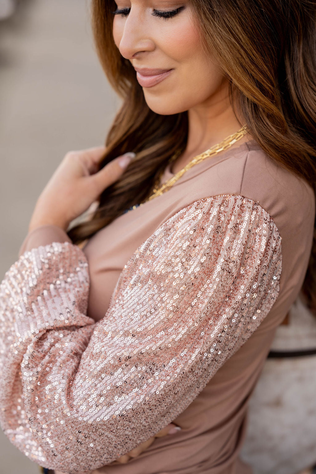 How fun and festive is this blouse? With sequin sleeves and a solid body, this is a piece that you can dress up or down, depending on what you want! Tuck this into a fun skirt, pair with your favorite denim, some fun joggers, or a bold-colored pair of our Betsey's Jeggings! It also looks great with a vest over the top.