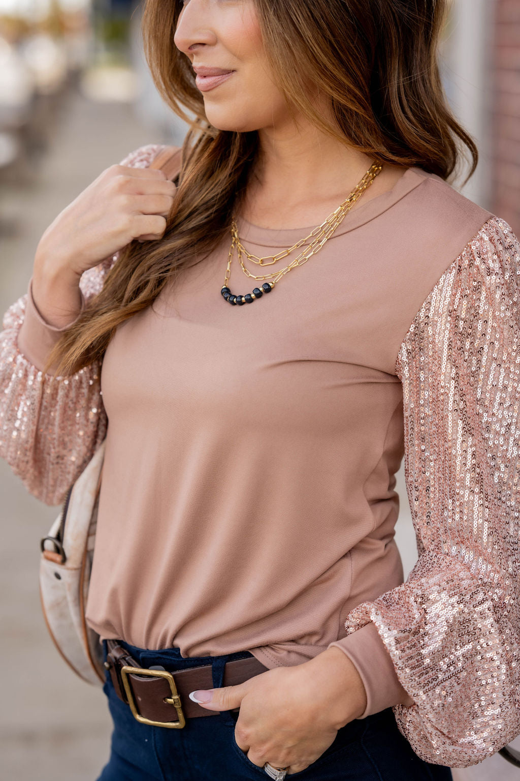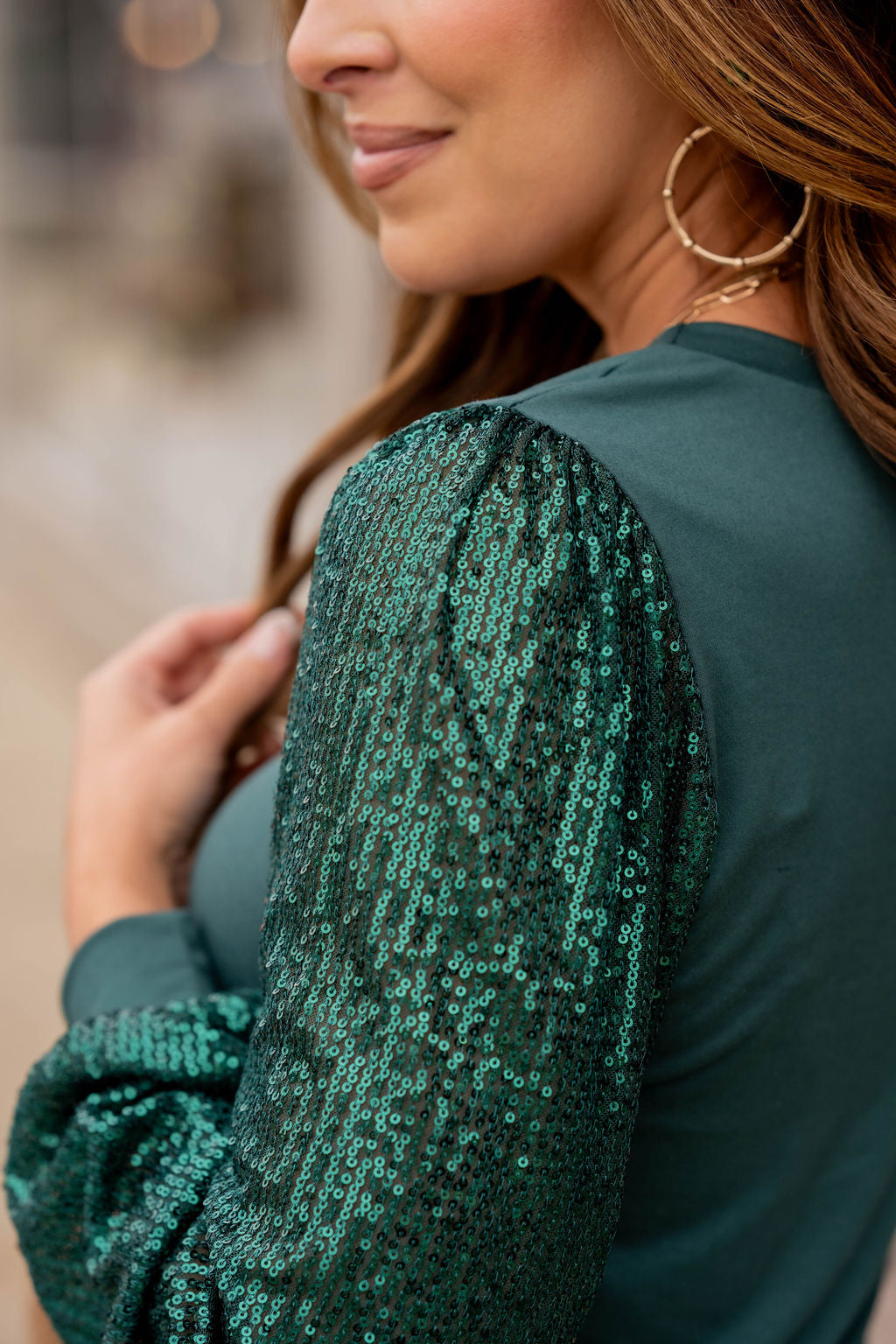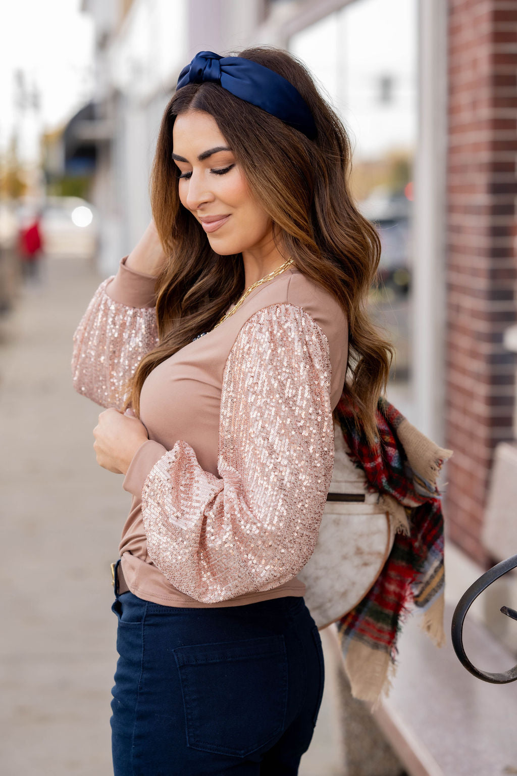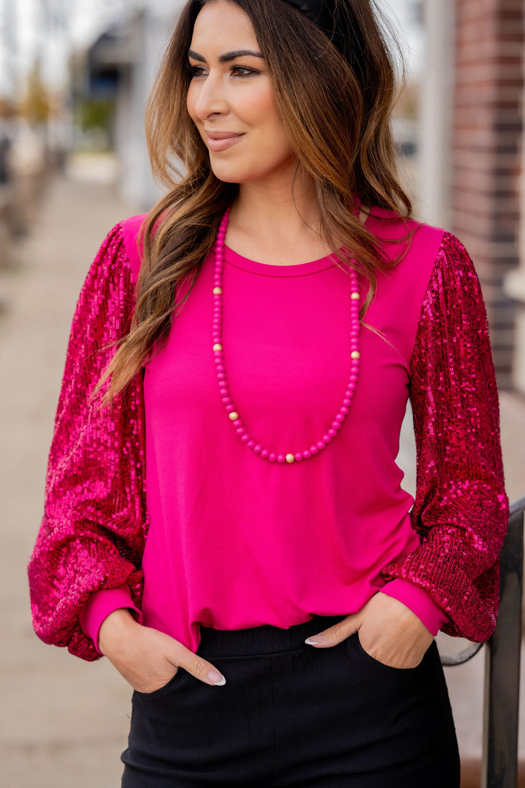 How fun and festive is this blouse? With sequin sleeves and a solid body, this is a piece that you can dress up or down, depending on what you want! Tuck this into a fun skirt, pair with your favorite denim, some fun joggers, or a bold-colored pair of our Betsey's Jeggings! It also looks great with a vest over the top.