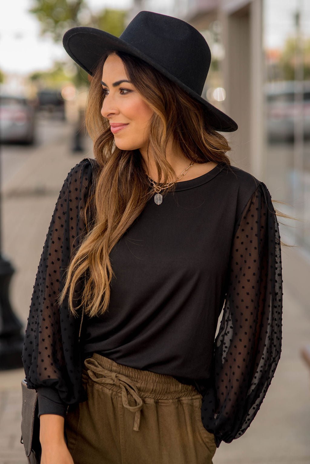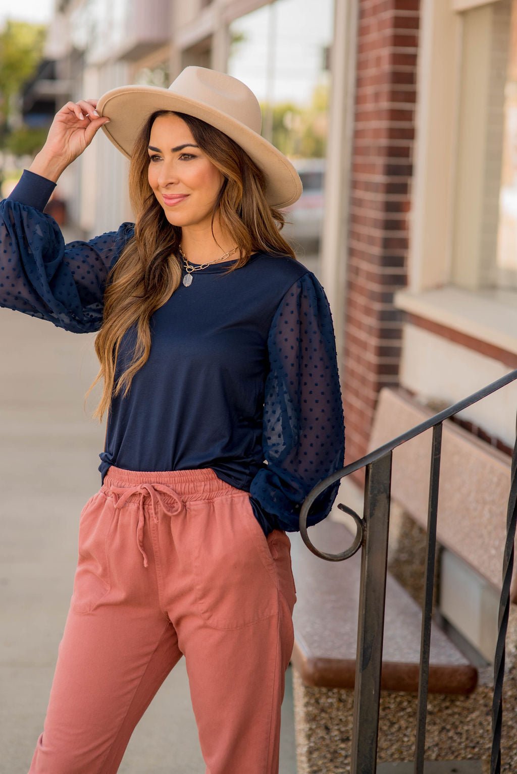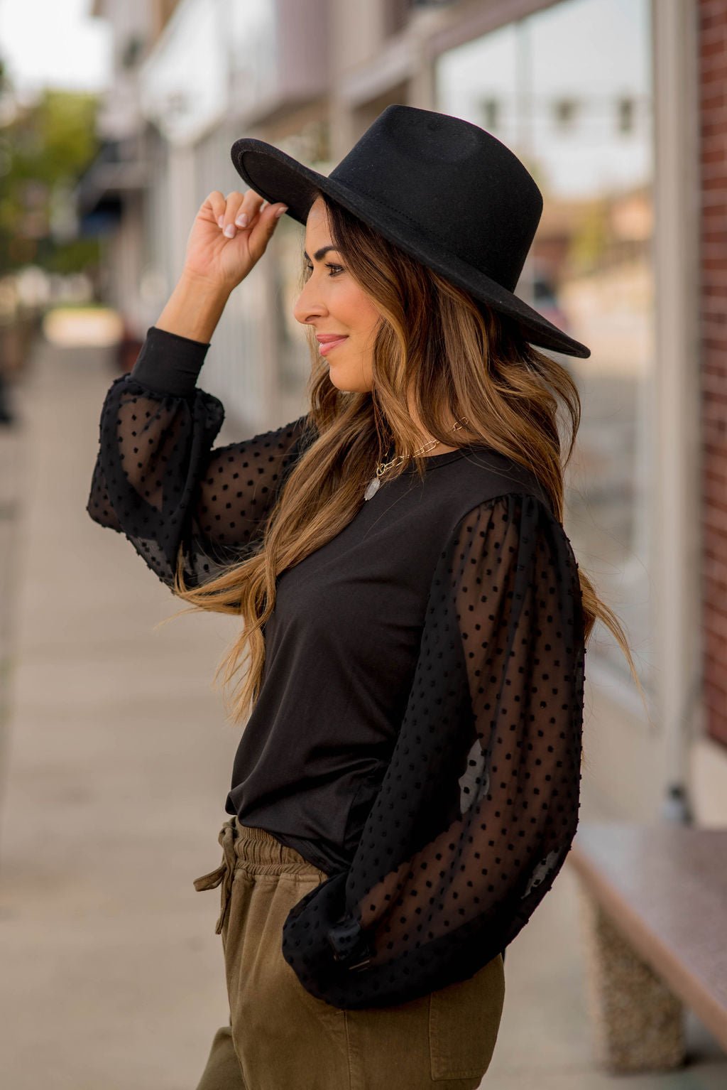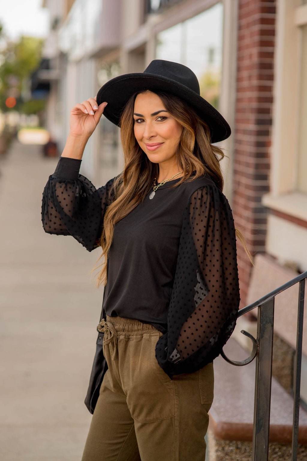 The soft and comfy tee like body of this blouse really pops against the sheer dot textured sleeves! Lightweight enough to wear alone with shorts or a skirt in the warmer months but can be layered with a vest or cardigan or shacket in the cooler ones! This can also be dressed up or down with ease, making it a staple piece for any girls wardrobe!