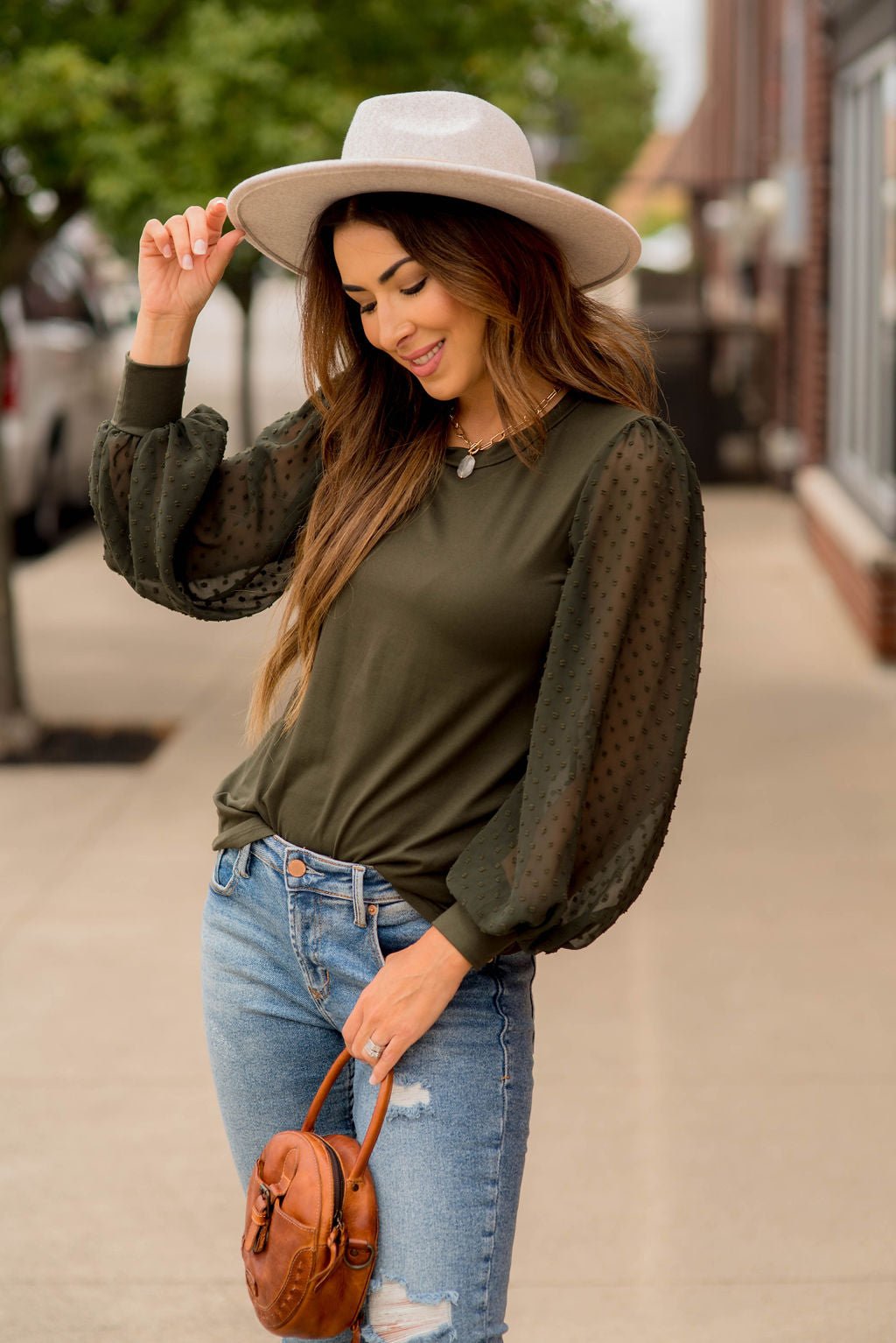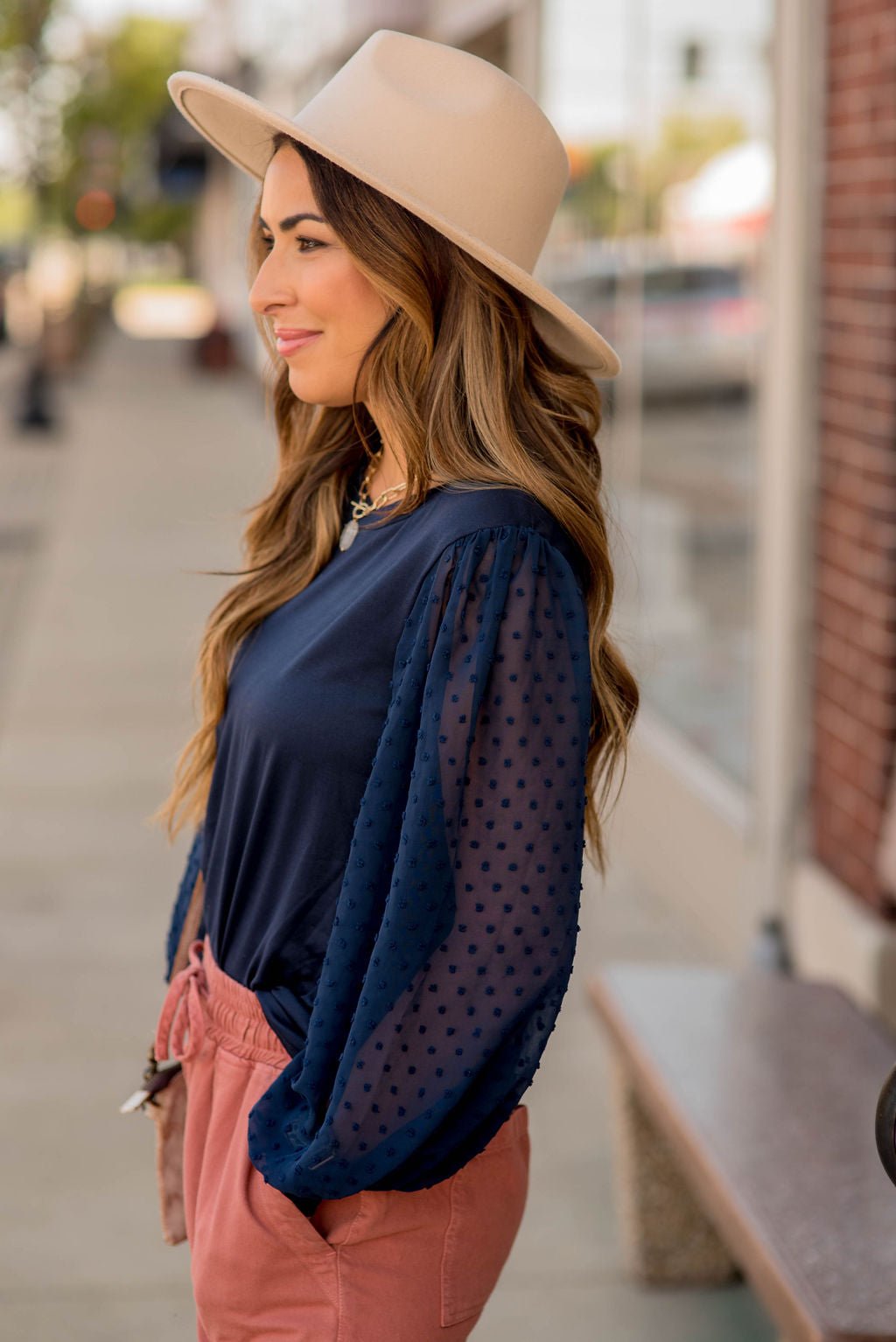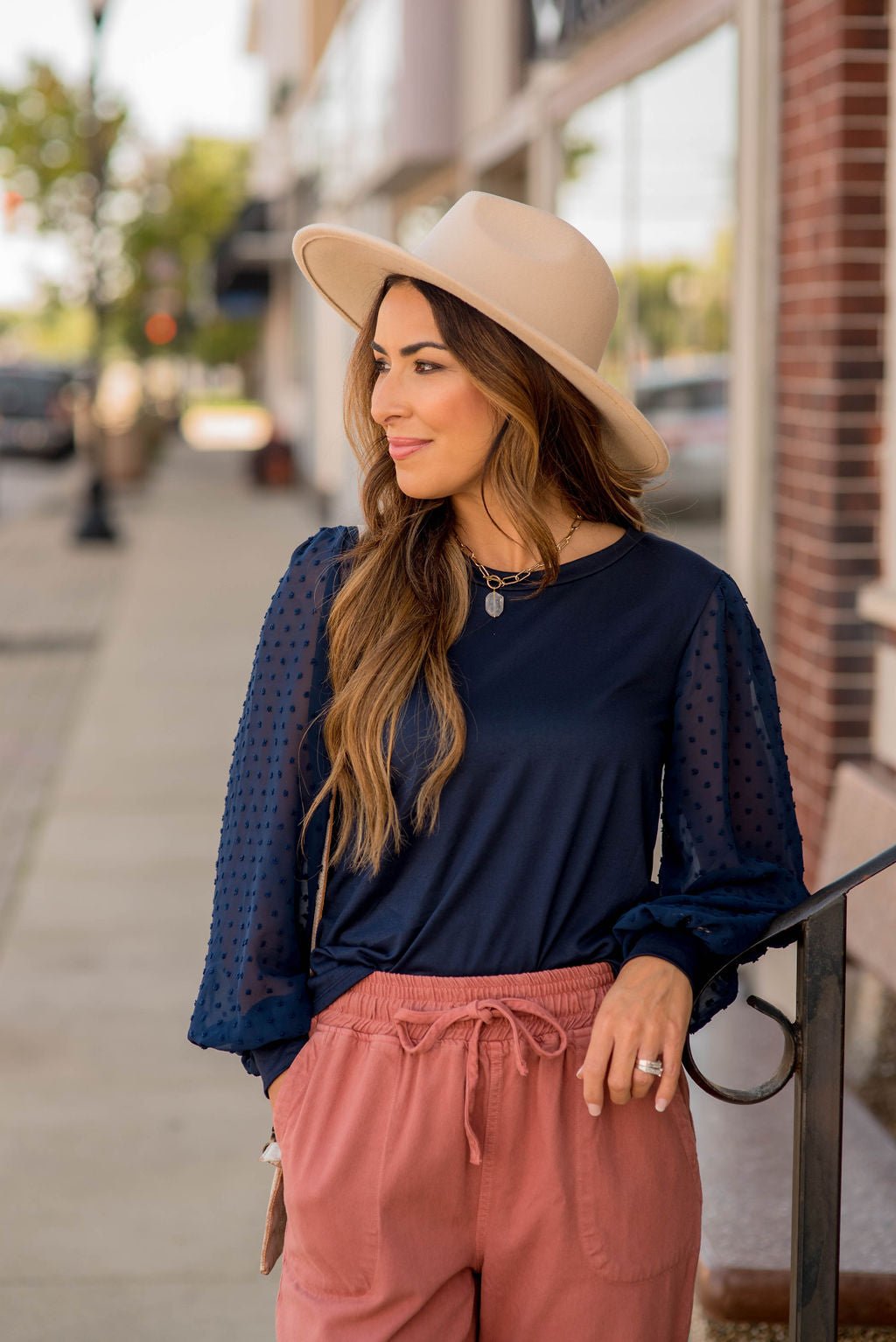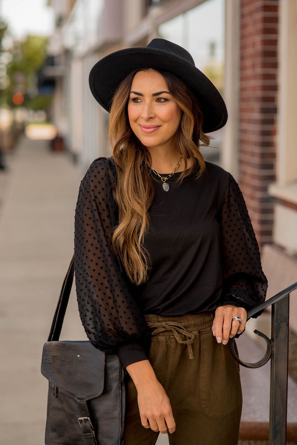 The soft and comfy tee like body of this blouse really pops against the sheer dot textured sleeves! Lightweight enough to wear alone with shorts or a skirt in the warmer months but can be layered with a vest or cardigan or shacket in the cooler ones! This can also be dressed up or down with ease, making it a staple piece for any girls wardrobe!