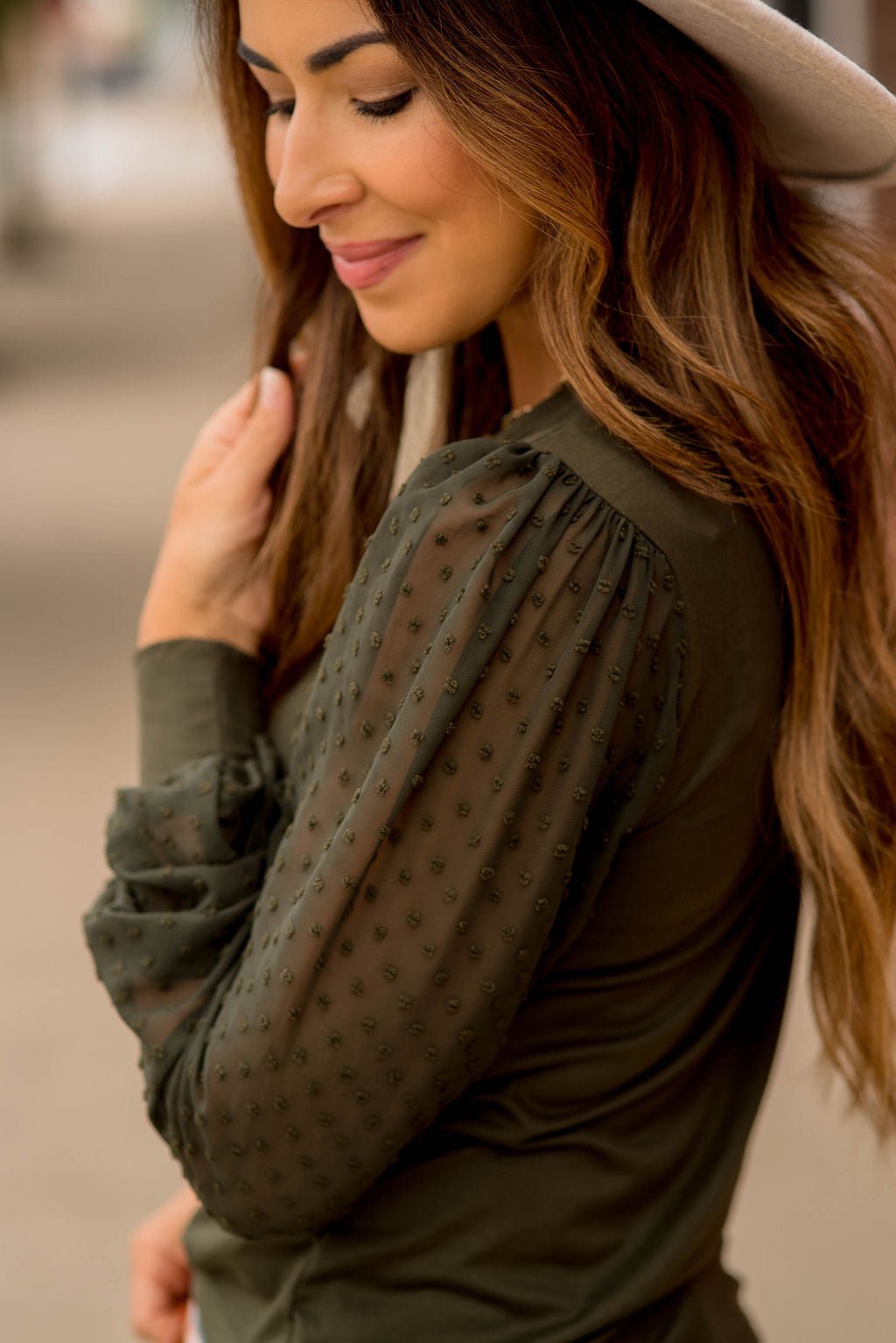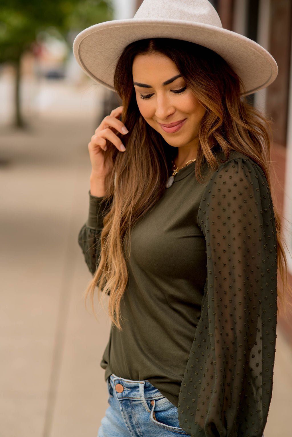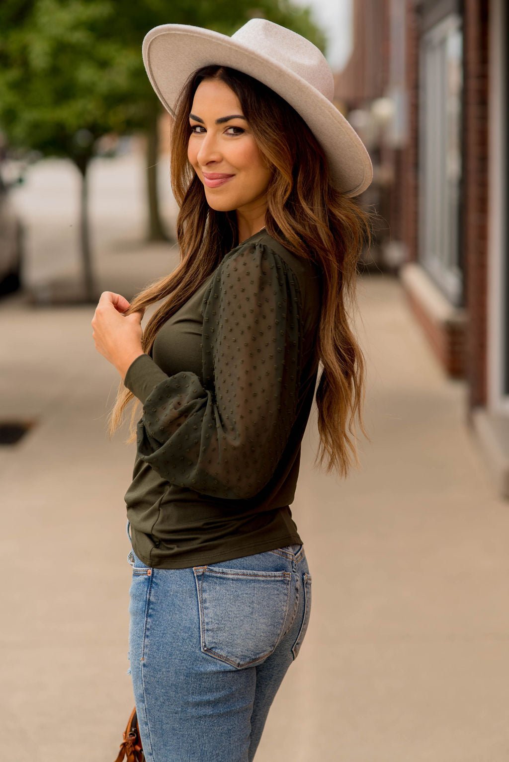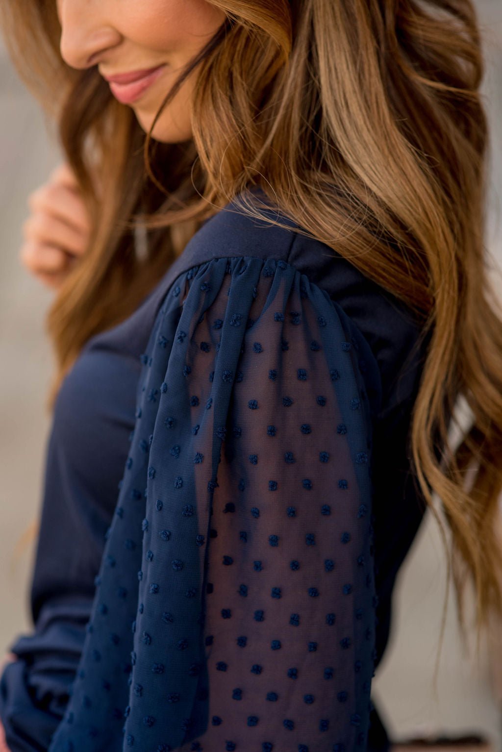 The soft and comfy tee like body of this blouse really pops against the sheer dot textured sleeves! Lightweight enough to wear alone with shorts or a skirt in the warmer months but can be layered with a vest or cardigan or shacket in the cooler ones! This can also be dressed up or down with ease, making it a staple piece for any girls wardrobe!