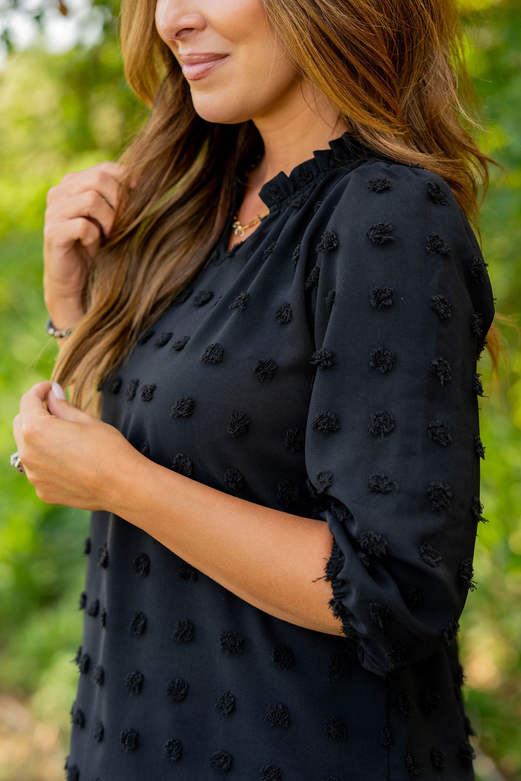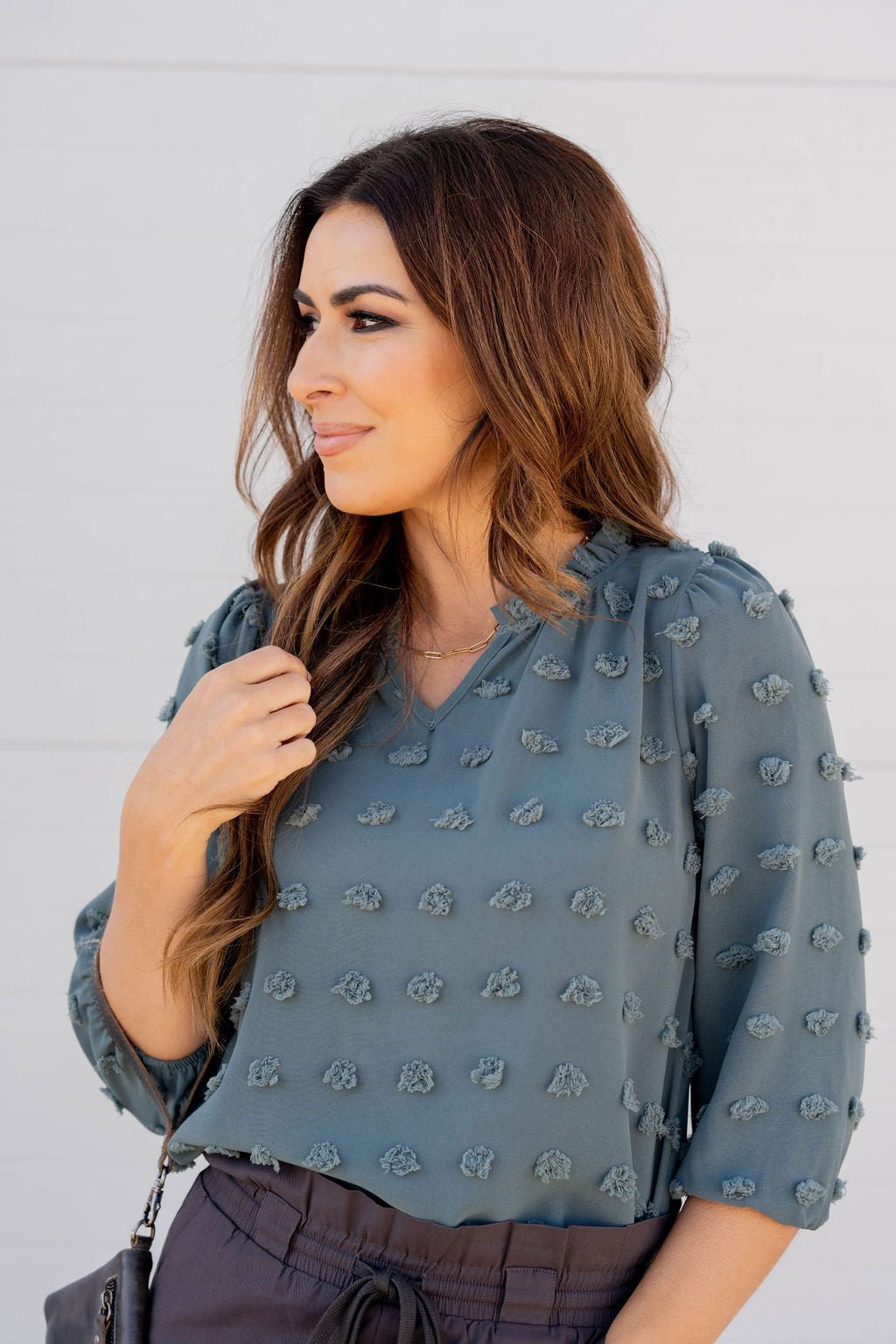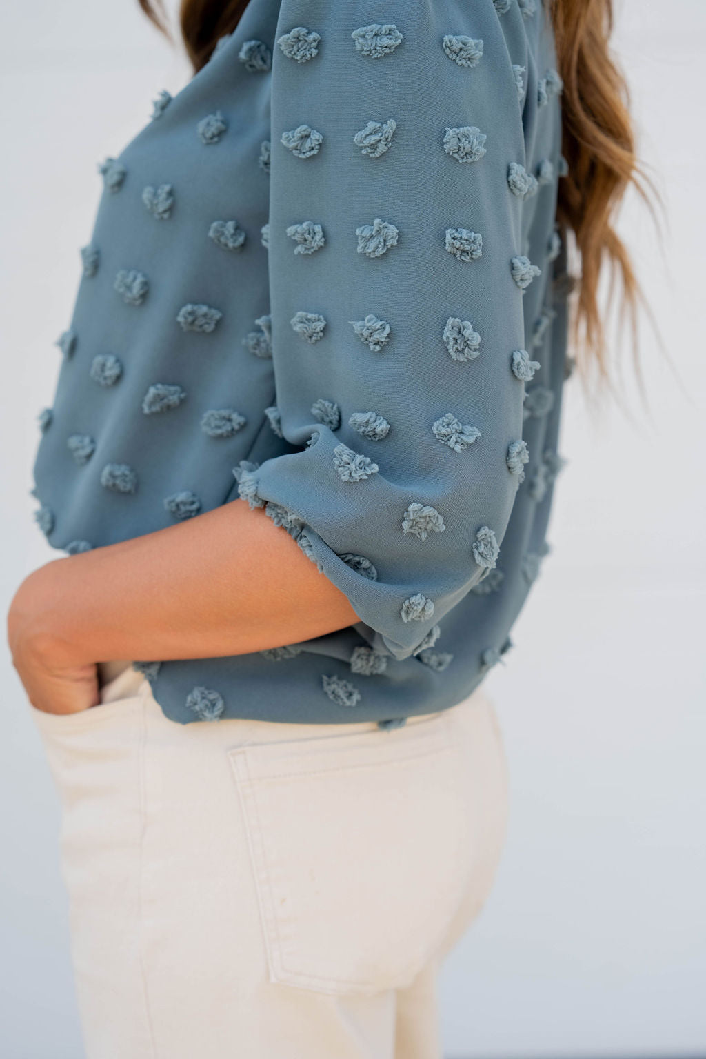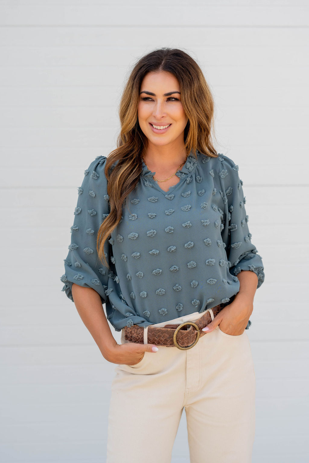 A simple blouse taken to the next level with the addition of the textured dots! We love how easy this blouse is to style, whether going for a dressy or more casual look, we just know you’re going to love this one!