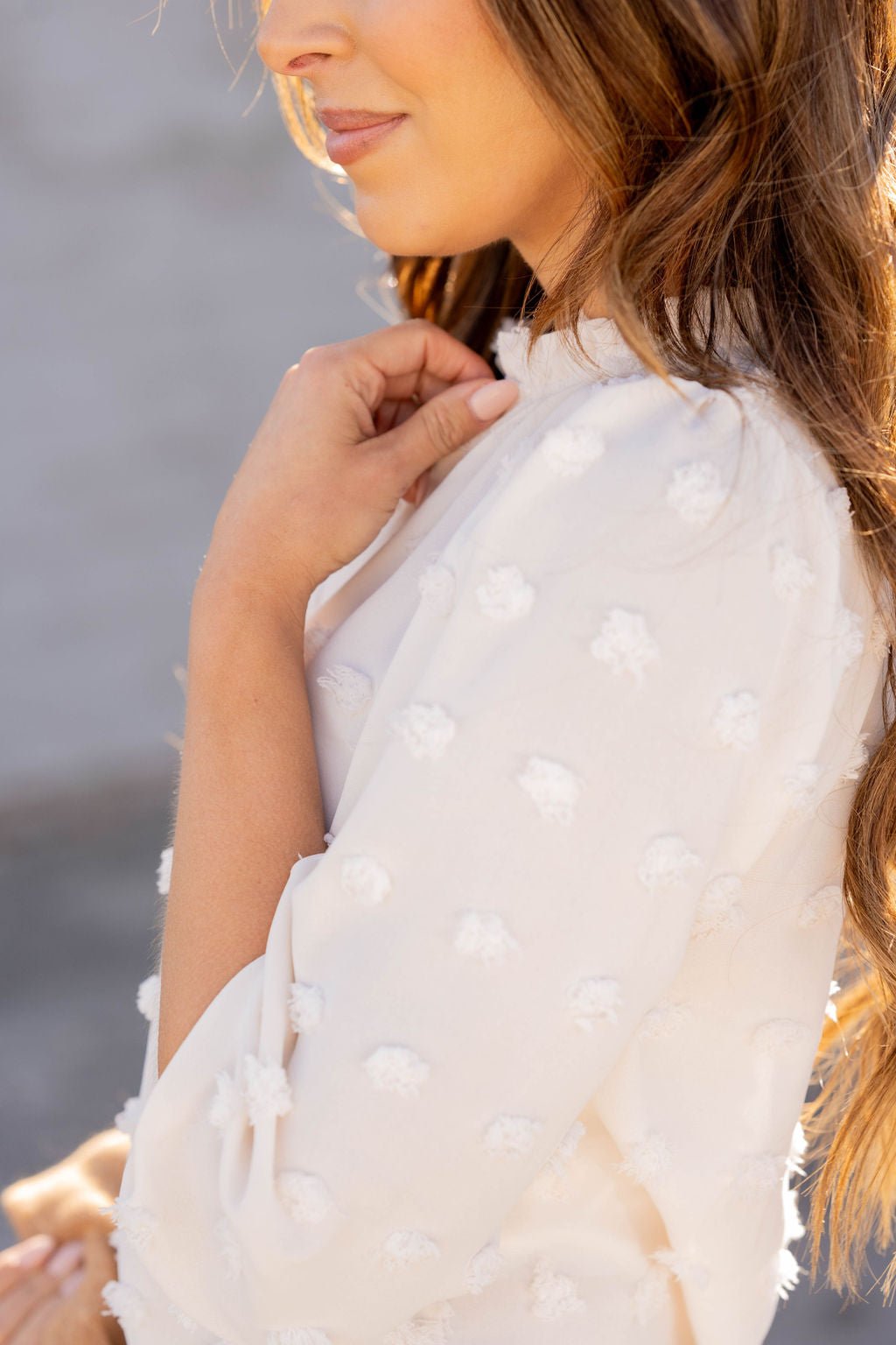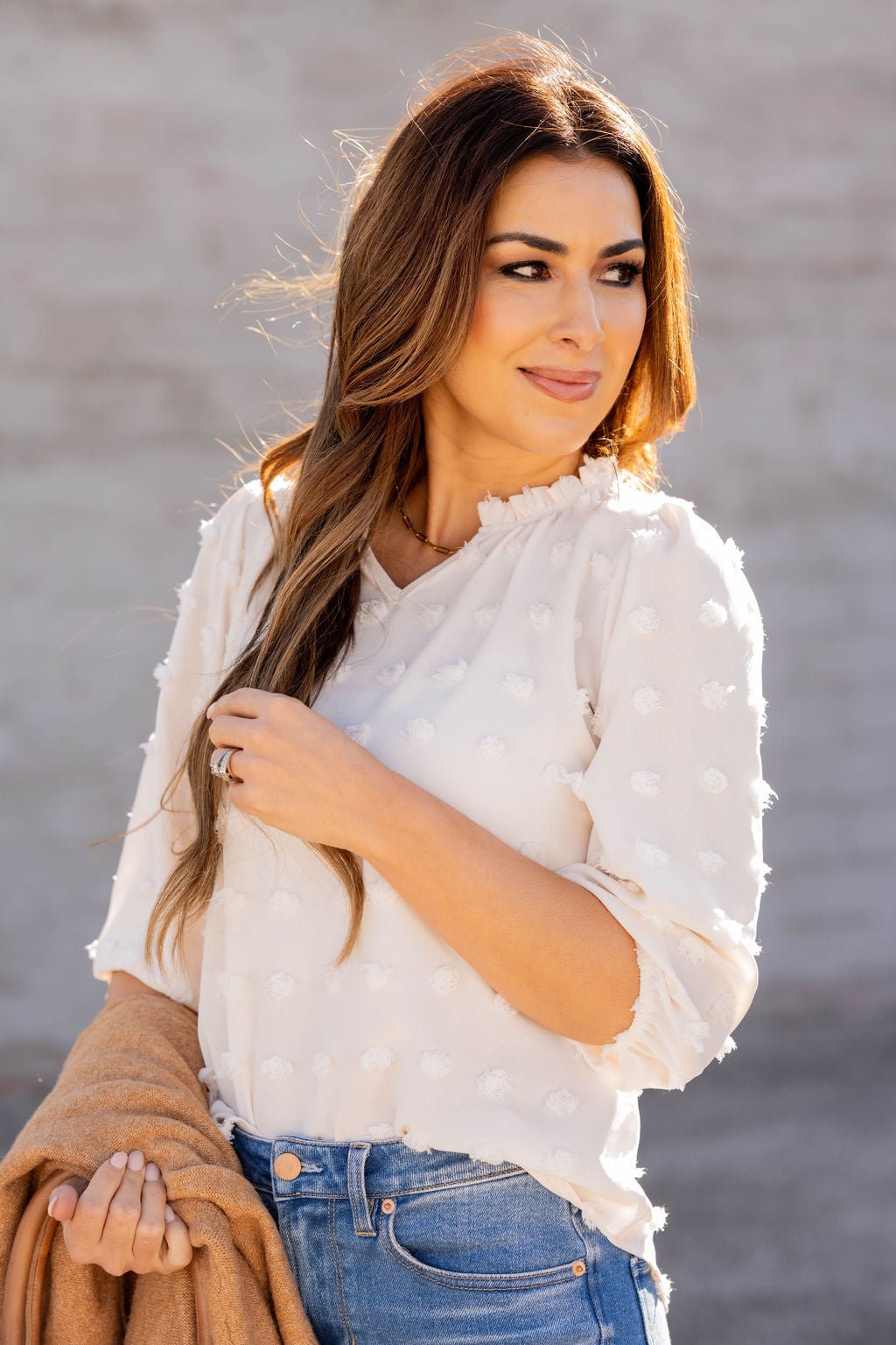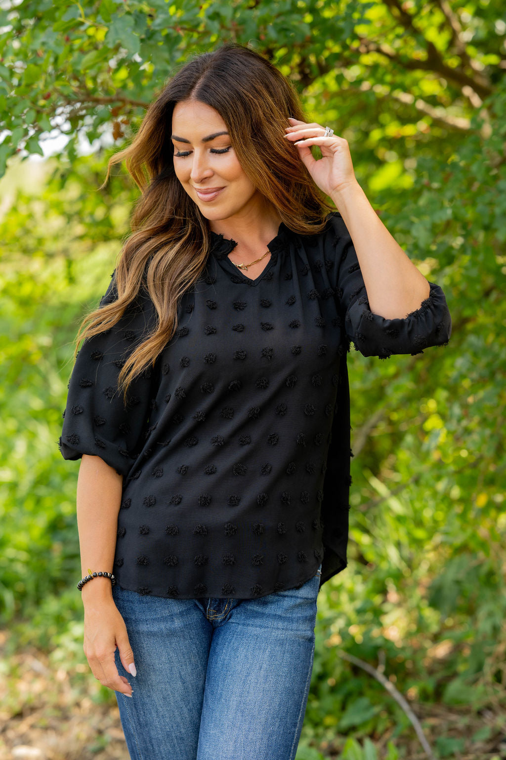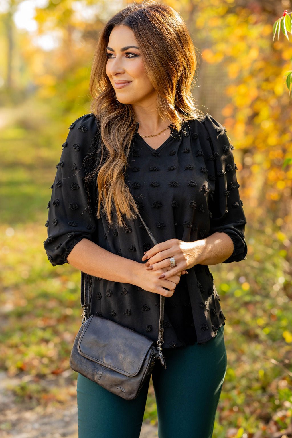 A simple blouse taken to the next level with the addition of the textured dots! We love how easy this blouse is to style, whether going for a dressy or more casual look, we just know you’re going to love this one!