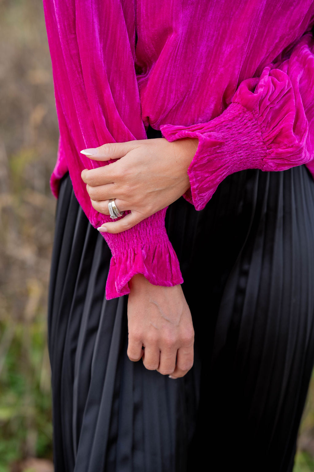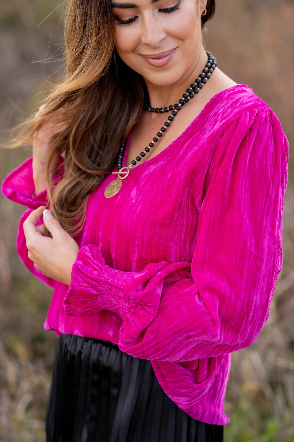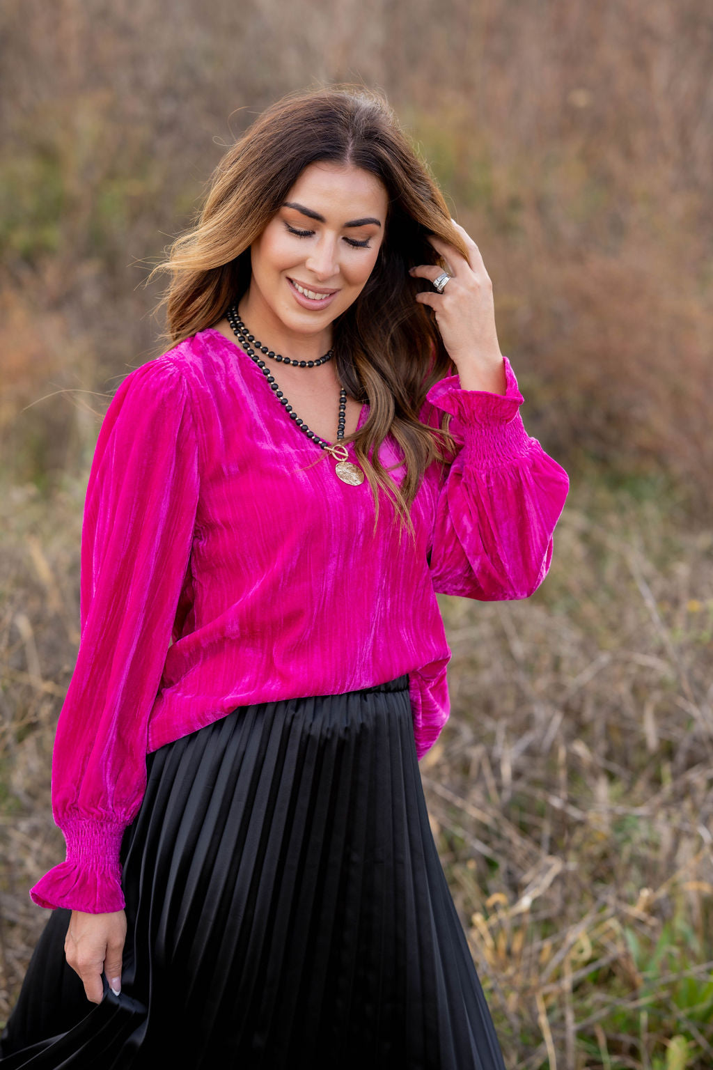 Stand out from the crowd in this one of a kind blouse! The velvety look will transform even the simplest of outfits! Tuck into a skirt, pair with your favorite denim, or add a bold-colored pair of our Betsey’s Jeggings! We love this for all of your holidays festivities. Just add your favorite accessories to make the look truly yours!