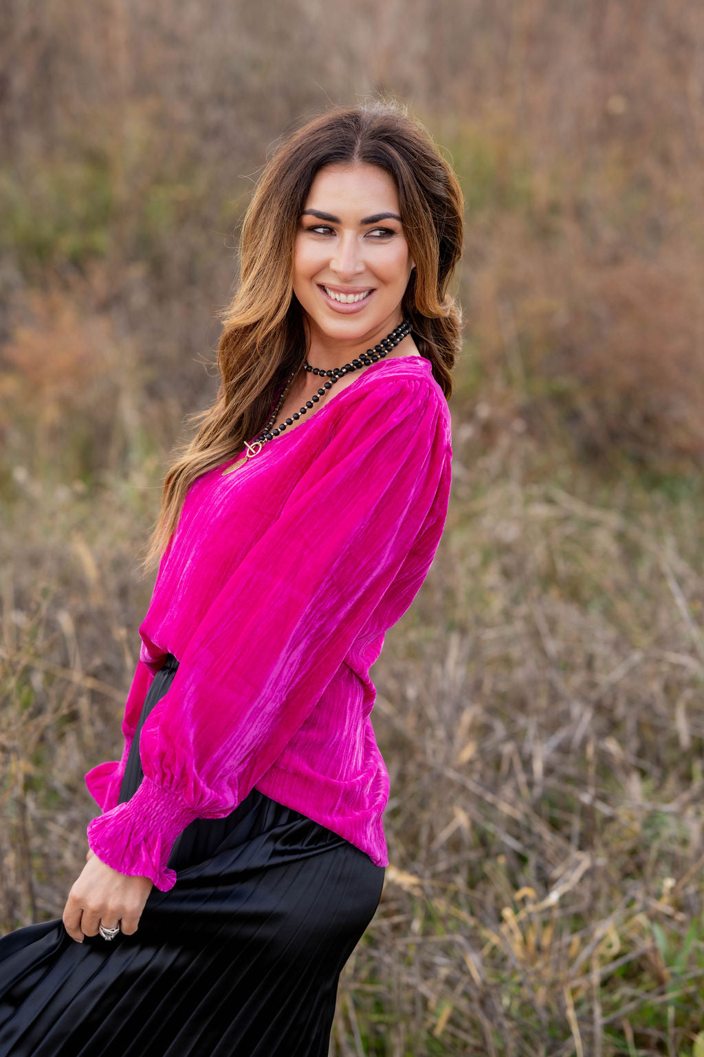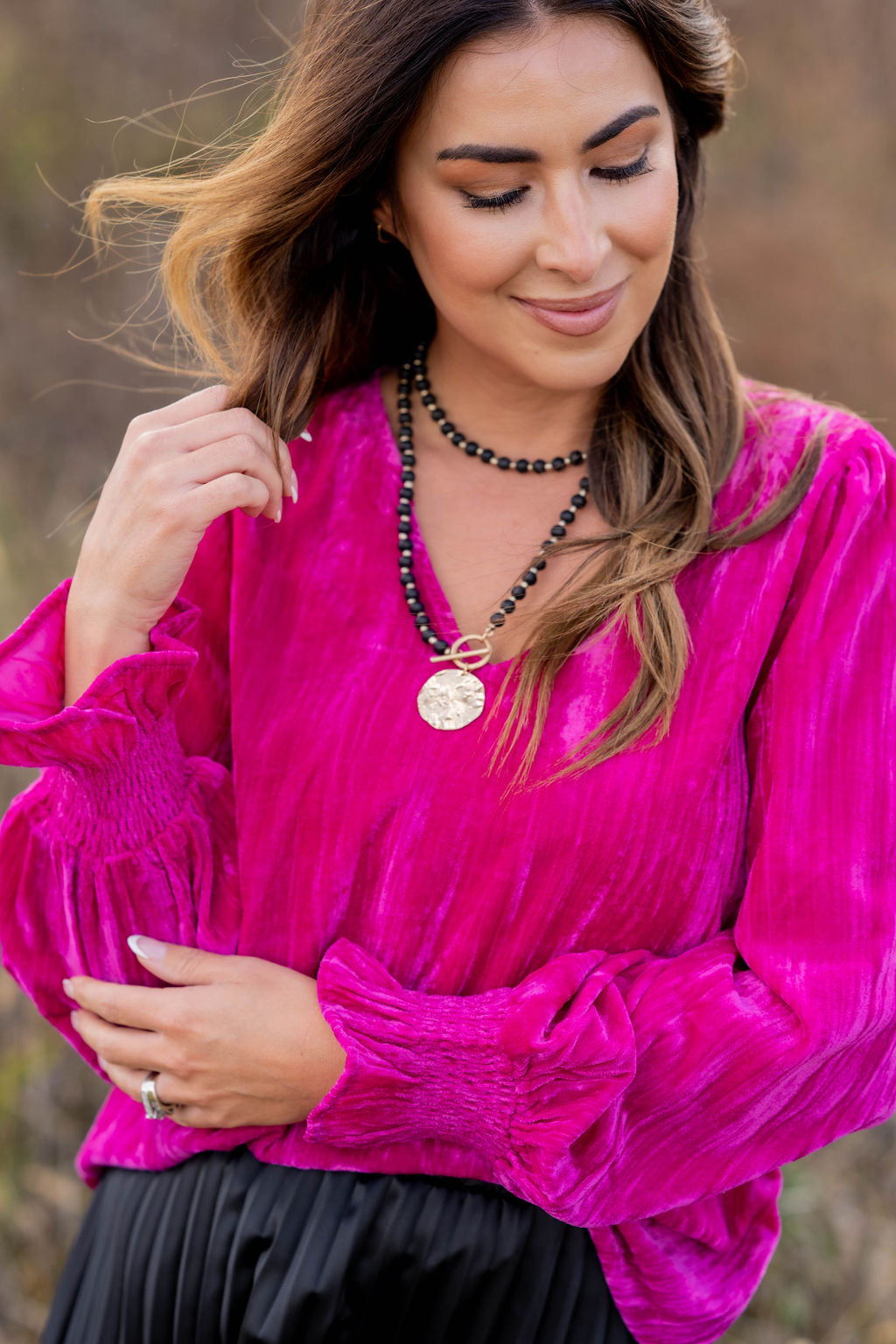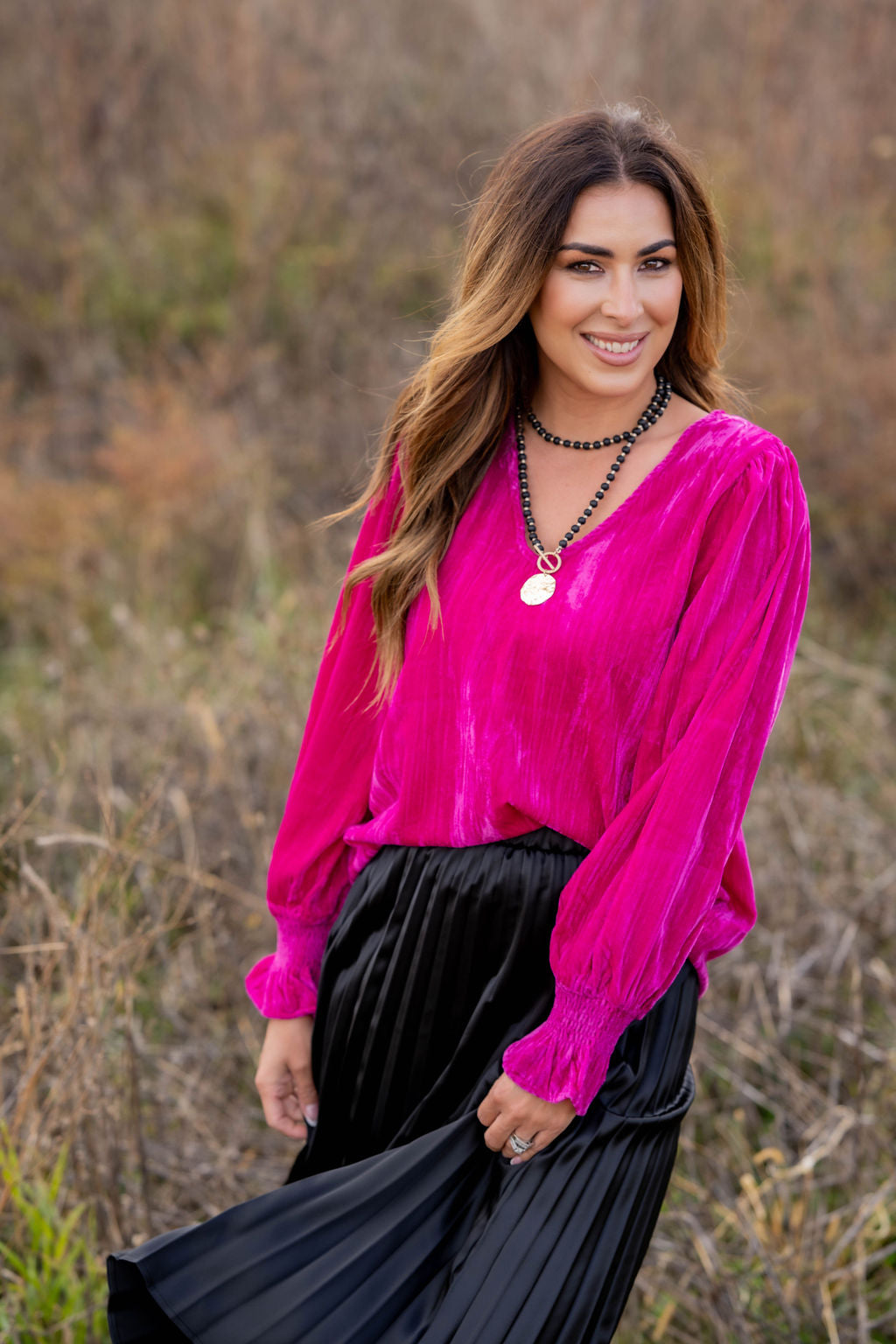 Stand out from the crowd in this one of a kind blouse! The velvety look will transform even the simplest of outfits! Tuck into a skirt, pair with your favorite denim, or add a bold-colored pair of our Betsey’s Jeggings! We love this for all of your holidays festivities. Just add your favorite accessories to make the look truly yours!