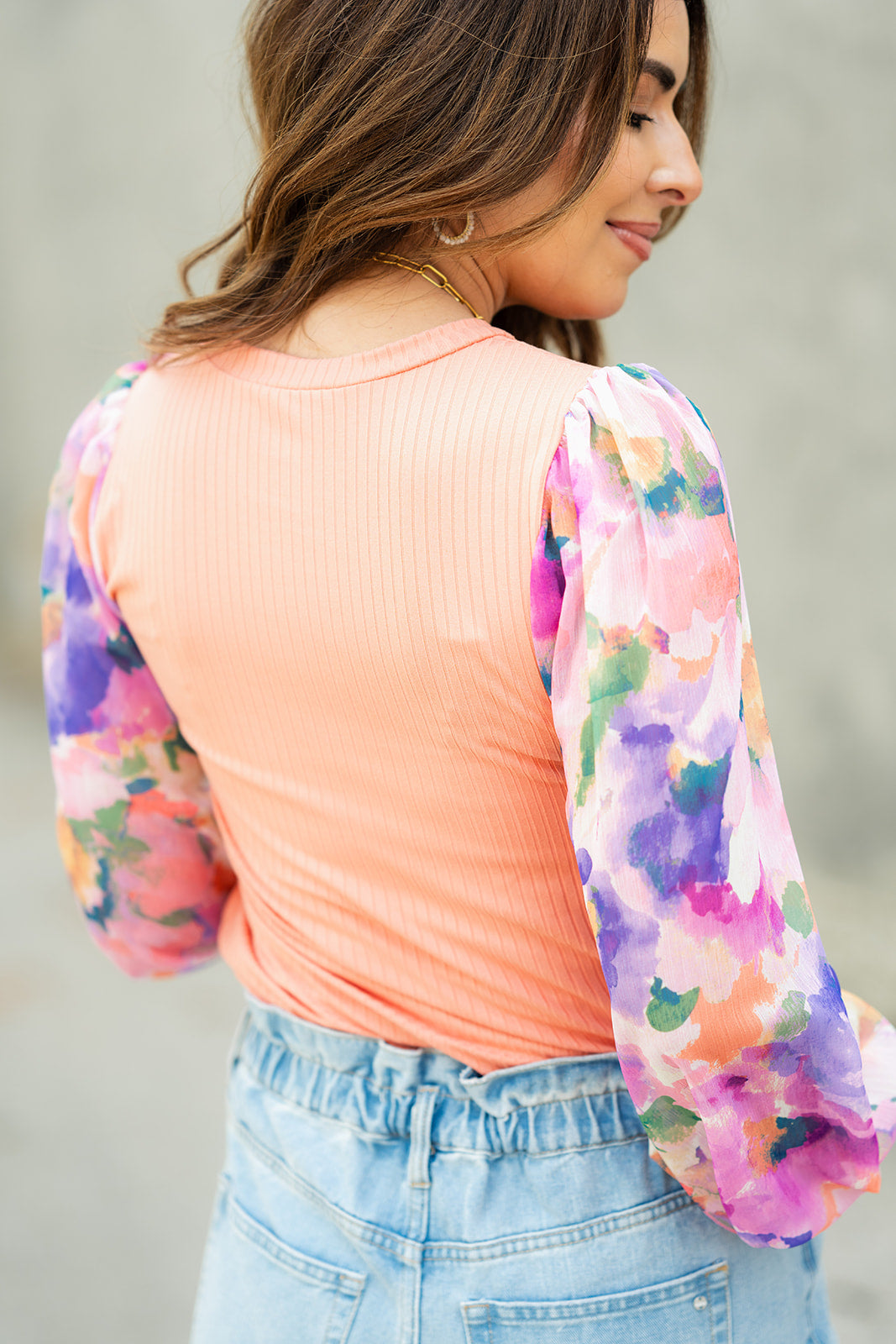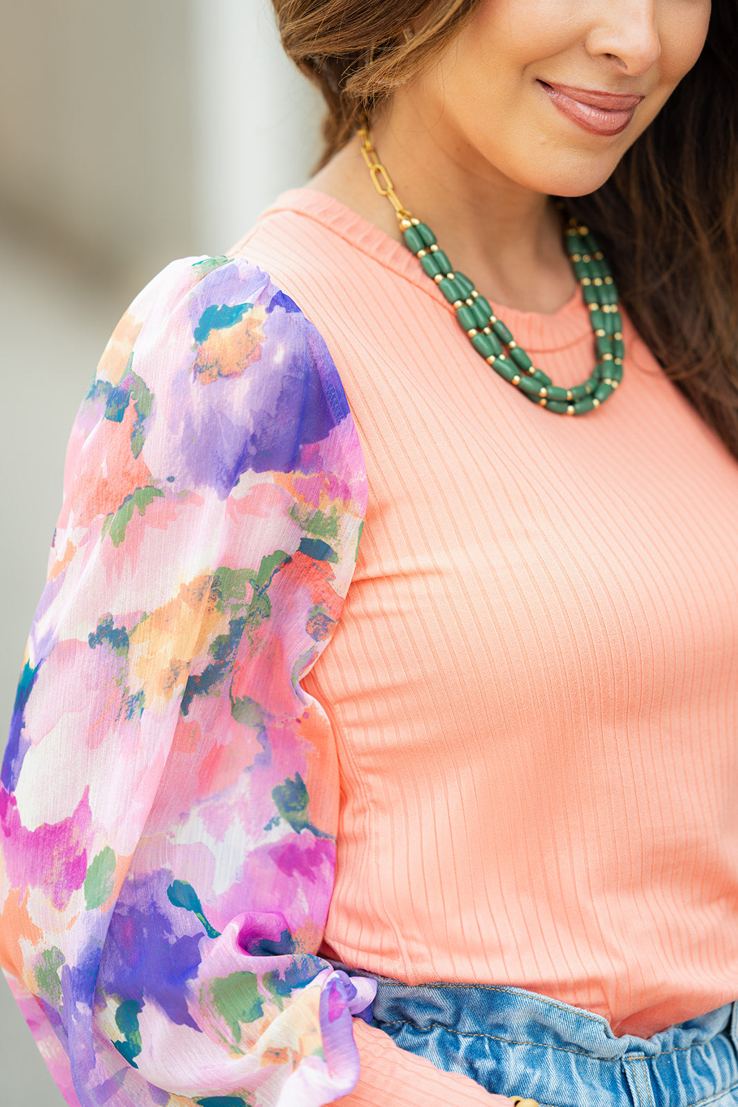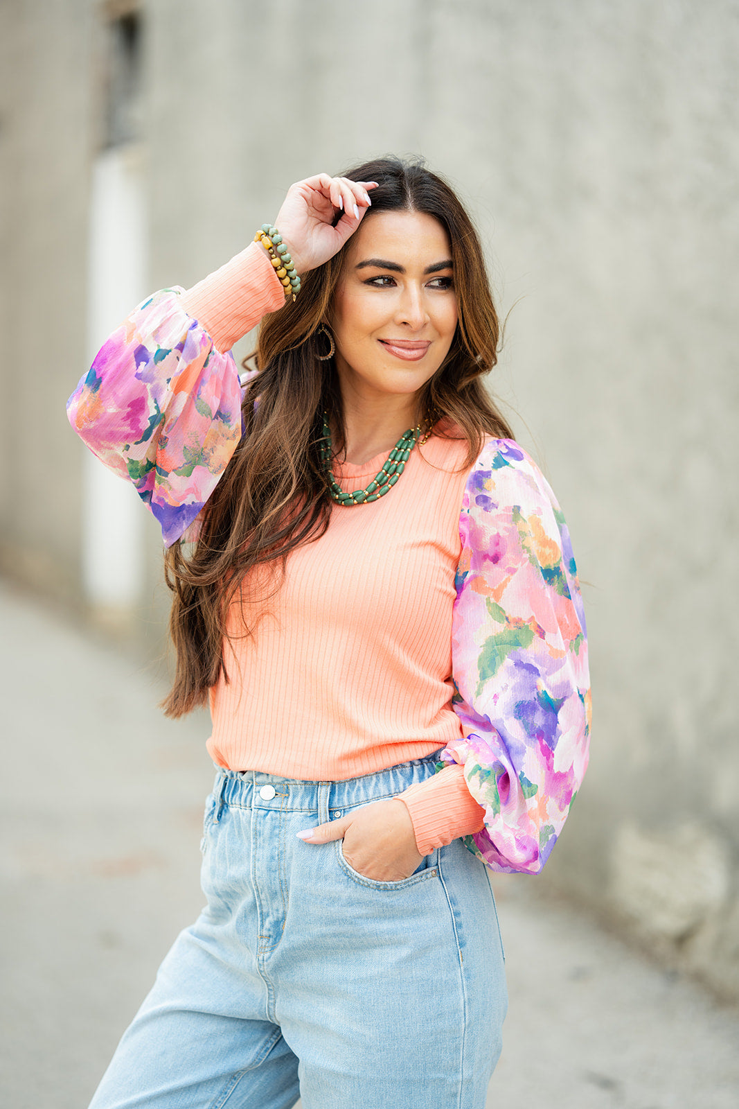 How cute is this blouse? With the stunning sheer floral print sleeves and the solid ribbed body, this is a piece that you can dress up or down, depending on what you want! The solid cuffed detailing on the sleeves and bold colors elevate this top. It also looks great with a cardigan, vest, blazer, or jacket over it!