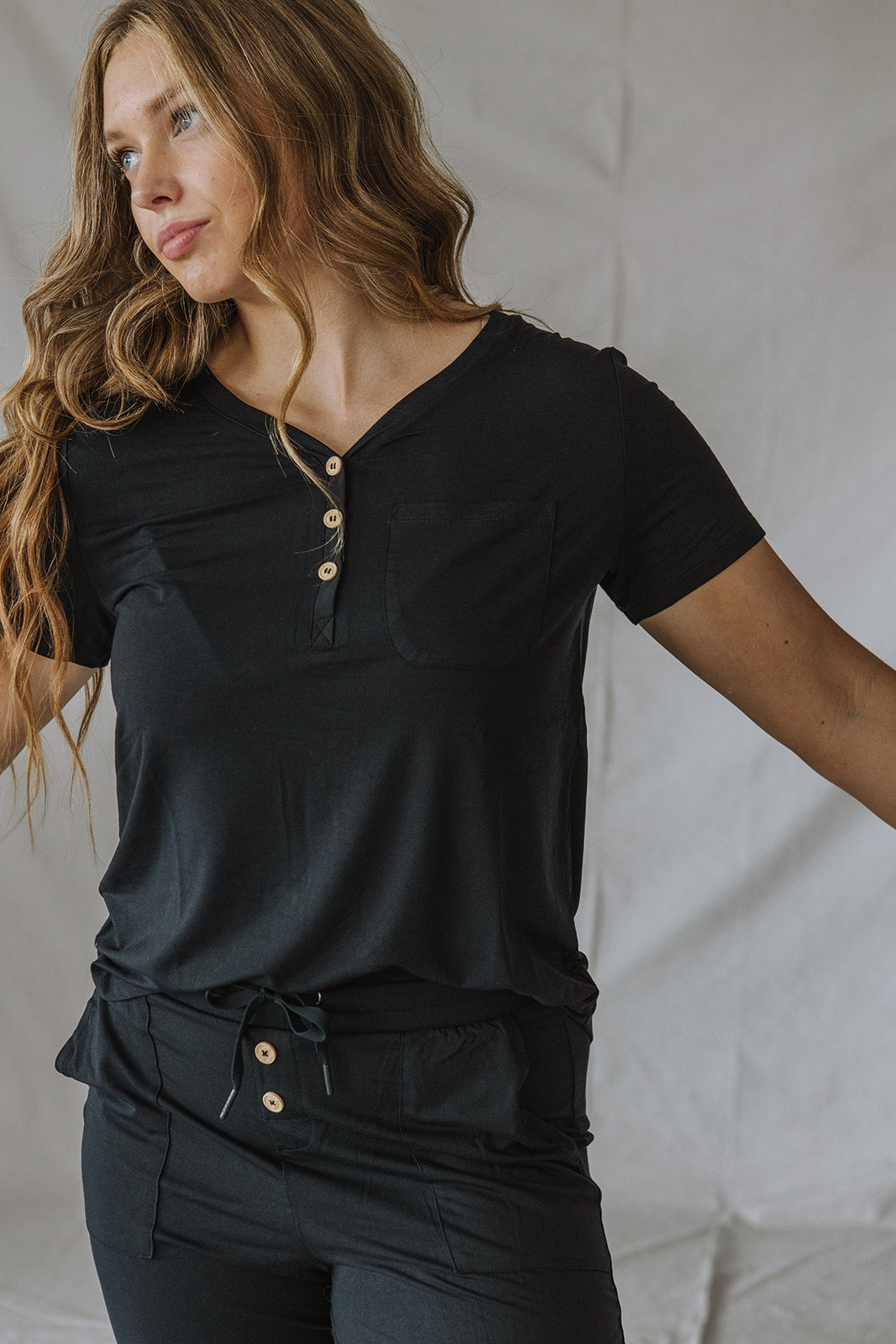Introducing the LATEst addition to our dreamy collection: the soft and stylish Henley Set. This set has all the comfort of our classic style, with added details that make it truly stand out. Featuring a soft V-neck, buttoned Henley top, and relaxed-fit pants with a tapered ankle, it’s crafted from the same buttery-soft modal you know and love. Whether you're lounging at home or stepping out for errands, this set offers the perfect blend of comfort and style.