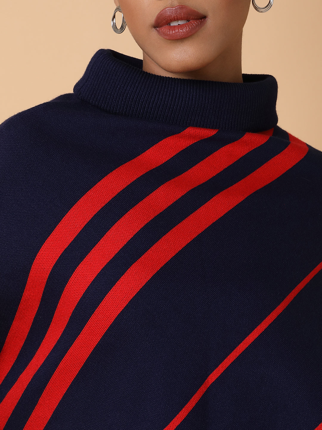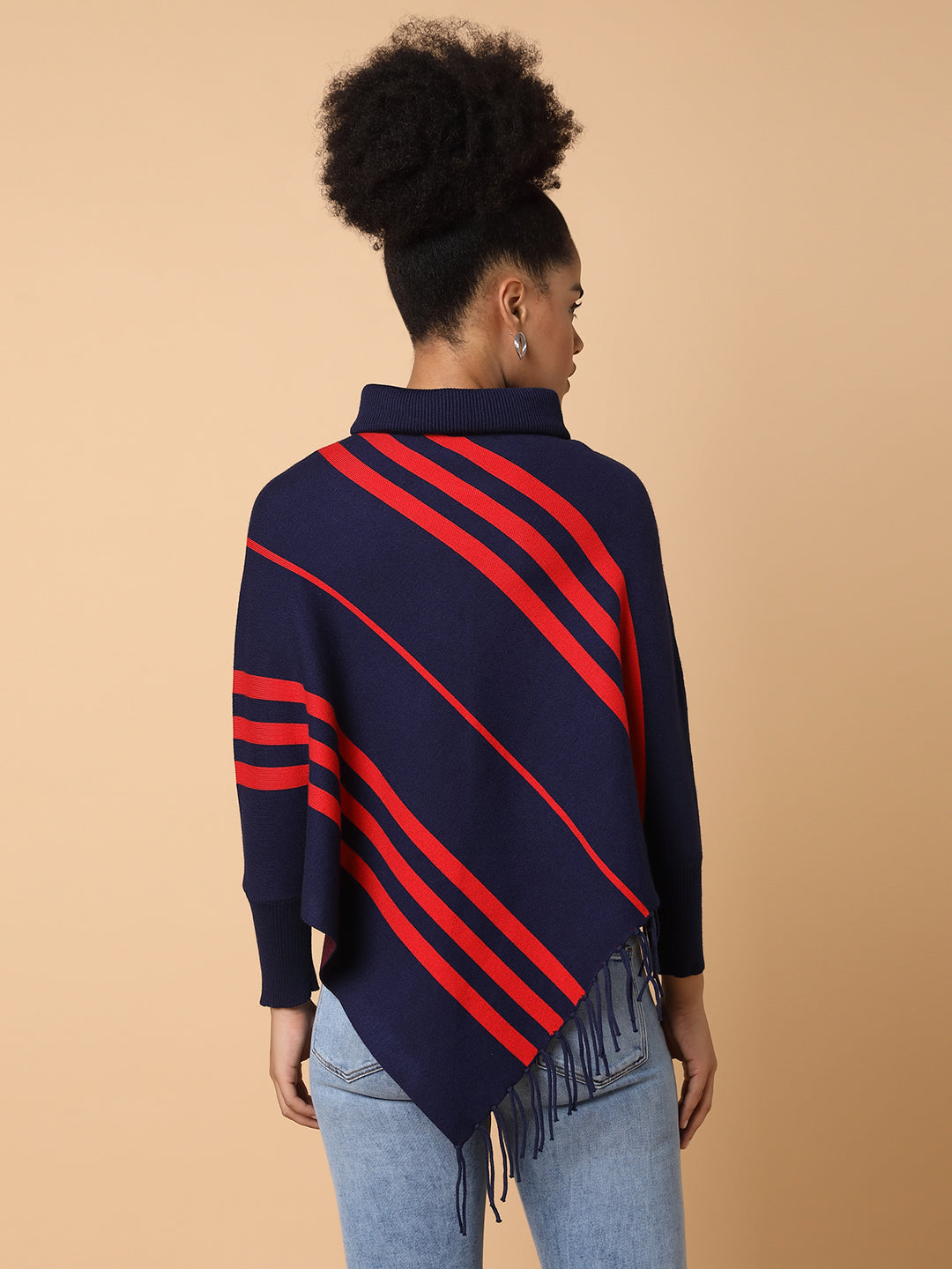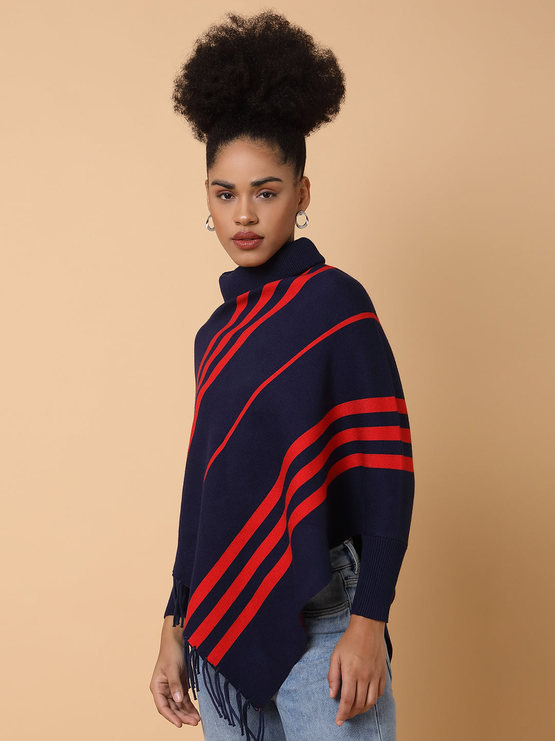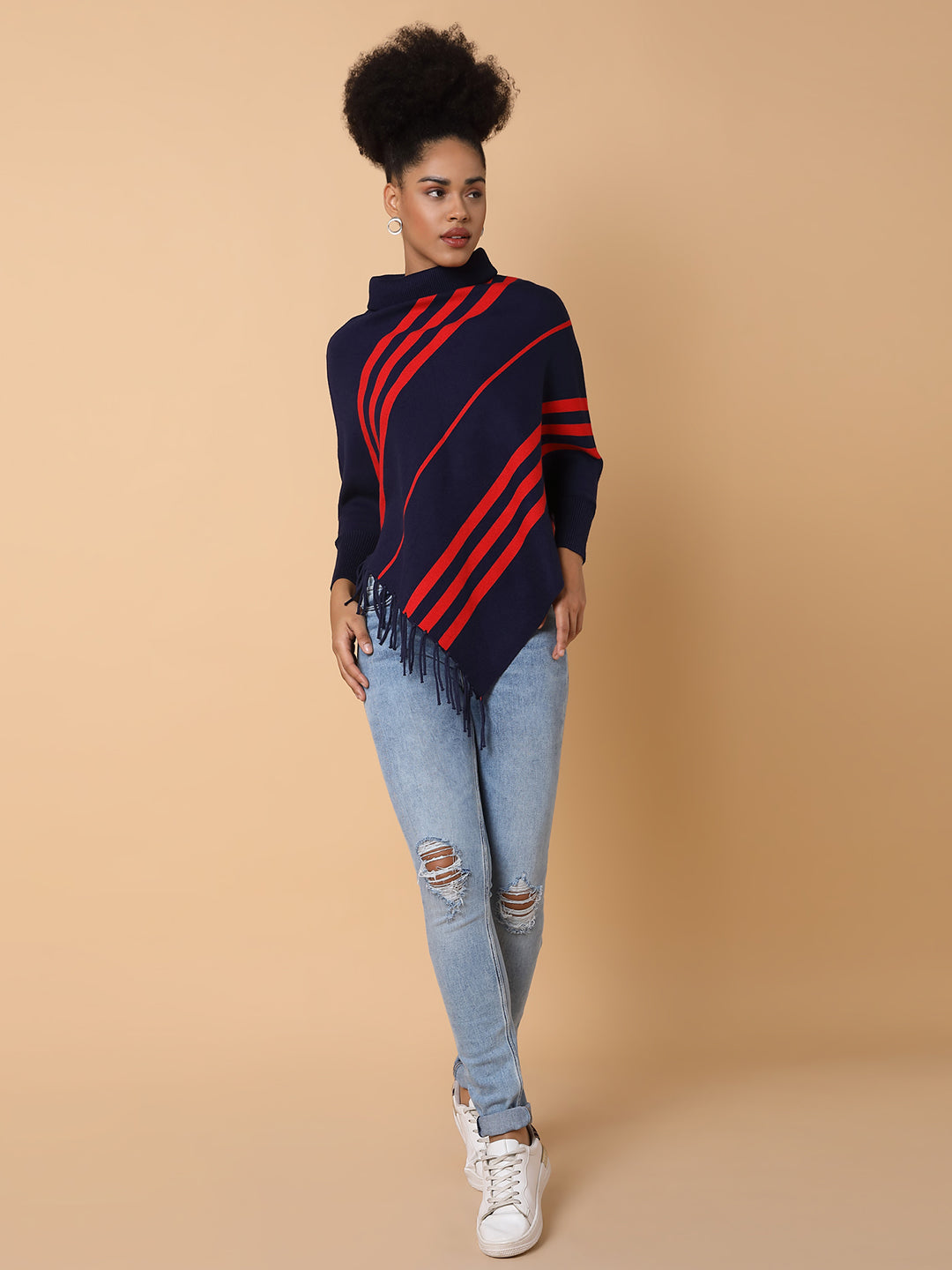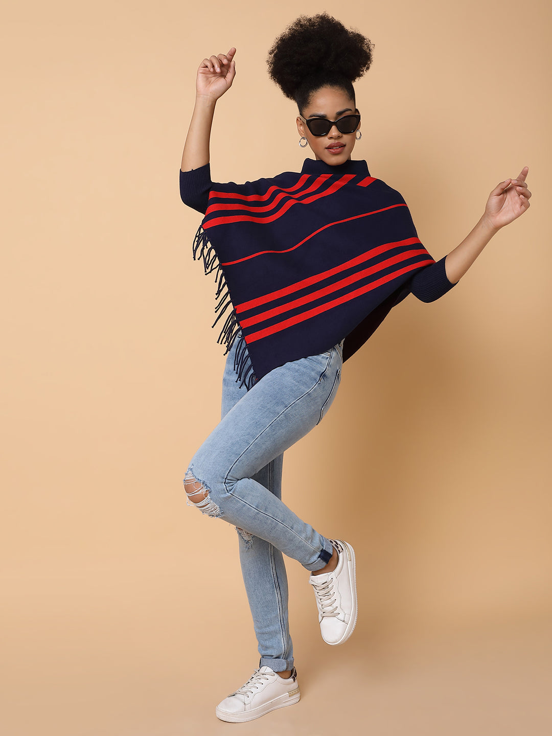 Experience effortless style and comfort with our Women Striped Navy Blue Poncho. Perfect for layering, this versatile piece adds a chic touch to any outfit while keeping you cozy.