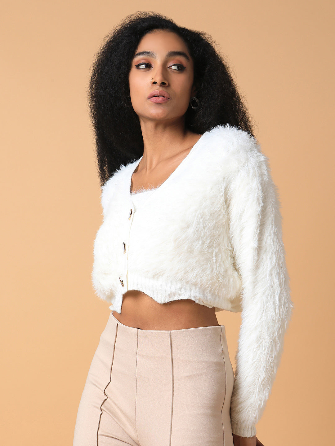 Elevate your wardrobe with our Women Solid Cream Crop Cardigan with Inner Slip. This stylish and versatile piece is perfect for layering, adding a touch of elegance to any outfit while providing comfort and warmth.