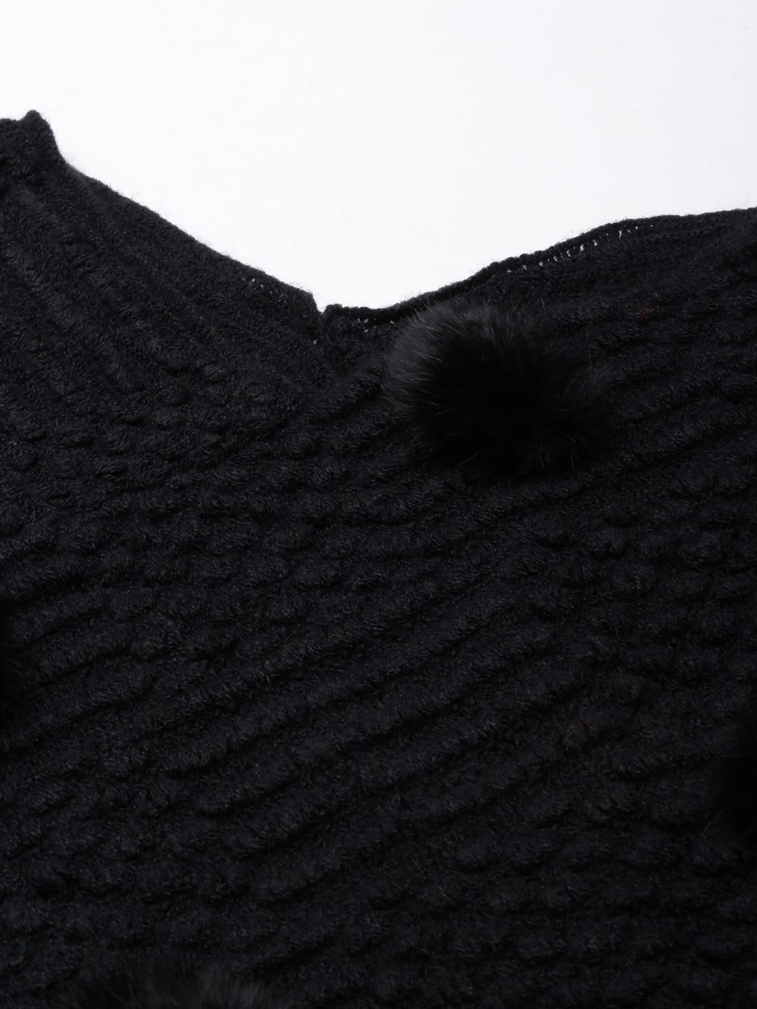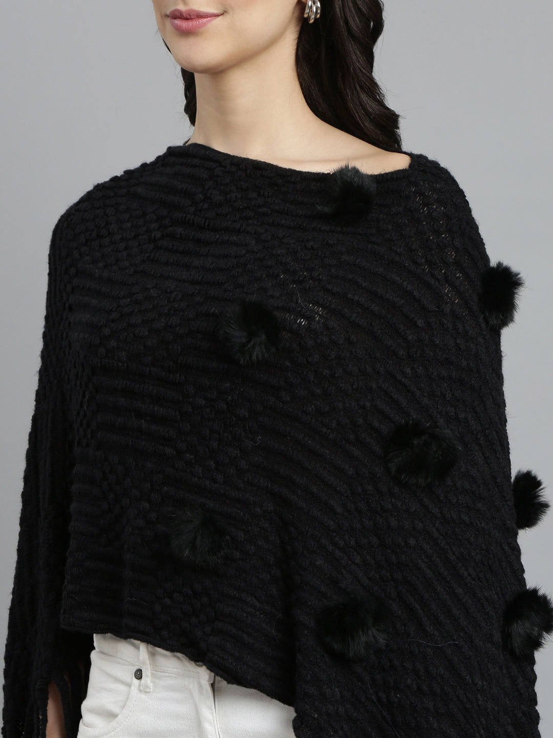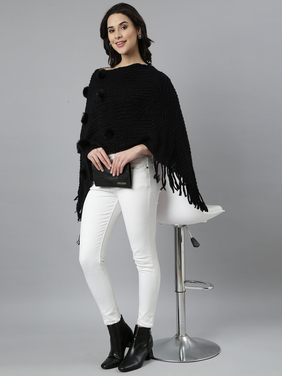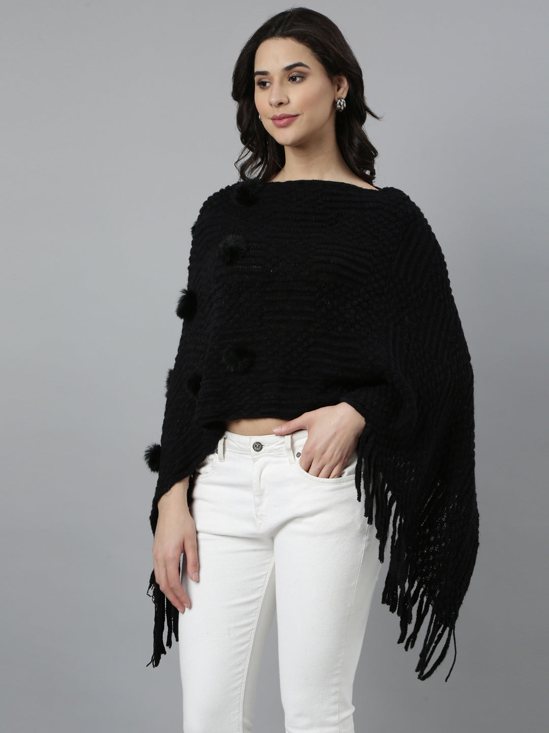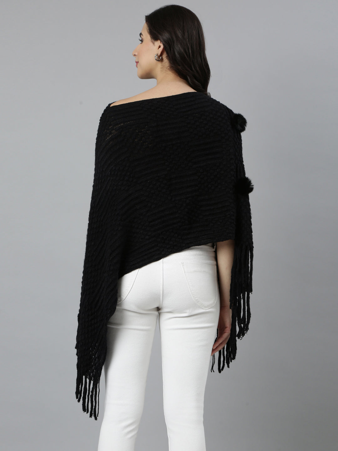 Elevate your style with our Women Self Design Longline Black Poncho, a versatile addition to any wardrobe. This chic poncho combines comfort and elegance, making it perfect for both casual outings and special occasions.
