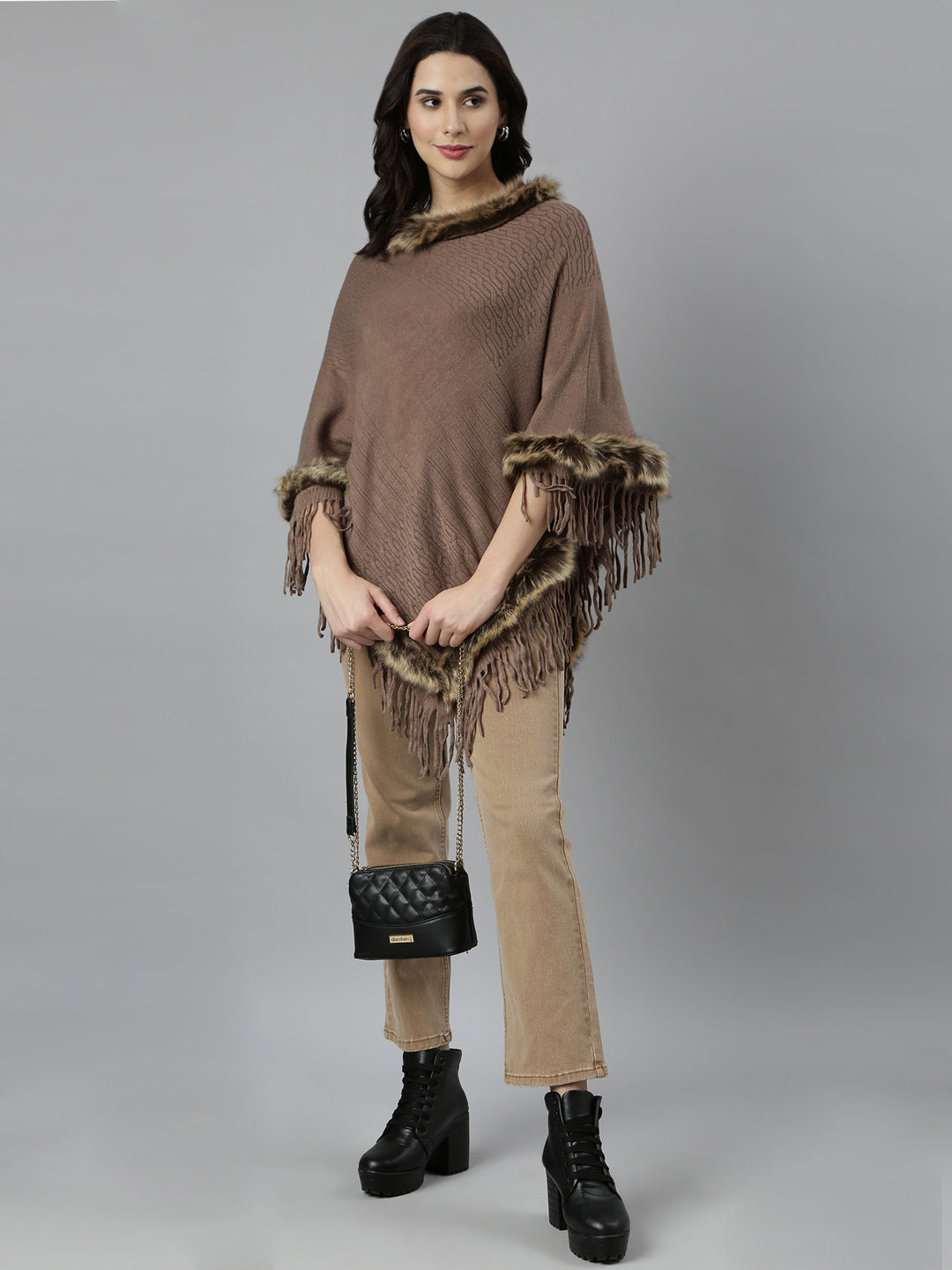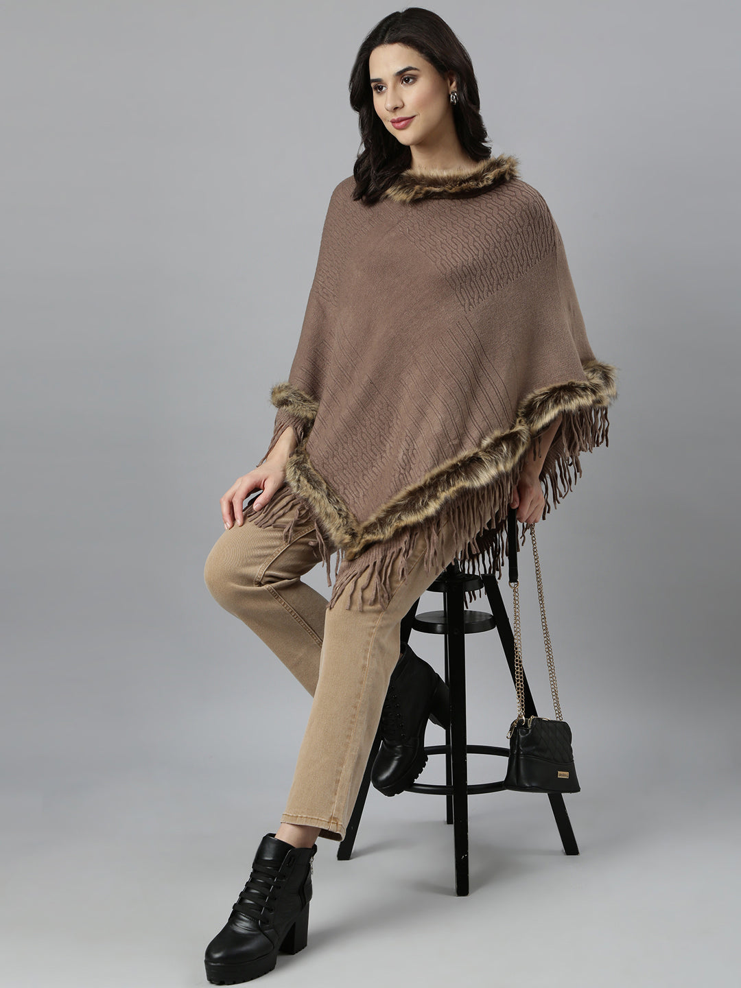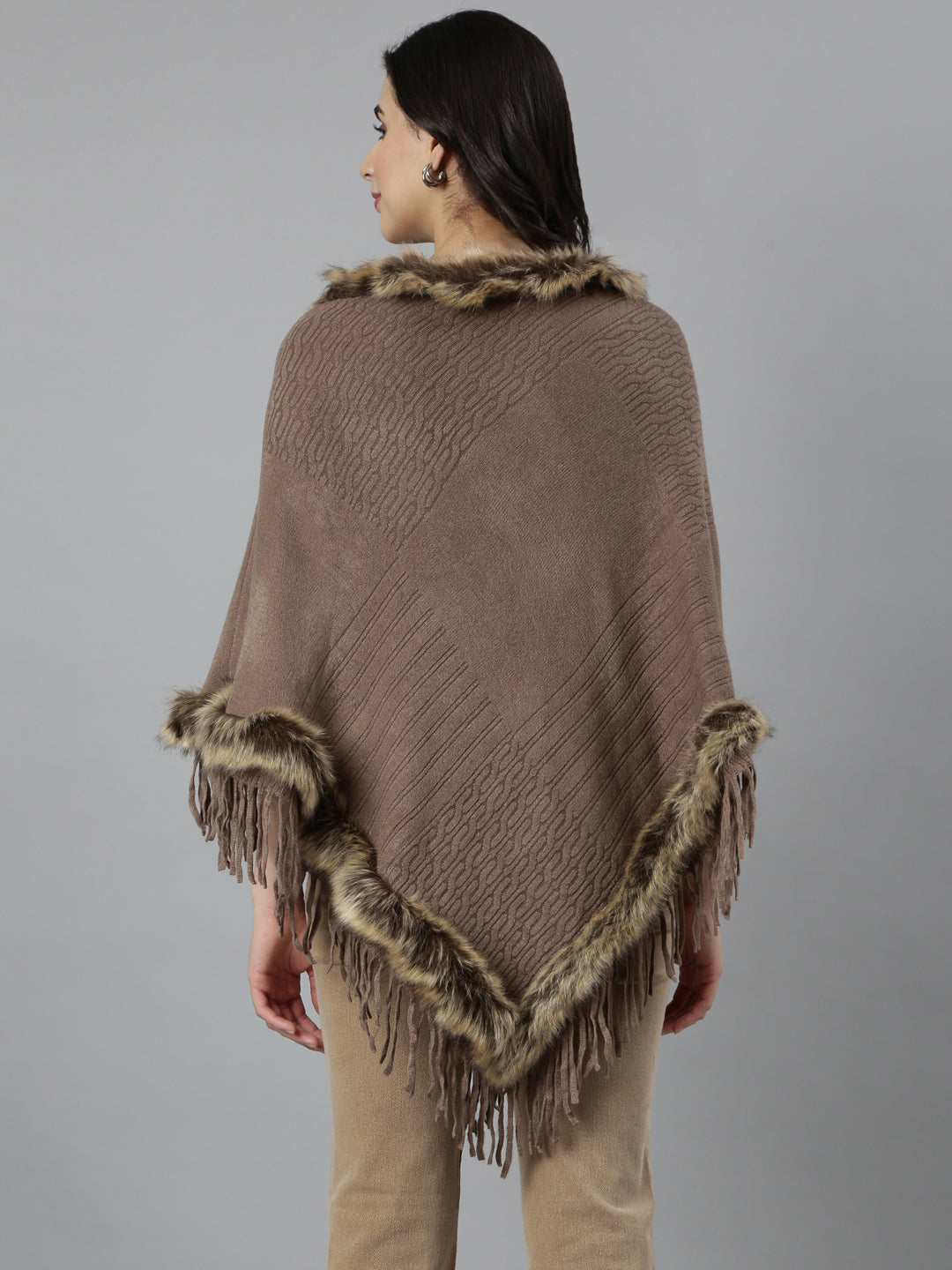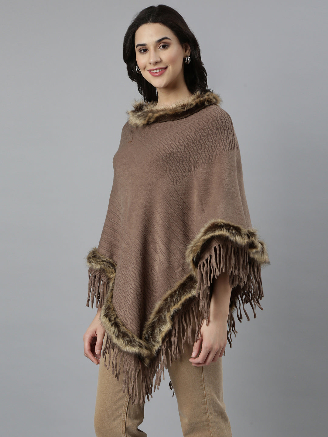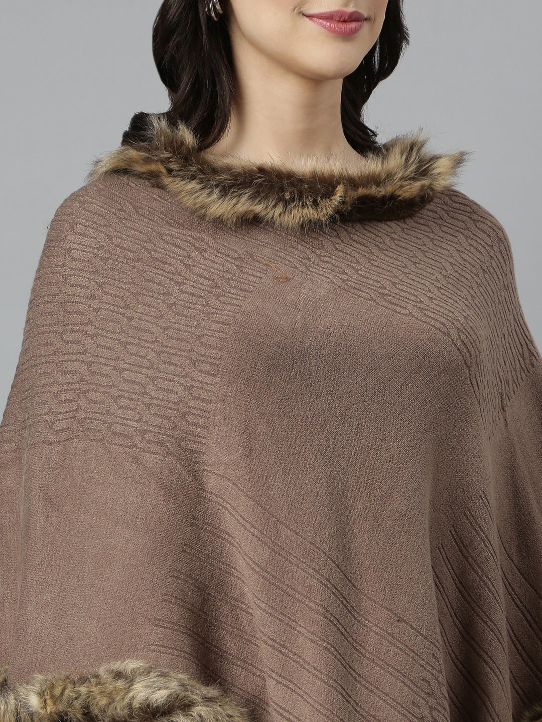 Experience elegance and warmth with our Women Self Design Longline Brown Poncho, a versatile addition to your wardrobe that seamlessly combines style and comfort.