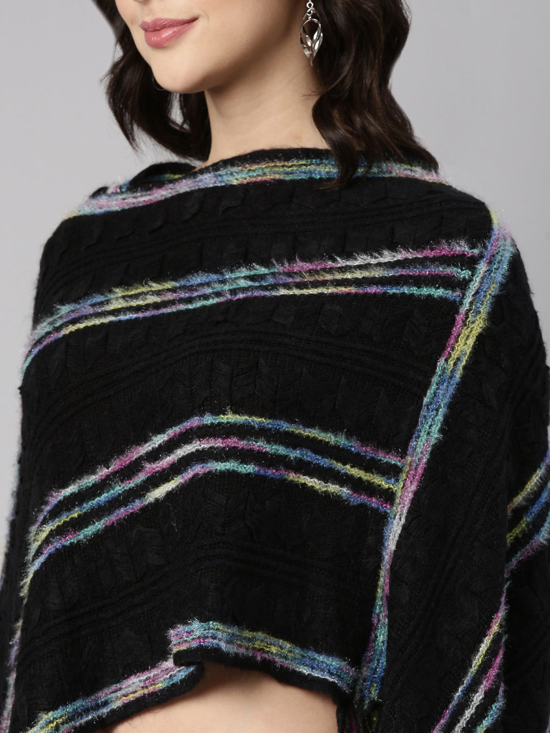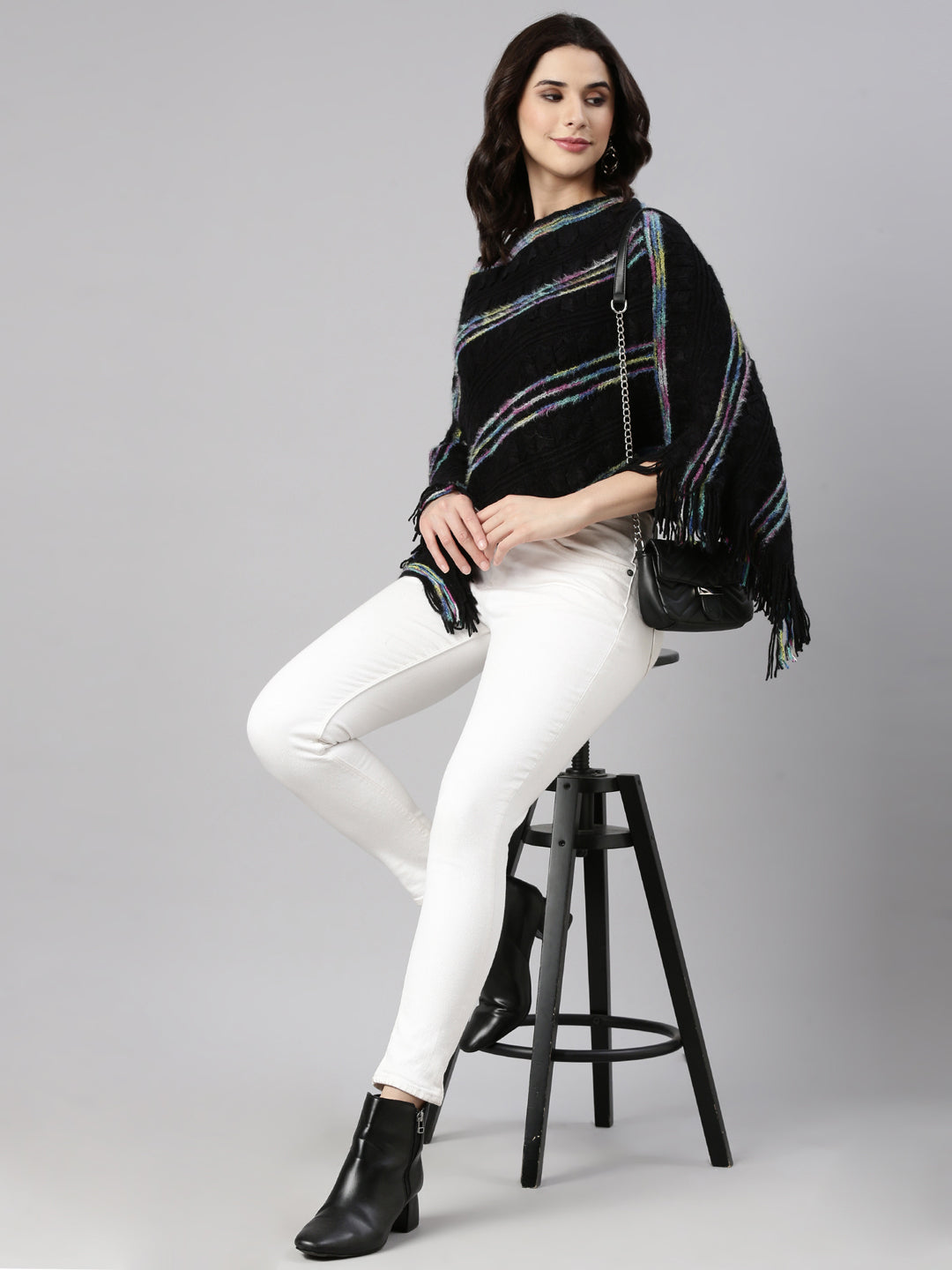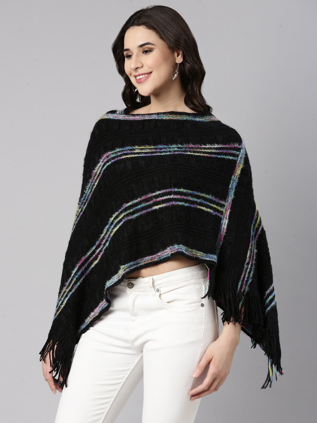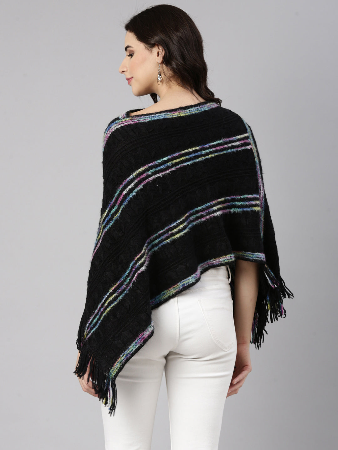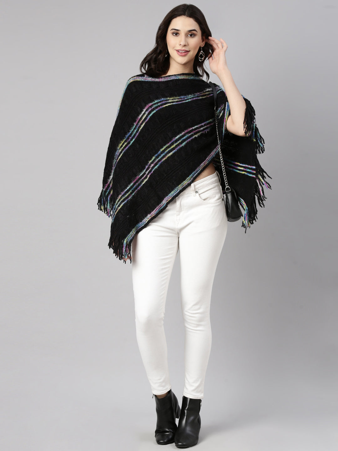 This Women Striped Black Poncho is not just a fashion statement; it��s a functional piece that enhances your wardrobe with its versatility. Perfect for transitioning seasons, it can be paired with jeans, skirts, or dresses for a stylish layered look.