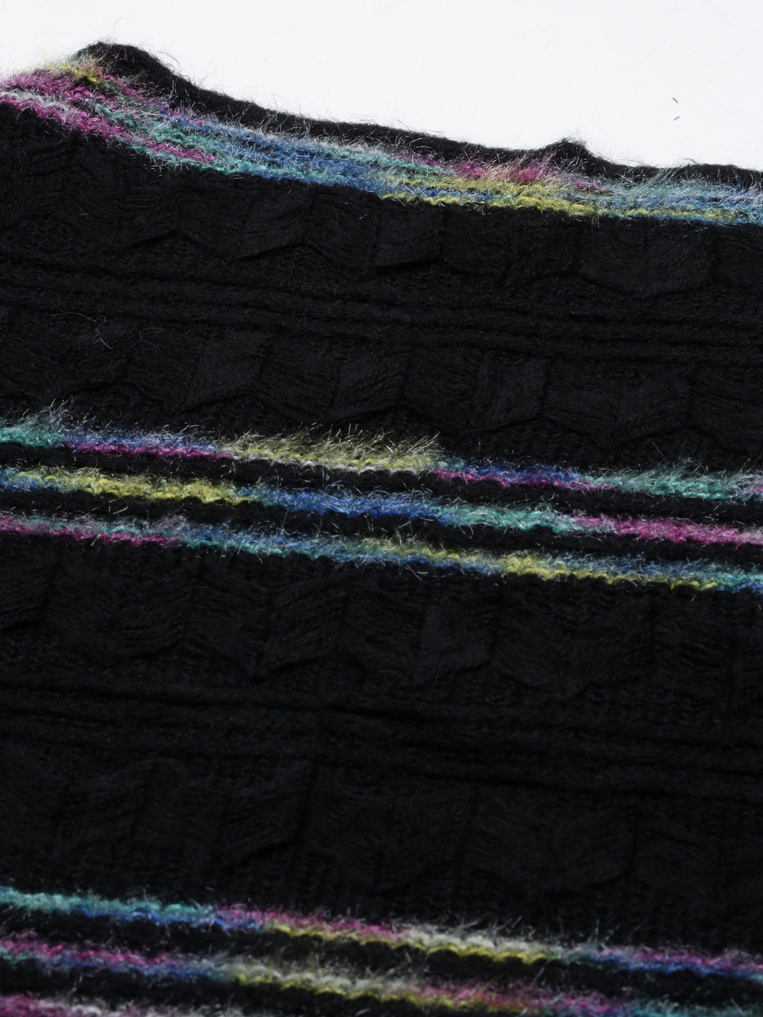 Elevate your style with the Women Striped Black Poncho, a versatile piece that combines comfort and fashion effortlessly. Perfect for layering, this poncho offers a chic look while keeping you warm.